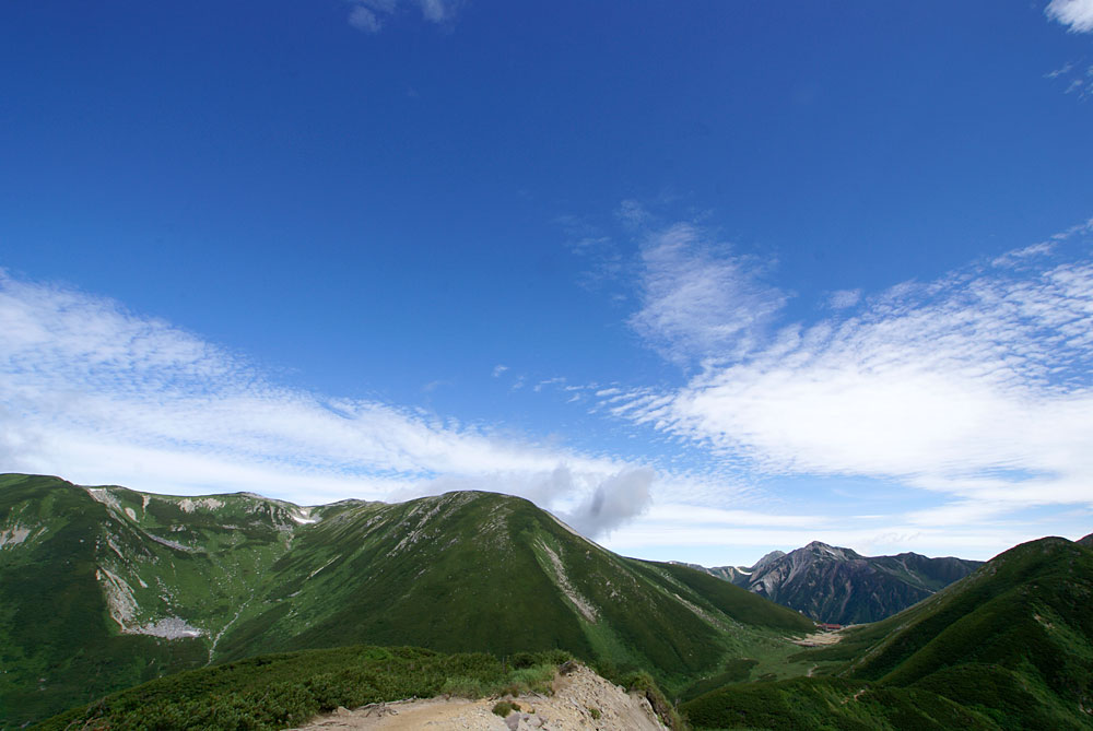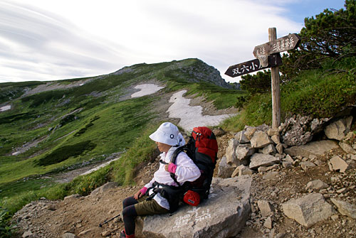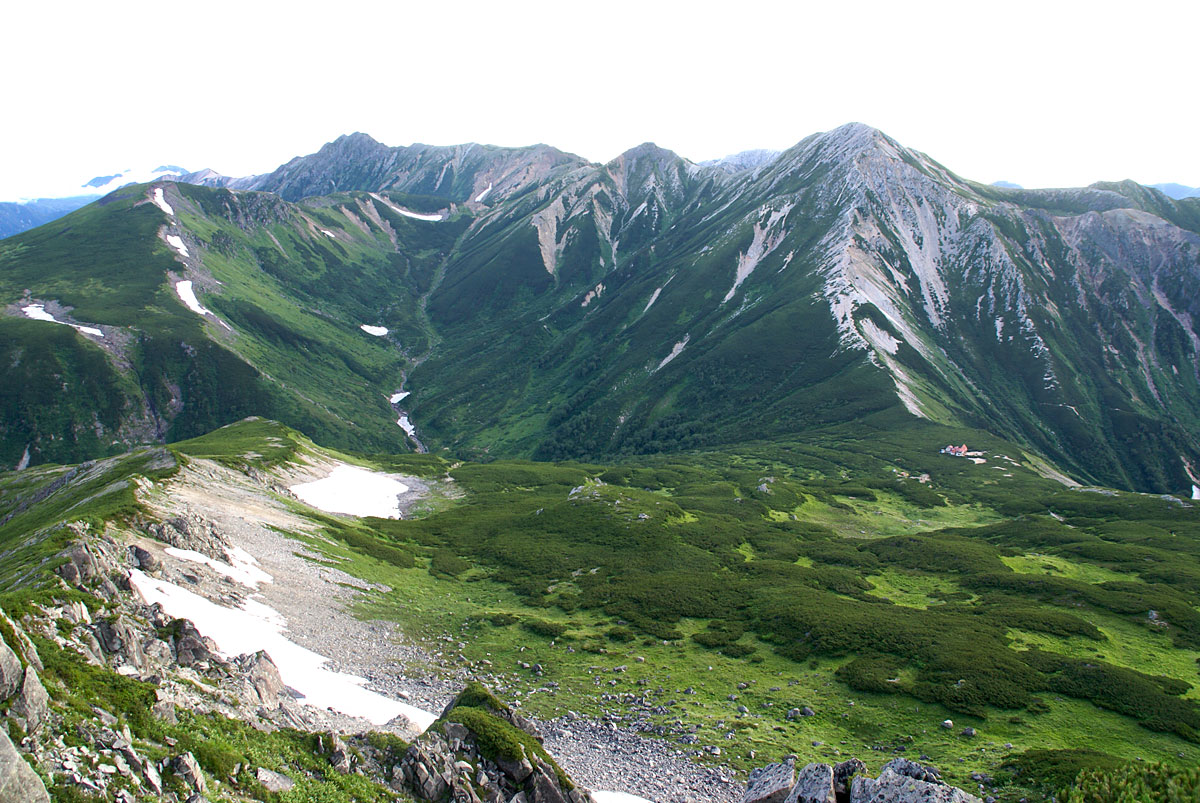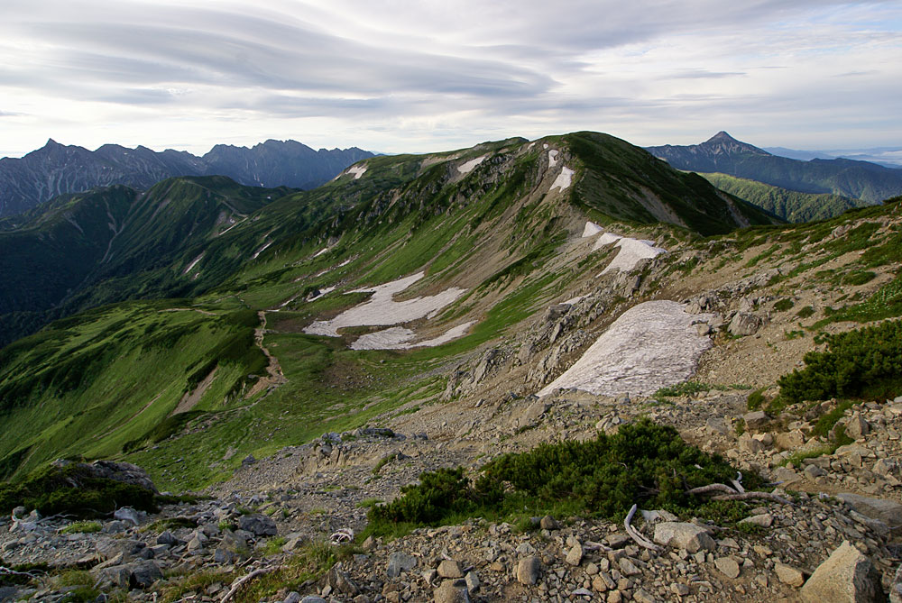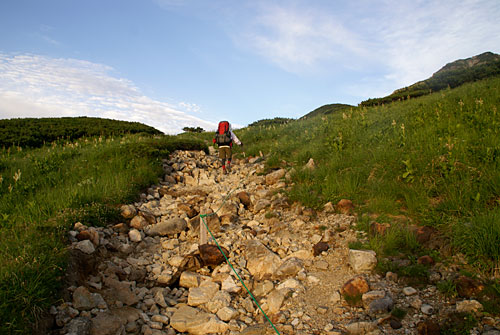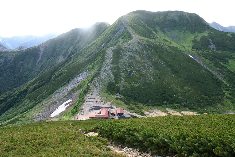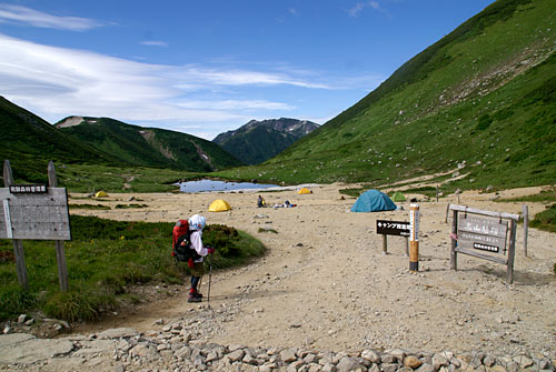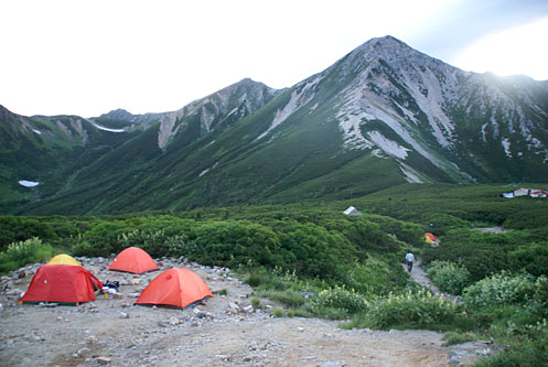 ■黒部源流の山旅(北アルプス)2007年8月14日-17日 No.419 隊長、うさぎ | 14日 | 15日 | 16日 | 17日 | 花1 | 花2 | 2時半くらいから出発の準備をするグループがいたが、もう少し休むことにする。気がつくと4時を少し過ぎたところだった。少し風が出てきたようで、テントに露がついていないのがありがたい。まずはコーヒーを飲んで目を覚ます。簡単に朝食の準備を済ませ、テントを撤収し出発の準備をする。本日は三俣のテントサイトから新穂高温泉まで、17kmの長い距離を歩かなければならない。4日間の中で最もな長い距離になるが、コースの大半が下りとなるので、時間的にも体力的にもゆとりがある。 テントサイトを後にしてまずは、三俣蓮華岳の肩まで登り返さなければならない。4日目ともなると食料も消費されているので、ザックの荷が軽くなってきているのがうれしい。何度も源流域の山々を振り返りながら登ること約40分、三俣蓮華岳の肩の分岐へ到着した。ここからは多少のアップダウンはあるものの、巻き道を通れば最短時間(約1時間40分)で双六小屋までたどり着くことができる。稜線コースを取れば、巻道コースに比べると多少の時間はかかるが、天気もよいので展望も期待できる。二日目にこの稜線は歩いているが、何度歩いても飽きないコースだ。結果として稜線コースを選択した。 肩から15分ほどで三俣蓮華の山頂についた。途中、丸山への登りがあるが、それほど苦労しなくてもいい。早朝の清々しさがなんとも気持ちよい。またまた知らぬ間に丸山のピークを通過し中道に分岐に至る。ここで一休み。ここからは時間短縮のために、双六の山頂を踏まずに中道のコースをたどる。雪渓が多く残り、周辺はお花畑になっている。双六小屋の水源地を見送るとすぐに、双六岳への登山道と合流する。急坂を下ると双六小屋だ。 双六小屋で一息入れる。水晶小屋のTシャツは4000円とかなり割高だったが、ここのダクロンのTシャツは手ごろな値段だったので、うさぎが記念に購入した。登山者が出発したあとのテントサイトは閑散としていた。 谷の斜面を緩やかに登り稜線に立つ。ガスも無く展望はよい。槍ヶ岳から伸びる西鎌尾根や北鎌尾根、南岳へと伸びる稜線が一望できる。足元の花を見逃せない。アルプスの雰囲気をじっくりとかみ締めながら稜線を歩く。休み休み歩いたが、約1時間20分ほどで弓折分岐に到着した。小休止後、ぐんぐんと下って鏡平小屋に到着。迷わずに冷やしうどんを注文した。フリーズド食品が4日も続き辟易としていただけに、実に美味しかった。 途中秩父沢で休憩し、一気にわさび平小屋まで下る。名物の「そうめん」を注文する。りんごも美味しそうだったので、これもいただく。ここからは単調は林道歩きが1時間ほど続く。登山口が近づくにつれて気温も上がってきているが、下り坂なので比較的歩きやすい。