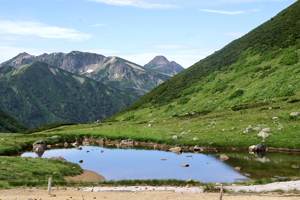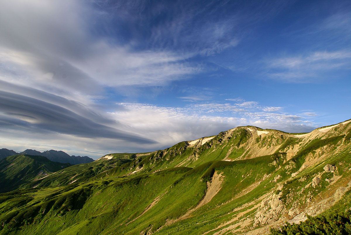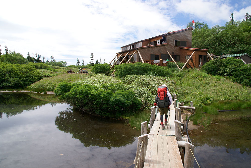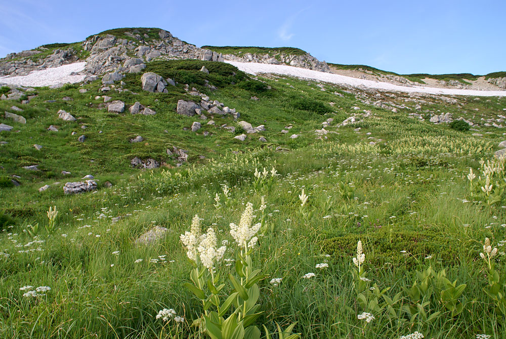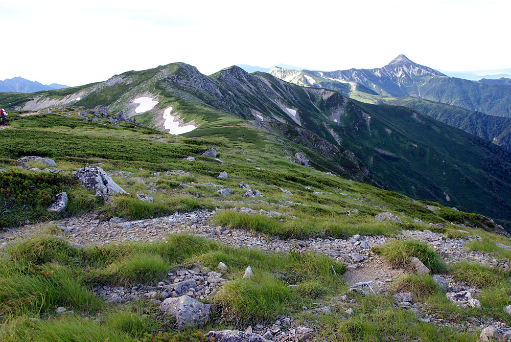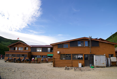 ■黒部源流の山旅(北アルプス)2007年8月14日-17日 No.419 隊長、うさぎ | 14日 | 15日 | 16日 | 17日 | 花1 | 花2 | 2時半くらいから出発の準備をするグループがいたが、もう少し休むことにする。気がつくと4時を少し過ぎたところだった。少し風が出てきたようで、テントに露がついていないのがありがたい。まずはコーヒーを飲んで目を覚ます。簡単に朝食の準備を済ませ、テントを撤収し出発の準備をする。本日は三俣のテントサイトから新穂高温泉まで、17kmの長い距離を歩かなければならない。4日間の中で最もな長い距離になるが、コースの大半が下りとなるので、時間的にも体力的にもゆとりがある。 テントサイトを後にしてまずは、三俣蓮華岳の肩まで登り返さなければならない。4日目ともなると食料も消費されているので、ザックの荷が軽くなってきているのがうれしい。何度も源流域の山々を振り返りながら登ること約40分、三俣蓮華岳の肩の分岐へ到着した。ここからは多少のアップダウンはあるものの、巻き道を通れば最短時間(約1時間40分)で双六小屋までたどり着くことができる。稜線コースを取れば、巻道コースに比べると多少の時間はかかるが、天気もよいので展望も期待できる。二日目にこの稜線は歩いているが、何度歩いても飽きないコースだ。結果として稜線コースを選択した。 肩から15分ほどで三俣蓮華の山頂についた。途中、丸山への登りがあるが、それほど苦労しなくてもいい。早朝の清々しさがなんとも気持ちよい。またまた知らぬ間に丸山のピークを通過し中道に分岐に至る。ここで一休み。ここからは時間短縮のために、双六の山頂を踏まずに中道のコースをたどる。雪渓が多く残り、周辺はお花畑になっている。双六小屋の水源地を見送るとすぐに、双六岳への登山道と合流する。急坂を下ると双六小屋だ。 双六小屋で一息入れる。水晶小屋のTシャツは4000円とかなり割高だったが、ここのダクロンのTシャツは手ごろな値段だったので、うさぎが記念に購入した。登山者が出発したあとのテントサイトは閑散としていた。 谷の斜面を緩やかに登り稜線に立つ。ガスも無く展望はよい。槍ヶ岳から伸びる西鎌尾根や北鎌尾根、南岳へと伸びる稜線が一望できる。足元の花を見逃せない。アルプスの雰囲気をじっくりとかみ締めながら稜線を歩く。休み休み歩いたが、約1時間20分ほどで弓折分岐に到着した。小休止後、ぐんぐんと下って鏡平小屋に到着。迷わずに冷やしうどんを注文した。フリーズド食品が4日も続き辟易としていただけに、実に美味しかった。 途中秩父沢で休憩し、一気にわさび平小屋まで下る。名物の「そうめん」を注文する。りんごも美味しそうだったので、これもいただく。ここからは単調は林道歩きが1時間ほど続く。登山口が近づくにつれて気温も上がってきているが、下り坂なので比較的歩きやすい。