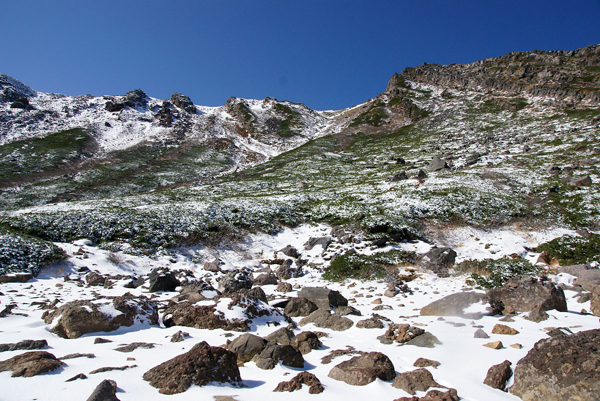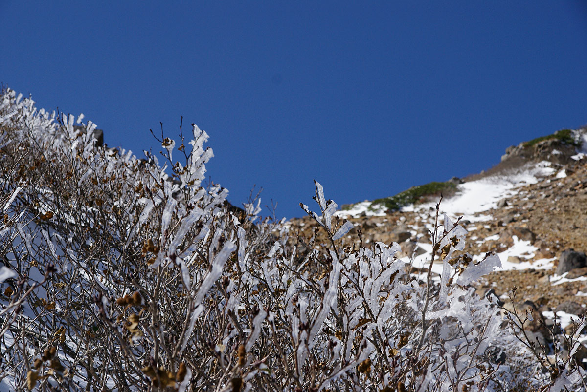 ■御嶽山(黒沢道)2007年10月21日 No.426 じんじんさん、隊長 ・・・・・・・・・・・・・・・・・・・・・・・・・・・・・・・・・・・ | part1 | part2 | part3 | part4 | このコースはハイマツ帯の斜面を縫っている。何本かの谷の横断があり、日蔭は降り積もった雪が凍結していて、不用意に足を下ろすとスリップするので要注意だ。紅葉の見どころは沢沿いのダケカンバのようだが、すでに葉はすべて落ちている。上部に行くほど傾斜が増し、桟橋の階段を上ると三の池避難小屋は近い。 8合目分岐から約2時間で三の池避難小屋に到着した。小屋裏で風を避け小休止。カメラを持って三の池の撮影に出かける。この時期は水位が低いようで、昨年の夏に見た池と少し形が違うようだ。小高い丘から見下ろすが風が強くてよろめいてしまう。 池の畔に降りてみる。小さな社があり、竜が祭られていた。撮影やら小休止で30分ほどすごしたあと、ハイマツ帯の岩場を摩利支天乗越めざして登る。標高が3000m近くなってきているので、急坂を登ると息苦しい。これをしのぐと犀の河原に出る。ここまで来ると乗越は近い。摩利支天の山頂はさらにここから20分かかるが、雪のために足場が悪く、時間にもそれほどゆとりがないので、ここで折り返すことにする。乗越のピークからは、三の池や五の池を見下ろすことができるが、風が強くて長居はできなかった。昨年登った濁河のコースが一望できる。 | part1 | part2 | part3 | part4 |