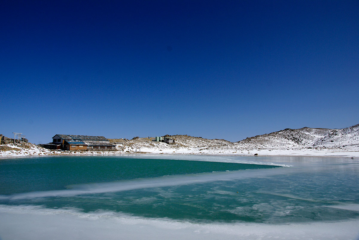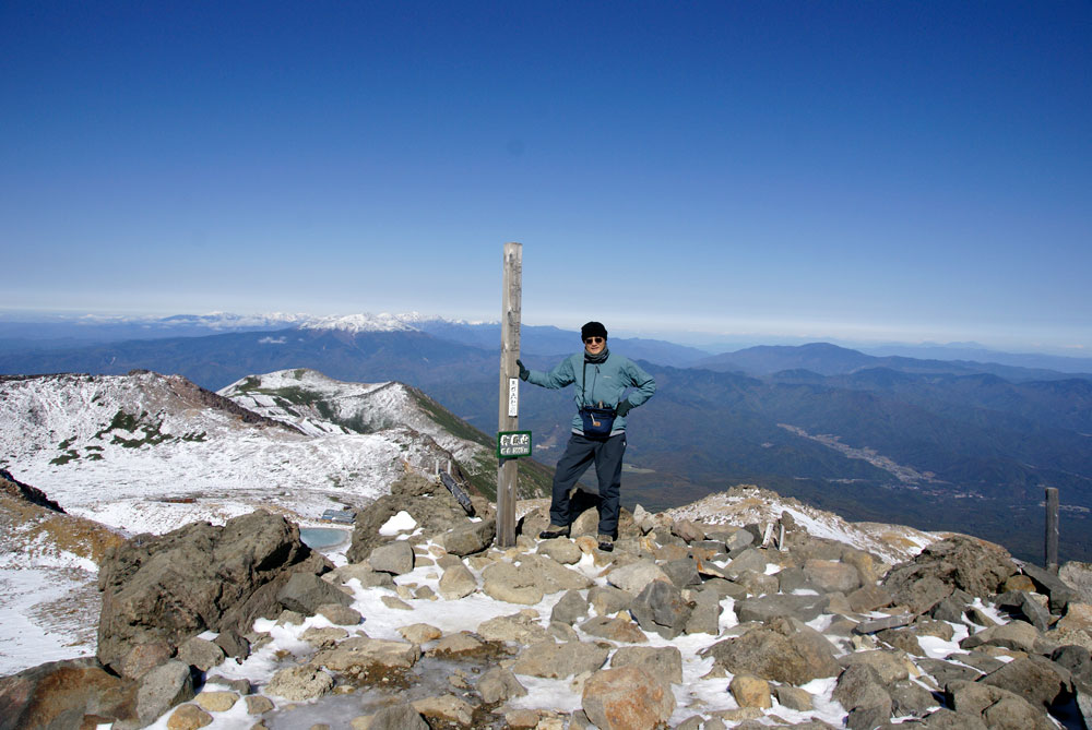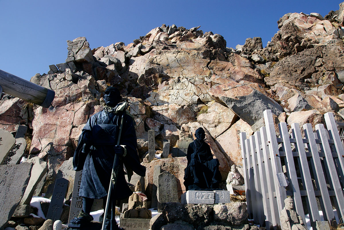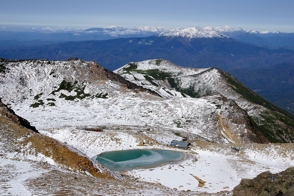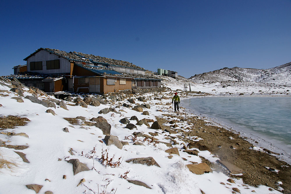 ■御嶽山(黒沢道)2007年10月21日 No.426 じんじんさん、隊長 ・・・・・・・・・・・・・・・・・・・・・・・・・・・・・・・・・・・ | part1 | part2 | part3 | part4 | 先ほどの小屋は二の池新館で、本館は二の池の畔にある。エメラルドグリーンの二の池は日本一高所にある高山湖で、先ほどのコバルトブルーの三の池は日本一深い高山湖だそうだ。湖面の半分以上は凍結しており、大きな石を投げ入れても割れないほどの氷だ。青空と光があるので被写体として申し分がなく。対岸まで歩いて池を眺めてみる。 ここまで来ると山頂は近い。他の原からのコースに合流し剣が峰の山頂をめざす。登山者によく踏まれた雪面は固めていてよく滑る。なんとかアイゼンなしで山頂までたどり着けた。山頂には小屋があり休憩できるようになっている。南西斜面をのぞき込むと昭和54年の噴火口が見え、今でも火山ガスを吹き出している。火山特有の硫化水素の臭いがあたりに立ちこめていた。 帰路は黒沢口コースを一直線に降る。右手には田原の駐車場が見えている。雪がついている9合目あたりまではスリップに注意が必要だった。休憩所はロープウェイの営業時間に合わせて開いているようだったが、観光客も少なく閑古鳥が飛んでいた。黙々と降り、約3時間で駐車場に戻った。 【御嶽山メモ】 | part1 | part2 | part3 | part4 |