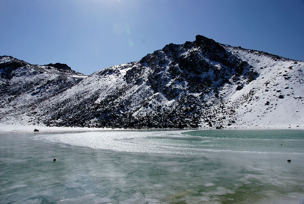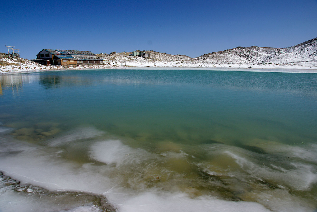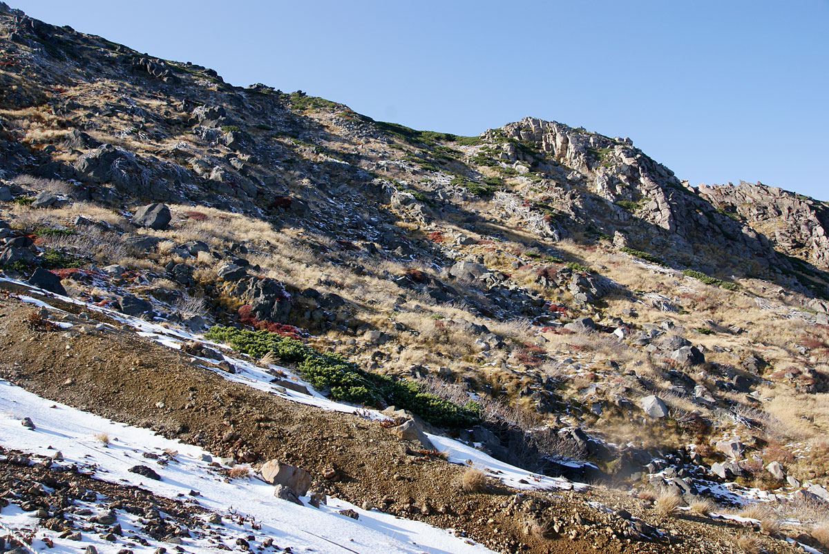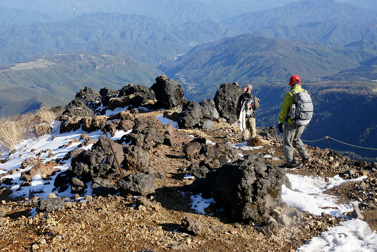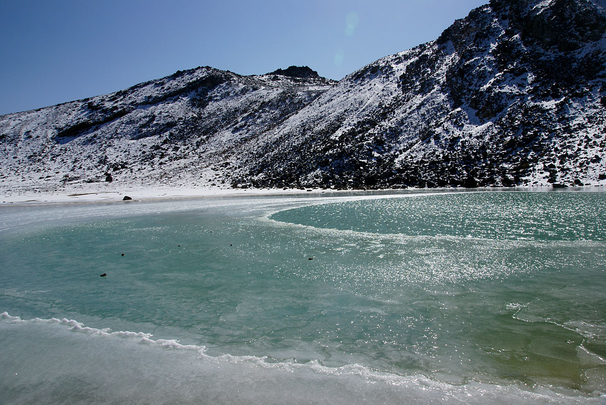 ■御嶽山(黒沢道)2007年10月21日 No.426 じんじんさん、隊長 ・・・・・・・・・・・・・・・・・・・・・・・・・・・・・・・・・・・ | part1 | part2 | part3 | part4 | 先ほどの小屋は二の池新館で、本館は二の池の畔にある。エメラルドグリーンの二の池は日本一高所にある高山湖で、先ほどのコバルトブルーの三の池は日本一深い高山湖だそうだ。湖面の半分以上は凍結しており、大きな石を投げ入れても割れないほどの氷だ。青空と光があるので被写体として申し分がなく。対岸まで歩いて池を眺めてみる。 ここまで来ると山頂は近い。他の原からのコースに合流し剣が峰の山頂をめざす。登山者によく踏まれた雪面は固めていてよく滑る。なんとかアイゼンなしで山頂までたどり着けた。山頂には小屋があり休憩できるようになっている。南西斜面をのぞき込むと昭和54年の噴火口が見え、今でも火山ガスを吹き出している。火山特有の硫化水素の臭いがあたりに立ちこめていた。 帰路は黒沢口コースを一直線に降る。右手には田原の駐車場が見えている。雪がついている9合目あたりまではスリップに注意が必要だった。休憩所はロープウェイの営業時間に合わせて開いているようだったが、観光客も少なく閑古鳥が飛んでいた。黙々と降り、約3時間で駐車場に戻った。 【御嶽山メモ】 | part1 | part2 | part3 | part4 |