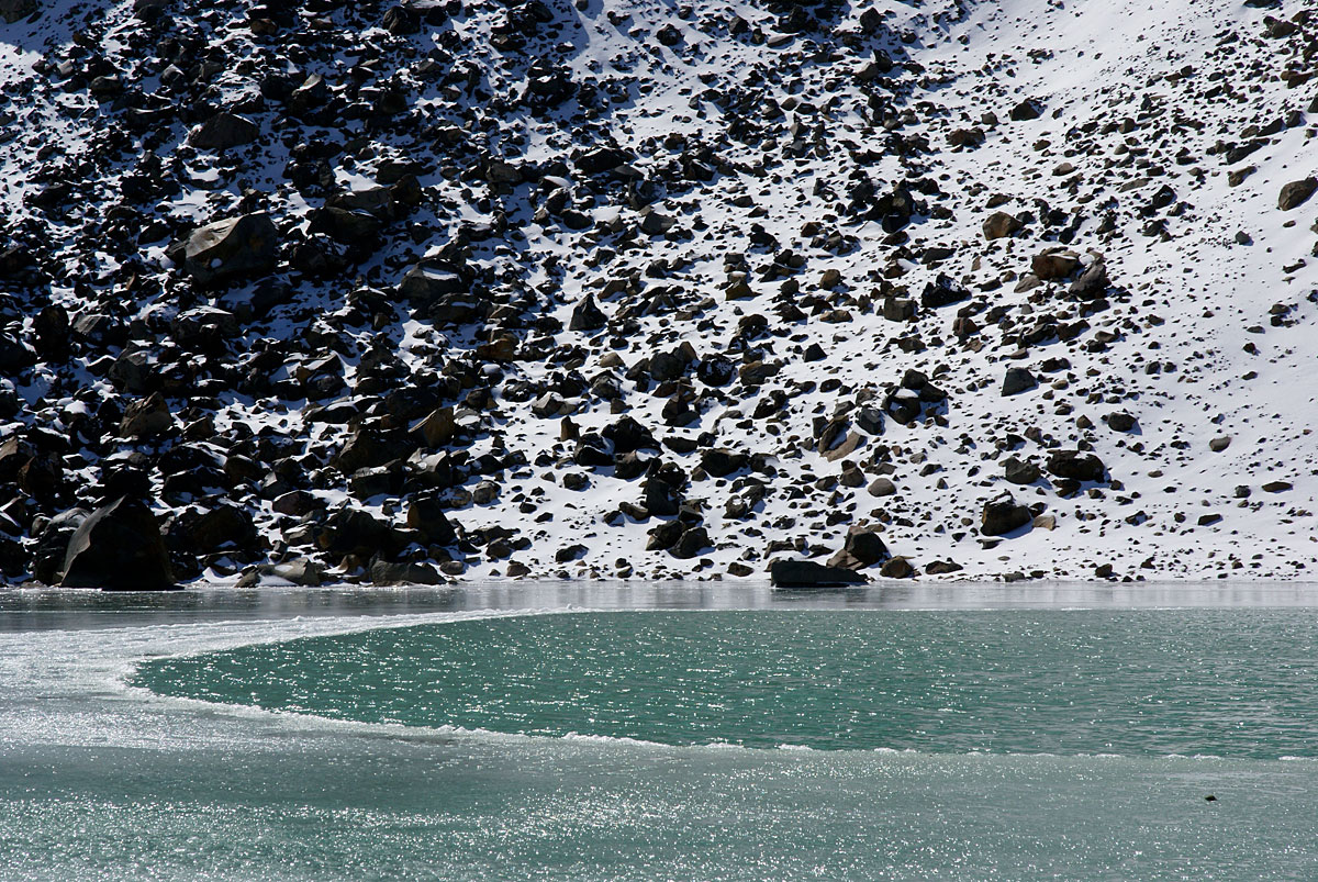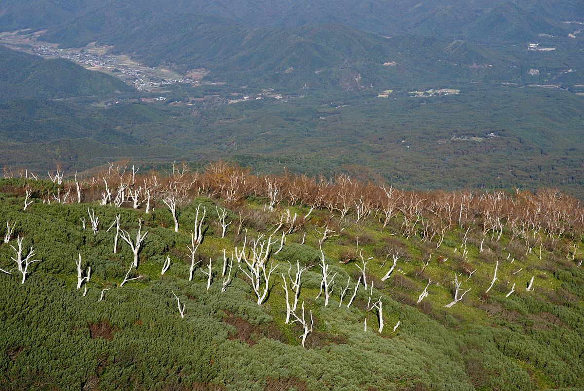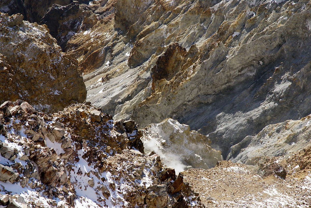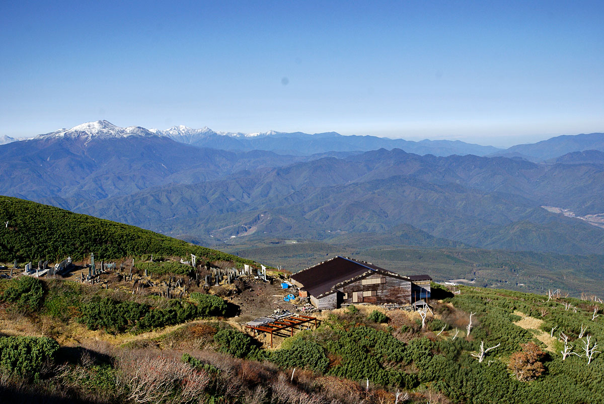 ■御嶽山(黒沢道)2007年10月21日 No.426 じんじんさん、隊長 ・・・・・・・・・・・・・・・・・・・・・・・・・・・・・・・・・・・ | part1 | part2 | part3 | part4 | 先ほどの小屋は二の池新館で、本館は二の池の畔にある。エメラルドグリーンの二の池は日本一高所にある高山湖で、先ほどのコバルトブルーの三の池は日本一深い高山湖だそうだ。湖面の半分以上は凍結しており、大きな石を投げ入れても割れないほどの氷だ。青空と光があるので被写体として申し分がなく。対岸まで歩いて池を眺めてみる。 ここまで来ると山頂は近い。他の原からのコースに合流し剣が峰の山頂をめざす。登山者によく踏まれた雪面は固めていてよく滑る。なんとかアイゼンなしで山頂までたどり着けた。山頂には小屋があり休憩できるようになっている。南西斜面をのぞき込むと昭和54年の噴火口が見え、今でも火山ガスを吹き出している。火山特有の硫化水素の臭いがあたりに立ちこめていた。 帰路は黒沢口コースを一直線に降る。右手には田原の駐車場が見えている。雪がついている9合目あたりまではスリップに注意が必要だった。休憩所はロープウェイの営業時間に合わせて開いているようだったが、観光客も少なく閑古鳥が飛んでいた。黙々と降り、約3時間で駐車場に戻った。 【御嶽山メモ】 | part1 | part2 | part3 | part4 |