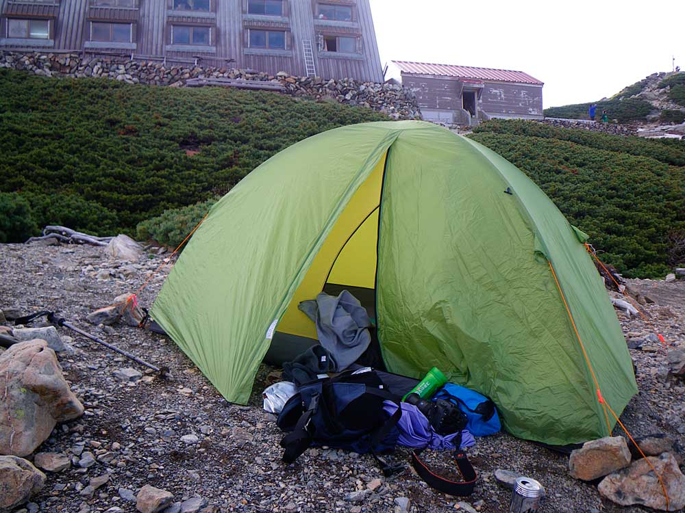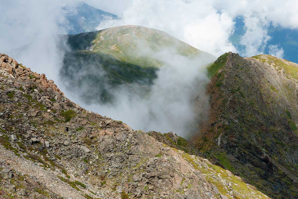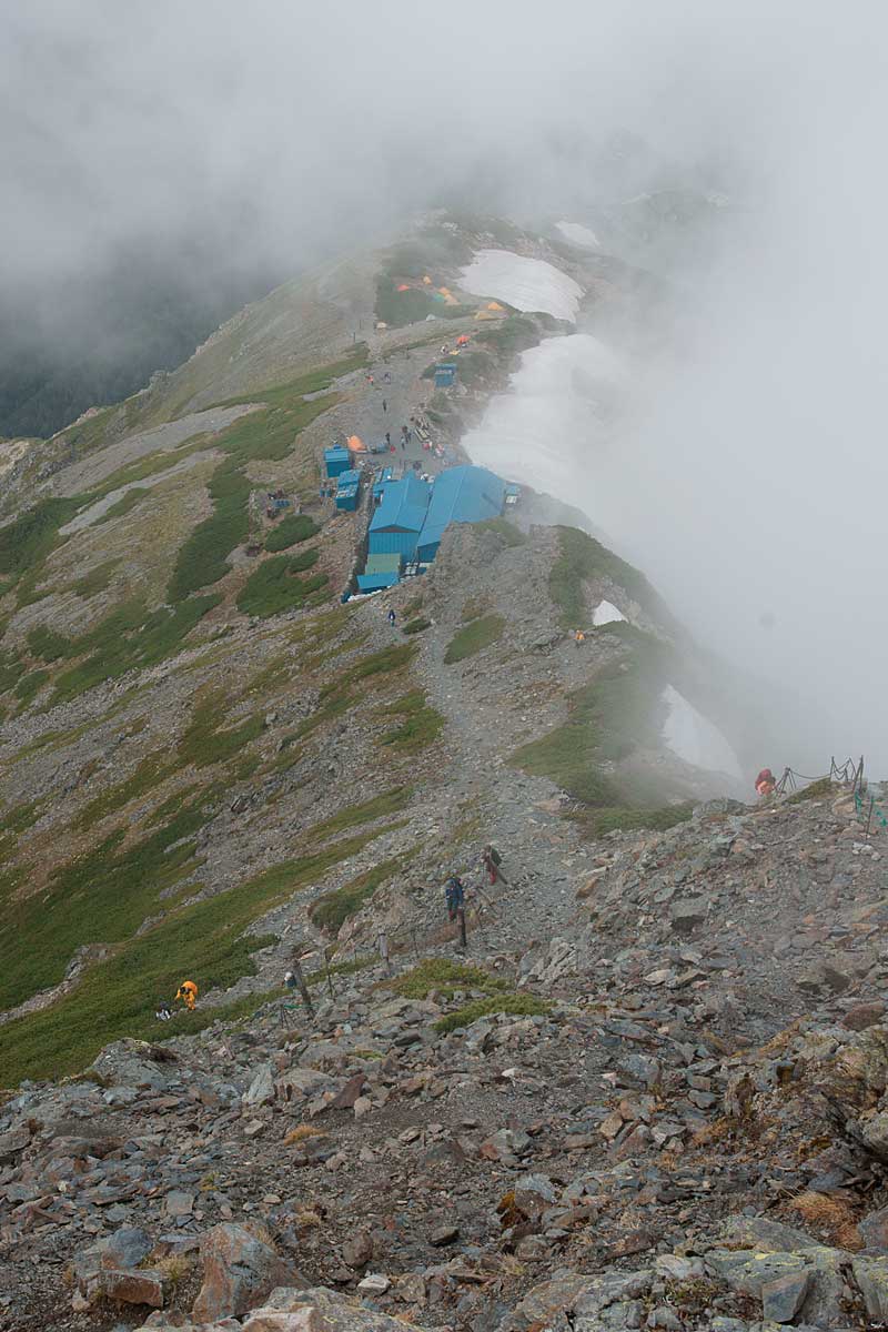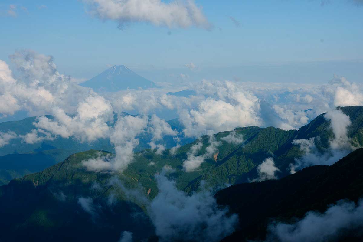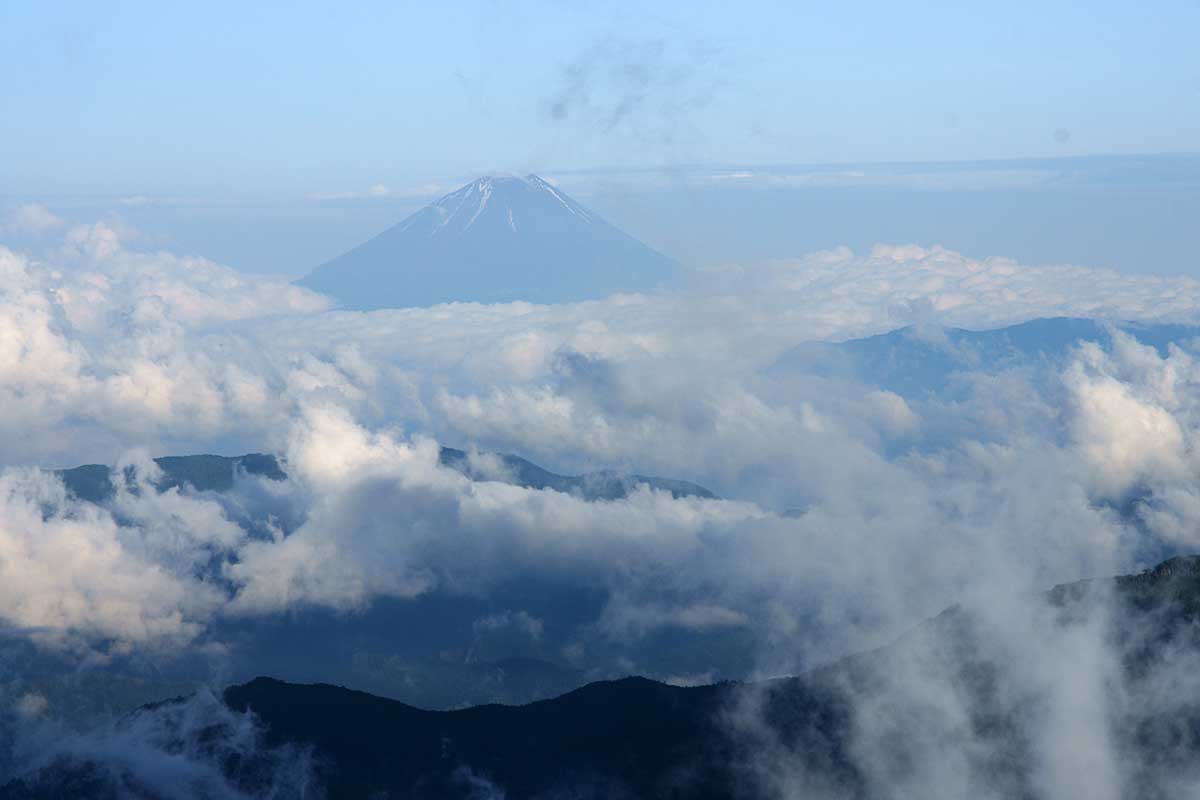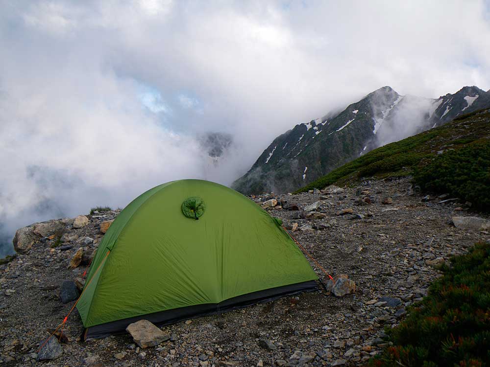 ハクサンイチゲ 吊尾根分岐まで登り返し、本日の最終目的地である北岳山荘へ向け、稜線を南下する。振り返ると荒々しい岩場に見えるが、見た目よりも歩きやすいコースだ。荒々しい岩峰もさることながら、キバナシャクナゲやハクサンイチゲの群落が点在し見事に花を咲かせていたのが印象的だった。北アルプス白馬岳に比べると種類こそ多くないが、どこも見事な群落であった。少し季節をずらせ、また来てみたいと思った。 稜線を少し降り北岳の方を振り向くと、ガスがとれて青空が見え始めていた。ある程度の天候の回復は見込んでいたが、最も大切なところで晴れてくれたのは、幸運としか言いようがなかった。これだけで今日の目的が達成されたので、気分良く山荘のある野営場目指して降っていた。 富士山 時間は17時を過ぎていたが、到着客の受付で係のお兄さんが忙しそうにしていた。稜線から俯瞰したところでは、野営場にはふた張りのテントしか確認できなかったので、急いで場所選びをすることもない。場所代の600円と缶ビールを1本(500円)、水1リットル(100円)を買ってテント場に降りた。景色が良くて、風が当たらなくて、地面が水平で、水はけがよくて、静かなところを探すのが面倒になってきたので、適当なところに設営しまずは、缶ビールで一日の労をねぎらう。一日の行動時間が長かったのと、高所であるために頭痛がとれず、食欲もあまり湧いてこない。しかし明日は、ロングコースが待っているので、食べておかないと駄目だ。食材もいろいろと準備したが結局、ハム、チーズ、レトルトカレー、パン、ウインナーとキャベツのコンソメスープという手抜きメニューとなった。食事を済ませテントから外を覗くと、日本一の高峰である富士山がくっきりと、雲海に浮かんできた。また第二の高峰である北岳がコントラストを増して、絵ハガキにも出て来そうな山容で見る人を惹きつけていた。 風と雨 撮影を終えテントに入るなり、どっと疲れが出てきた。時間はまだ18時30分を過ぎたところだが、寝袋に入り横になることにした。無理もないだろう、火曜が熊野、水曜が鈴鹿、木曜が浜松、金曜が駒ヶ岳SAで車泊、そして土曜が北岳のテントの中だ。毎晩寝る場所が違っているので、その順応性が問われるが、シュラフに入るなり眠ってしまったようだ。フライシートの風によるばたつきと、テントを打つ雨の音で目が覚めた。時計を見ると9時で、まだ山荘の明かりも点いていた。少し眠れたので疲れも薄らいできた。暖かいコーヒーで暖まりながら、明日のコースをトレースしてみることにした。時間にゆとりを持たせたいので、予定通り間ノ岳を通過するなら少なくとも4時には出発したいところだ。となると3時頃から準備を始めなければならない。外は強風と雨だ。この状態では間ノ岳を断念するしかなさそうだが、とにかく朝にならないと判断はできない。