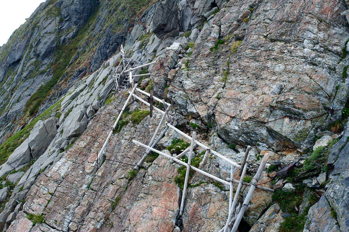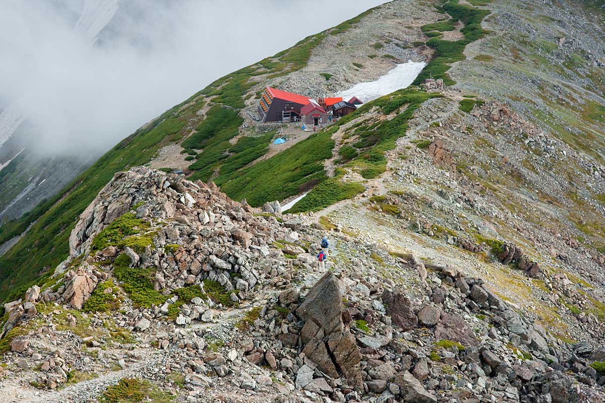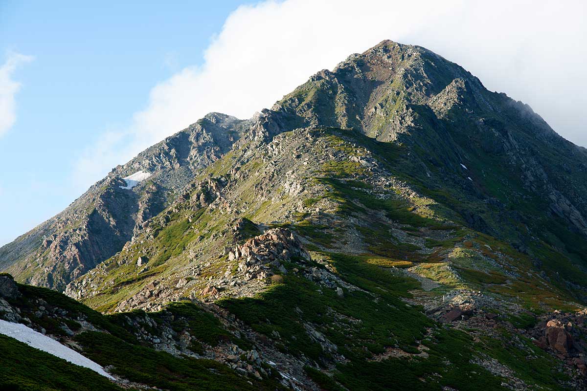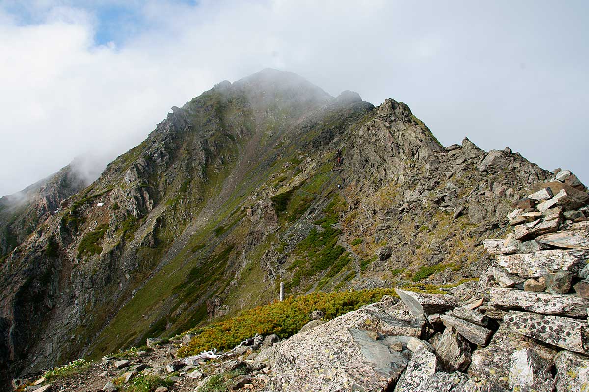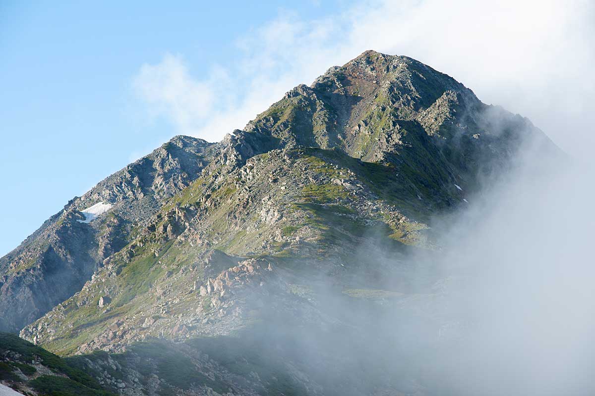 ハクサンイチゲ 吊尾根分岐まで登り返し、本日の最終目的地である北岳山荘へ向け、稜線を南下する。振り返ると荒々しい岩場に見えるが、見た目よりも歩きやすいコースだ。荒々しい岩峰もさることながら、キバナシャクナゲやハクサンイチゲの群落が点在し見事に花を咲かせていたのが印象的だった。北アルプス白馬岳に比べると種類こそ多くないが、どこも見事な群落であった。少し季節をずらせ、また来てみたいと思った。 稜線を少し降り北岳の方を振り向くと、ガスがとれて青空が見え始めていた。ある程度の天候の回復は見込んでいたが、最も大切なところで晴れてくれたのは、幸運としか言いようがなかった。これだけで今日の目的が達成されたので、気分良く山荘のある野営場目指して降っていた。 富士山 時間は17時を過ぎていたが、到着客の受付で係のお兄さんが忙しそうにしていた。稜線から俯瞰したところでは、野営場にはふた張りのテントしか確認できなかったので、急いで場所選びをすることもない。場所代の600円と缶ビールを1本(500円)、水1リットル(100円)を買ってテント場に降りた。景色が良くて、風が当たらなくて、地面が水平で、水はけがよくて、静かなところを探すのが面倒になってきたので、適当なところに設営しまずは、缶ビールで一日の労をねぎらう。一日の行動時間が長かったのと、高所であるために頭痛がとれず、食欲もあまり湧いてこない。しかし明日は、ロングコースが待っているので、食べておかないと駄目だ。食材もいろいろと準備したが結局、ハム、チーズ、レトルトカレー、パン、ウインナーとキャベツのコンソメスープという手抜きメニューとなった。食事を済ませテントから外を覗くと、日本一の高峰である富士山がくっきりと、雲海に浮かんできた。また第二の高峰である北岳がコントラストを増して、絵ハガキにも出て来そうな山容で見る人を惹きつけていた。 風と雨 撮影を終えテントに入るなり、どっと疲れが出てきた。時間はまだ18時30分を過ぎたところだが、寝袋に入り横になることにした。無理もないだろう、火曜が熊野、水曜が鈴鹿、木曜が浜松、金曜が駒ヶ岳SAで車泊、そして土曜が北岳のテントの中だ。毎晩寝る場所が違っているので、その順応性が問われるが、シュラフに入るなり眠ってしまったようだ。フライシートの風によるばたつきと、テントを打つ雨の音で目が覚めた。時計を見ると9時で、まだ山荘の明かりも点いていた。少し眠れたので疲れも薄らいできた。暖かいコーヒーで暖まりながら、明日のコースをトレースしてみることにした。時間にゆとりを持たせたいので、予定通り間ノ岳を通過するなら少なくとも4時には出発したいところだ。となると3時頃から準備を始めなければならない。外は強風と雨だ。この状態では間ノ岳を断念するしかなさそうだが、とにかく朝にならないと判断はできない。
