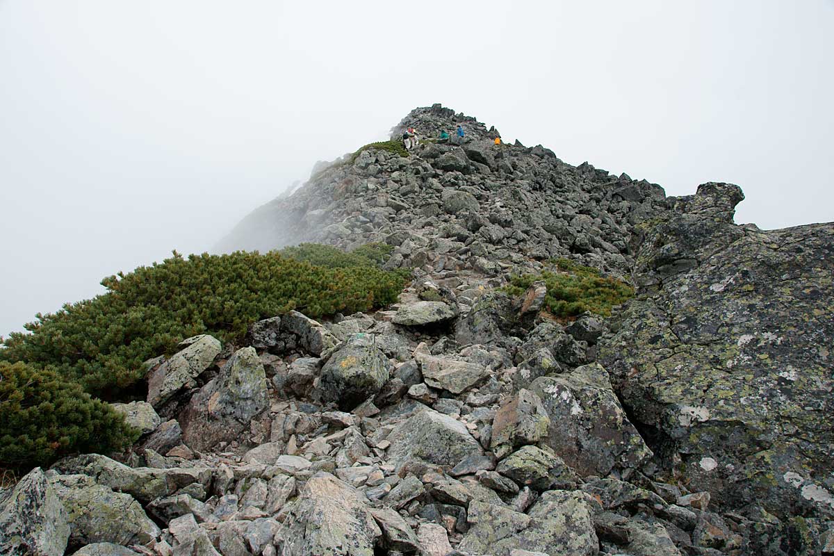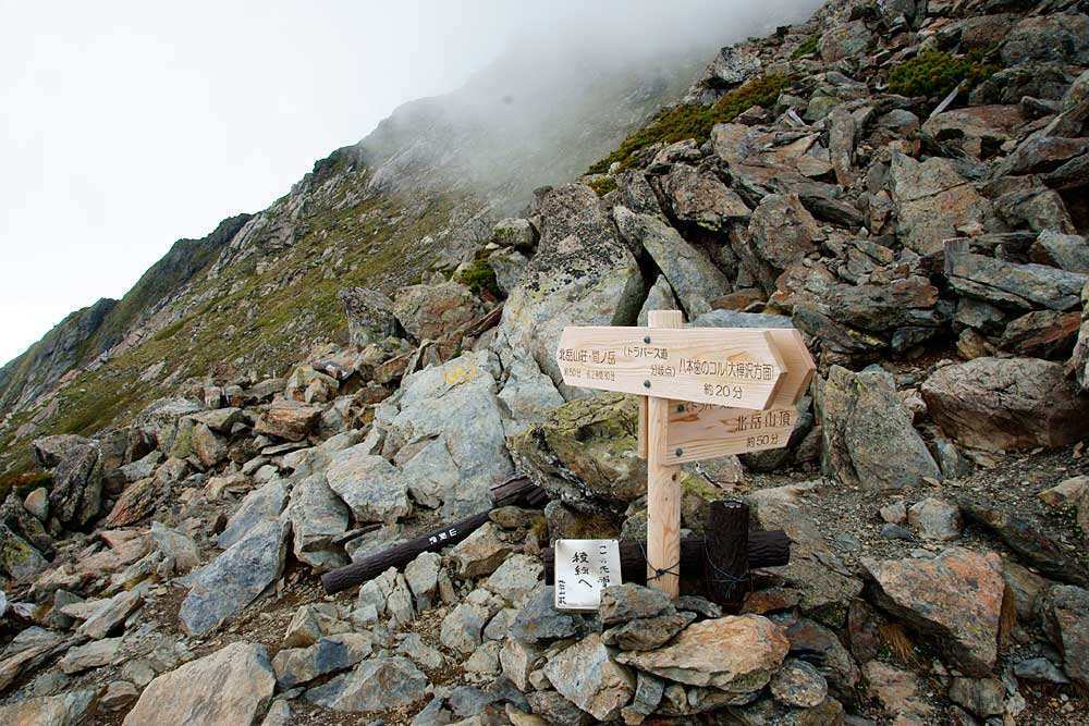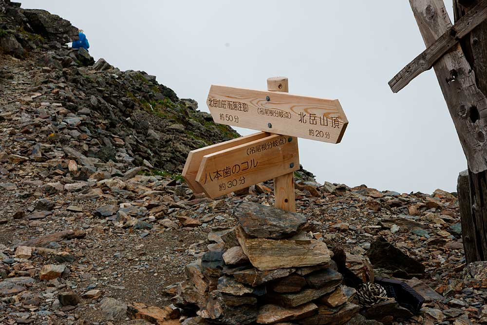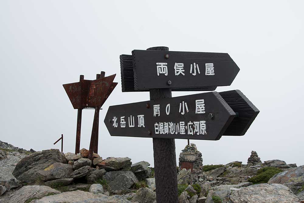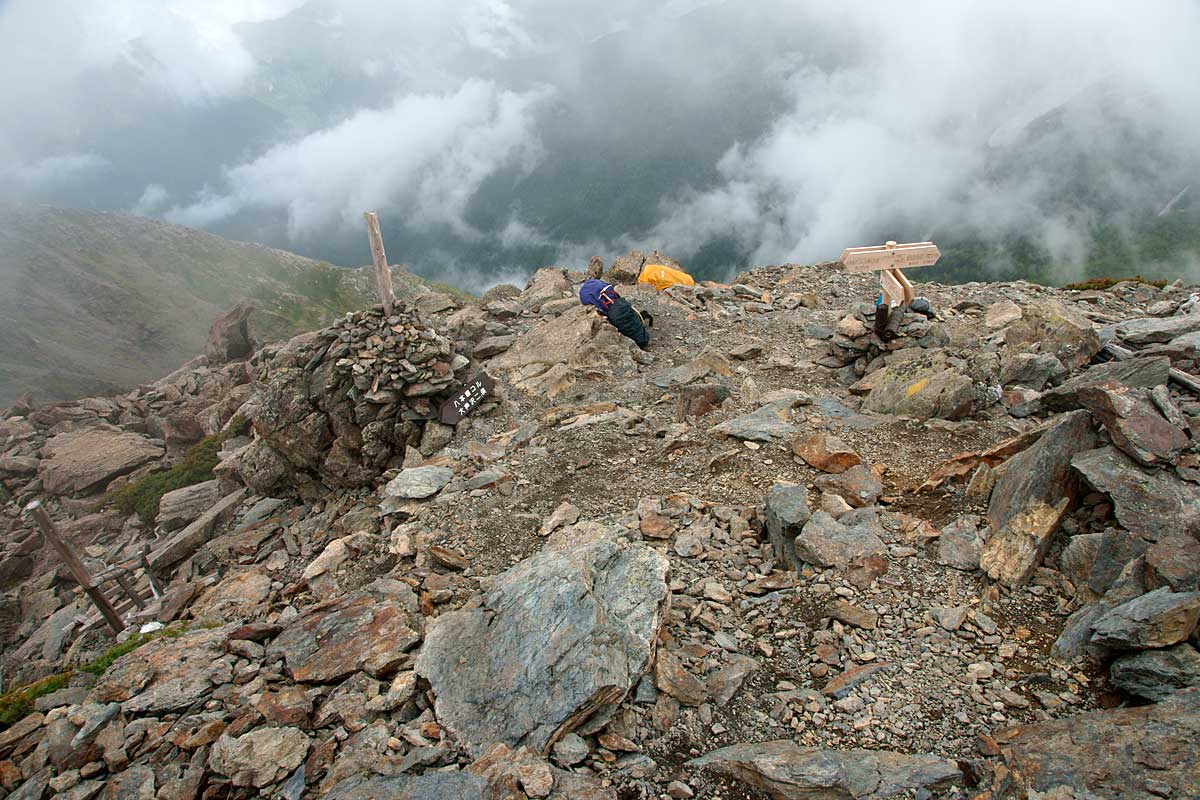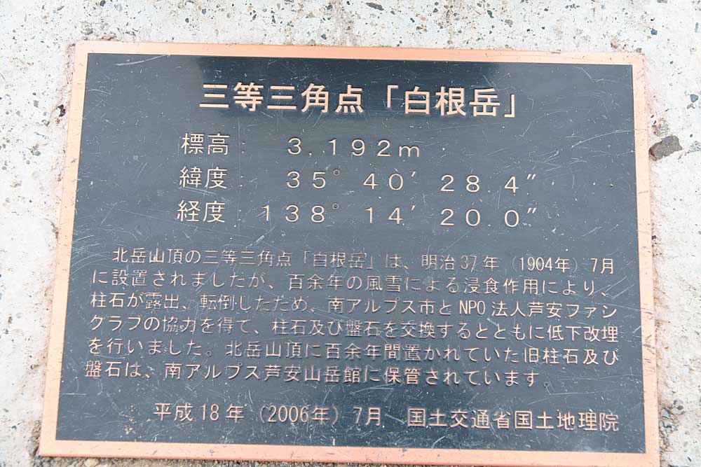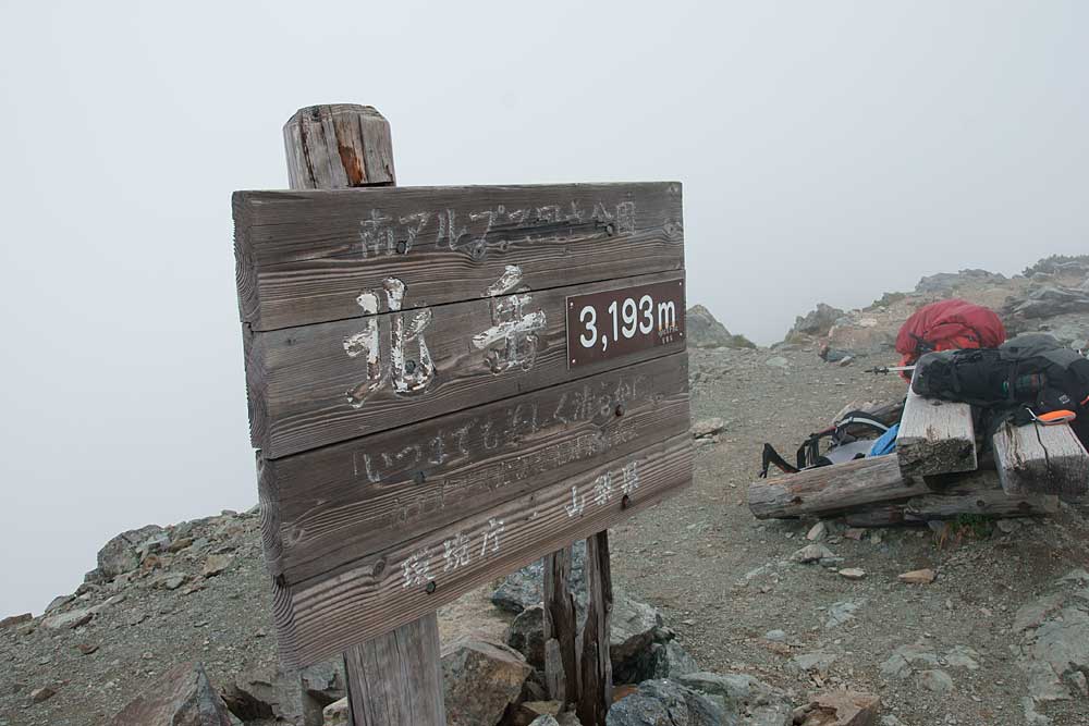 ■北岳、間ノ岳(南アルプス)2009年7月4日5日 No.498 隊長 北岳山頂 肩の小屋から山頂までは、標高差200mで50分の距離。このルートを登った登山者のほとんどは、肩の小屋か野営場泊のようだった。天候を見てのピークハントの登山者は何人かみかけたが、重い荷物を担いで山頂を越えていくのは少数派だ。さすがに3000mを越えると息苦しくなってくる。10mほど進んで呼吸を整える。これの繰り返しだ。スタミナと体力はあるが、酸素不足ではどうにもならない。足を止めて酸素を血液中のヘモグロビンにくっつける。この作業を繰り返しているうちに山頂に到着した。 途中で両俣への分岐を確認し、このルートの選択しに一つにとしていたが、どうも水量が多いときは徒渉に苦労するらしいとのこと。 第二の高峰 山頂はガスに包まれていた。若干の期待感を持って登ってきたが、前回と同じく、北岳の山頂へは来ただけとなってしまった。大樺沢の雪渓を俯瞰してみたかったが、これはまた次回の楽しみに残しておくことにし、早々に山頂を後にした。ところで北岳であるが、国土地理院の三角点名は「白根岳」となっている。最初に設置されたのは1904年7月のこと。点の記で一躍脚光を浴びた剱岳の測量は1907年のことだった。たけくらべをすれば、3192mの北岳のほうが200mも高いが、一般の人から見ると知名度はひくい。日本で一番高い山が富士山であることは誰でも知っているが、第二の高峰はと訊くと、答えられない人の方が多いだろう。深田久弥は「日本百名山」の中で、「この山が謙虚だからである」といっている。「抜きん出て人の目を惹こうとするところがない。奇矯な形態で、その存在を誇ろうとするところもない。それでいて高い気品をそなえている。いつも前山のうしろに、つつましく、しかし凛として気概をもって立っている。奥ゆかしい山である」なるほど、その通りだ。前回の山行ではその山容を見ることができなかったが、今回は山の南側から見ることができた。「高い気品をそなえている」に納得した。