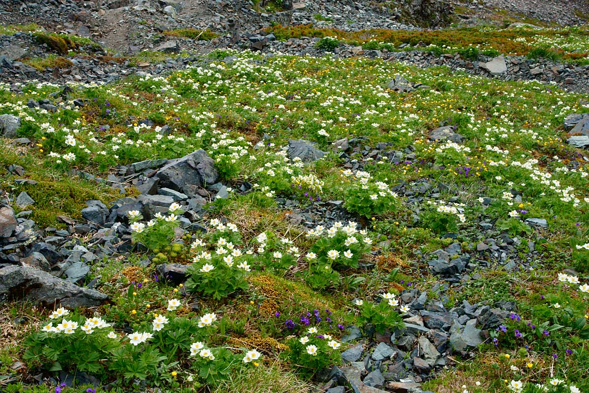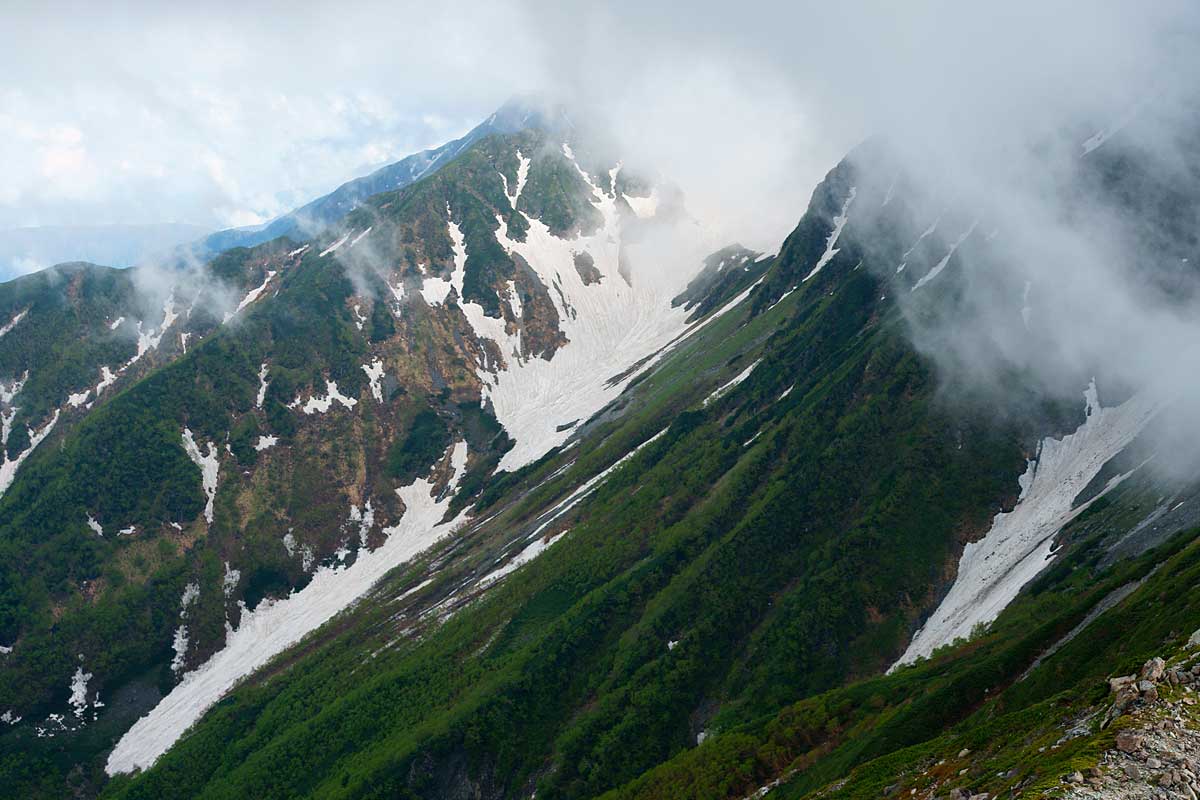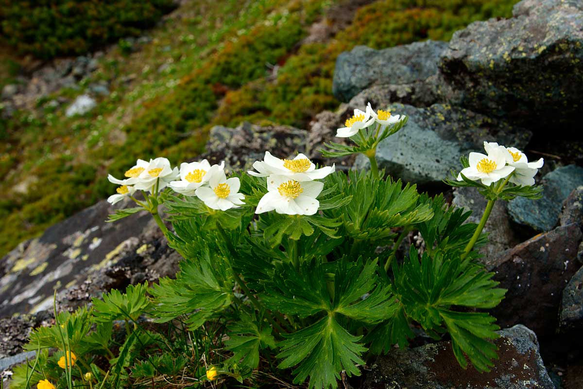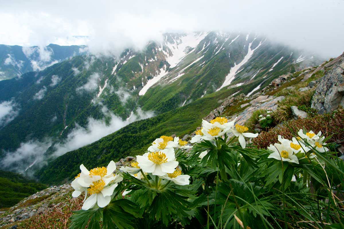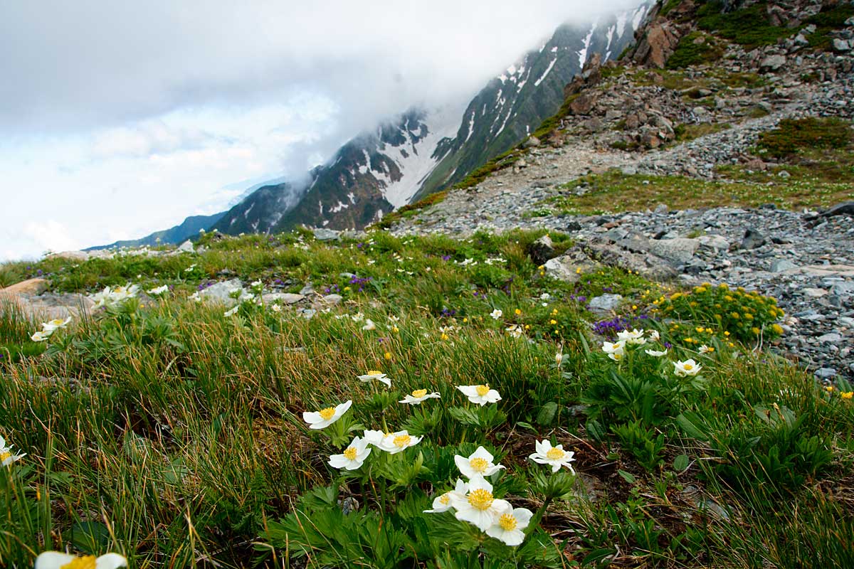 キタダケソウ さて、私がこの山に来た目的の一つは、キタダケソウを見ることにある。前回もこの花の咲く時期に来ているが、生憎のガス模様で、群落の様子などがつかめなかった。ガスにつつかれていた山頂から南へ降り、吊り尾根分岐まで来ると、幸運にもガスが徐々に消え始め、自生地であるトラバース道の全容が見え始めた。これはしめたぞ。ザックを吊尾根分岐にデポし、急いで降ることにした。遠くから見るとハクサンイチゲの群落と区別がつかない。前回見たのと同じ場所まで行くと、咲いていました。花にも葉にも特徴があるので直ぐに区別ができる。じっくりと観察や撮影をしたいが、100mの登り返しに15分、分岐から野営場までが1時間かかる。1時間15分を差し引くと残った時間はまりない。時折薄日が射してくるので、そのチャンスをねらって撮影できたのは幸運だった。