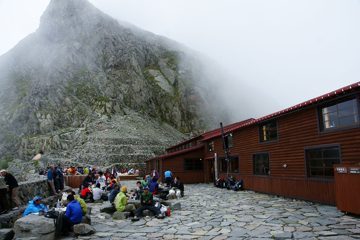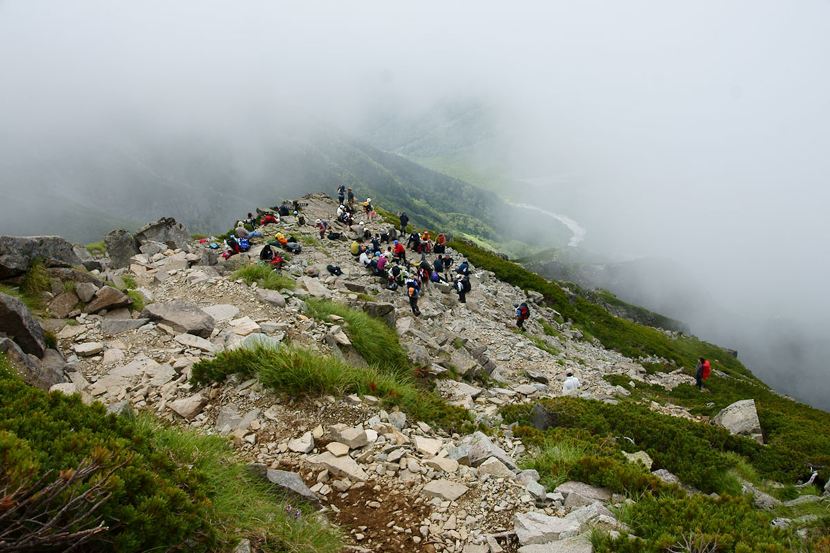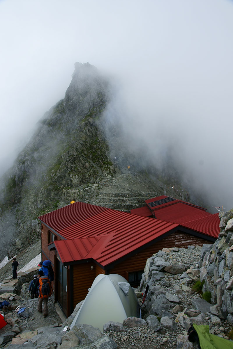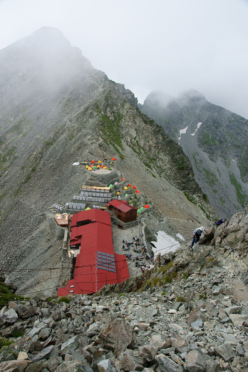 吊尾根 紀美子平に戻ると、先ほどの大勢の登山者は立ち去った後だった。一息入れてから紀美子平を後にした。ここから奥穂までの稜線は「吊尾根」と呼ばれ、たぶん地形の様子を見てつけられた呼び名だろう。先ほどの重太郎新道の登りに比べると、傾斜は緩やかなのでゆとりを持って歩ける。岩稜のため、その生育環境を好む植物である、ミヤマトウキ、オンタデ、イワツメクサ、ウサギギク、チシマギキョウ、イワギキョウ、ヨツバシオガマなどが目を楽しませてくれた。またこの吊尾根だが、紀美子平から奥穂へ向かう場合、標高差にして300mの登りになる。18キロの装備を担ぎ、標高差1600mを登ってきた足腰には疲労が溜まっており、傾斜は緩やかだがつらい登となった。なお、岩稜のために岩礫等に足を取られてはいけない。 吊尾根の鞍部あたりでは涸沢が俯瞰でき、白い岩礫と雪渓が織りなす景観は特徴的で実に美しい。登路は稜線の西側につけられていて、高度を上げていくと左手に、ジャンダルムやロバの耳のある馬の背尾根が迫ってくる。しかりと目印を確認していかないと、少しでもルートを外れると、滑りやすい砂礫、岩礫地帯に入ってしまい危険だ。やがて奥穂高岳の山頂に祭られている祠が見えてくる。 奥穂高岳 奥穂高岳は、高連峰の主峰であり、標高3,190mある。富士山3776m・北岳3192mに次いで日本で3番目の高峰だ。山頂付近は先ほどの北穂に比べると、岩峰であるが居場所も多く穏やかだ。山頂には嶺宮の祠と石盤がある。穂高町に本宮穂高神社が、上高地の明神池に奥宮があるようだ。岩に腰を下ろし休んでいると、馬の背の方から何人かの登山者がやってきた。皆一様に緊張感を解放し、無事にたどり着けたという安堵感を漂わせていた。 野営場 受付の前にテント設営場所があるかどうか探しに行く。かろうじてひと張り設置できる場所があったので、とりあえずそこをキープした。その後、穂高岳山荘のテント受付へ行き、手続きを済ませる。料金はトイレ料を入れて600円。ついでに缶ビールと水(150円/リットル)を買って野営場に戻りテントを設置する。残っていた場所は段々畑のような所で、ぎりぎりのスペースしかなかった。その後何人かのテント泊登山者がやってきてた。明らかにオーバーしているが、ヘリポートやら小屋前のテラスやらトイレ前のスペースやらを有効に使っていた。窮屈な思いをするよりもむしろ、そちらの方が良かったのではないだろうか。しかし、ヘリポートへの設営は問題があるのでは。 穂高岳山荘 テラスは登山者で溢れ、大変賑わっていた。 苦労してここまで登り、または険しい岩峰を縦走中の者にとっては砂漠の中のオアシスのようで、安堵感と喜びでうれしくなるのはよくわかる。しかし単独者にとっては、この雰囲気になじむには少し時間がかかった。テラスの縁に座り缶ビールを飲む。涸沢が俯瞰でき、夕日でも見られると最高だが、生憎のガスで何も見えない。足下を見ると雀ほどの大きさのイワヒバリが一羽、石畳の上で羽を休めていた。近づいても逃げようとしない。まだ子供なのかそれとも、疲れ切って休んでいるのだろうか。少しアルコールが入ったのと、睡眠不足と眠くなってきたのでテントへ戻り横になることにした。 |