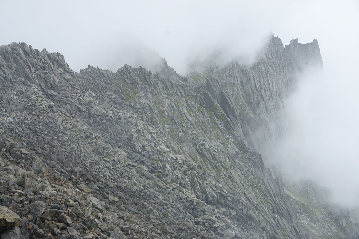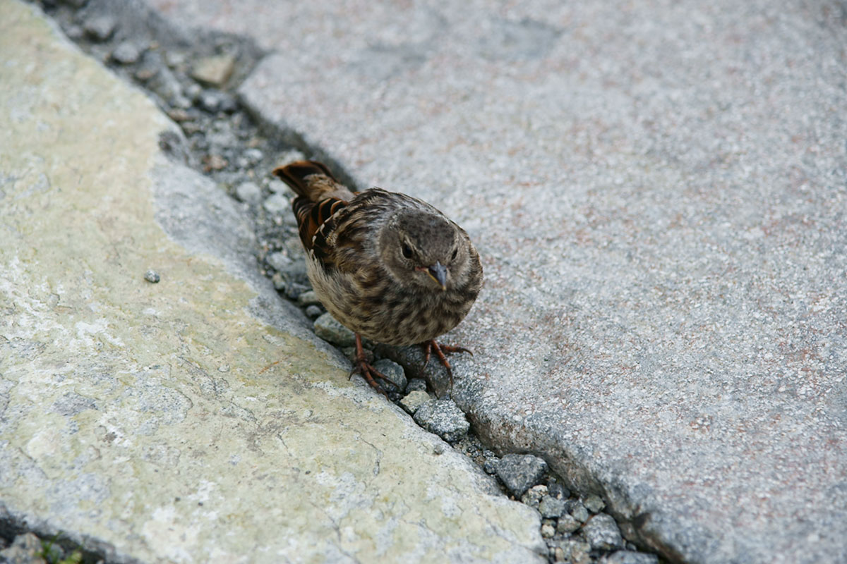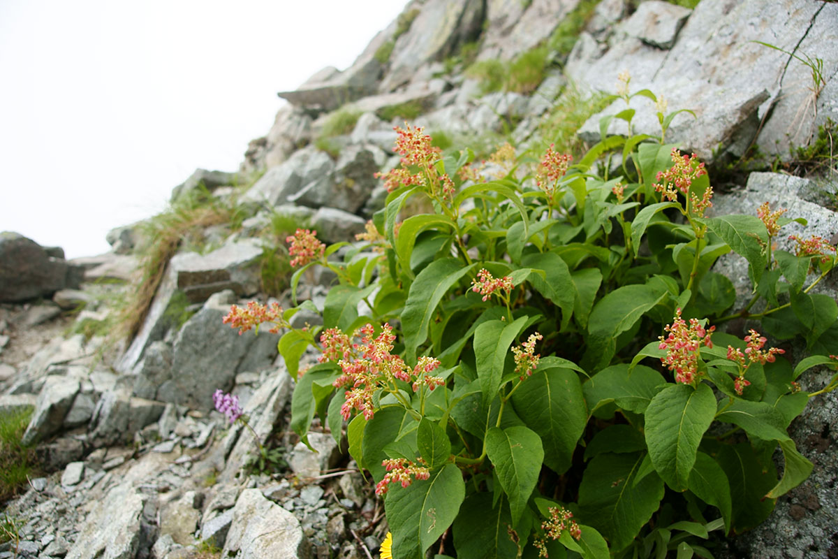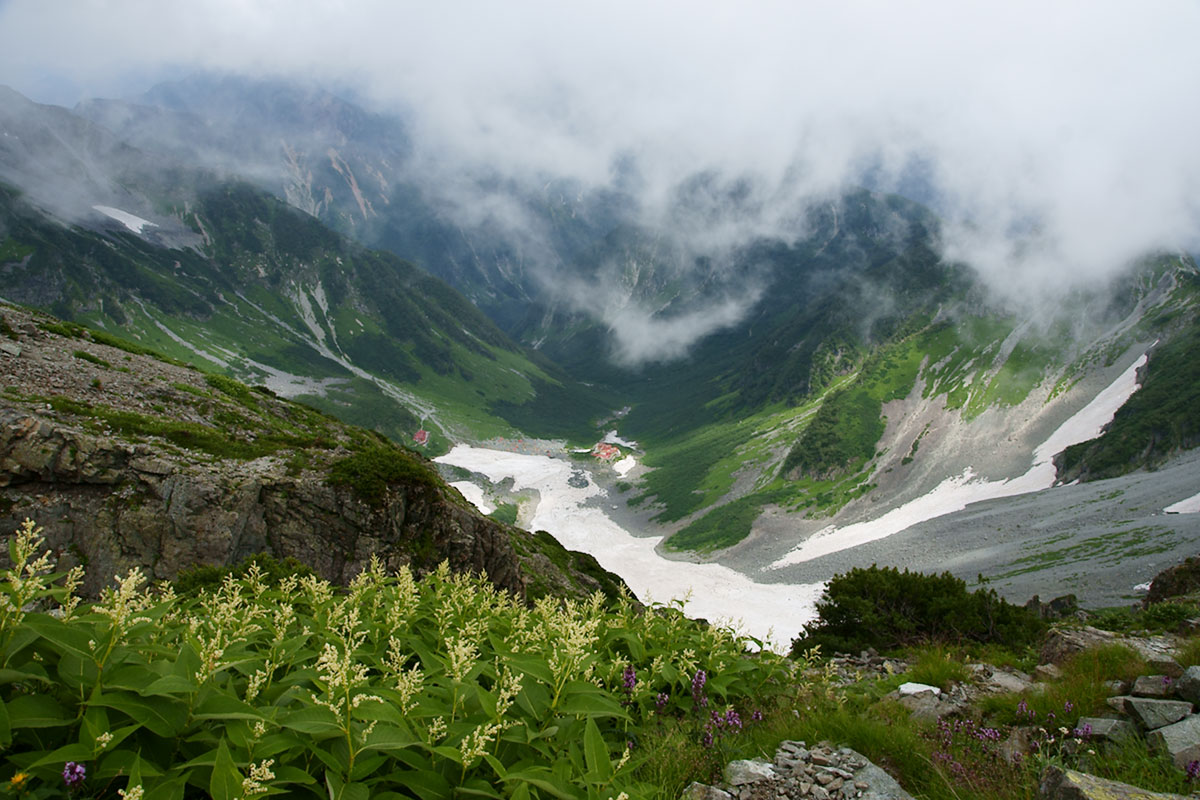 吊尾根 紀美子平に戻ると、先ほどの大勢の登山者は立ち去った後だった。一息入れてから紀美子平を後にした。ここから奥穂までの稜線は「吊尾根」と呼ばれ、たぶん地形の様子を見てつけられた呼び名だろう。先ほどの重太郎新道の登りに比べると、傾斜は緩やかなのでゆとりを持って歩ける。岩稜のため、その生育環境を好む植物である、ミヤマトウキ、オンタデ、イワツメクサ、ウサギギク、チシマギキョウ、イワギキョウ、ヨツバシオガマなどが目を楽しませてくれた。またこの吊尾根だが、紀美子平から奥穂へ向かう場合、標高差にして300mの登りになる。18キロの装備を担ぎ、標高差1600mを登ってきた足腰には疲労が溜まっており、傾斜は緩やかだがつらい登となった。なお、岩稜のために岩礫等に足を取られてはいけない。 吊尾根の鞍部あたりでは涸沢が俯瞰でき、白い岩礫と雪渓が織りなす景観は特徴的で実に美しい。登路は稜線の西側につけられていて、高度を上げていくと左手に、ジャンダルムやロバの耳のある馬の背尾根が迫ってくる。しかりと目印を確認していかないと、少しでもルートを外れると、滑りやすい砂礫、岩礫地帯に入ってしまい危険だ。やがて奥穂高岳の山頂に祭られている祠が見えてくる。 奥穂高岳 奥穂高岳は、高連峰の主峰であり、標高3,190mある。富士山3776m・北岳3192mに次いで日本で3番目の高峰だ。山頂付近は先ほどの北穂に比べると、岩峰であるが居場所も多く穏やかだ。山頂には嶺宮の祠と石盤がある。穂高町に本宮穂高神社が、上高地の明神池に奥宮があるようだ。岩に腰を下ろし休んでいると、馬の背の方から何人かの登山者がやってきた。皆一様に緊張感を解放し、無事にたどり着けたという安堵感を漂わせていた。 野営場 受付の前にテント設営場所があるかどうか探しに行く。かろうじてひと張り設置できる場所があったので、とりあえずそこをキープした。その後、穂高岳山荘のテント受付へ行き、手続きを済ませる。料金はトイレ料を入れて600円。ついでに缶ビールと水(150円/リットル)を買って野営場に戻りテントを設置する。残っていた場所は段々畑のような所で、ぎりぎりのスペースしかなかった。その後何人かのテント泊登山者がやってきてた。明らかにオーバーしているが、ヘリポートやら小屋前のテラスやらトイレ前のスペースやらを有効に使っていた。窮屈な思いをするよりもむしろ、そちらの方が良かったのではないだろうか。しかし、ヘリポートへの設営は問題があるのでは。 穂高岳山荘 テラスは登山者で溢れ、大変賑わっていた。 苦労してここまで登り、または険しい岩峰を縦走中の者にとっては砂漠の中のオアシスのようで、安堵感と喜びでうれしくなるのはよくわかる。しかし単独者にとっては、この雰囲気になじむには少し時間がかかった。テラスの縁に座り缶ビールを飲む。涸沢が俯瞰でき、夕日でも見られると最高だが、生憎のガスで何も見えない。足下を見ると雀ほどの大きさのイワヒバリが一羽、石畳の上で羽を休めていた。近づいても逃げようとしない。まだ子供なのかそれとも、疲れ切って休んでいるのだろうか。少しアルコールが入ったのと、睡眠不足と眠くなってきたのでテントへ戻り横になることにした。 |