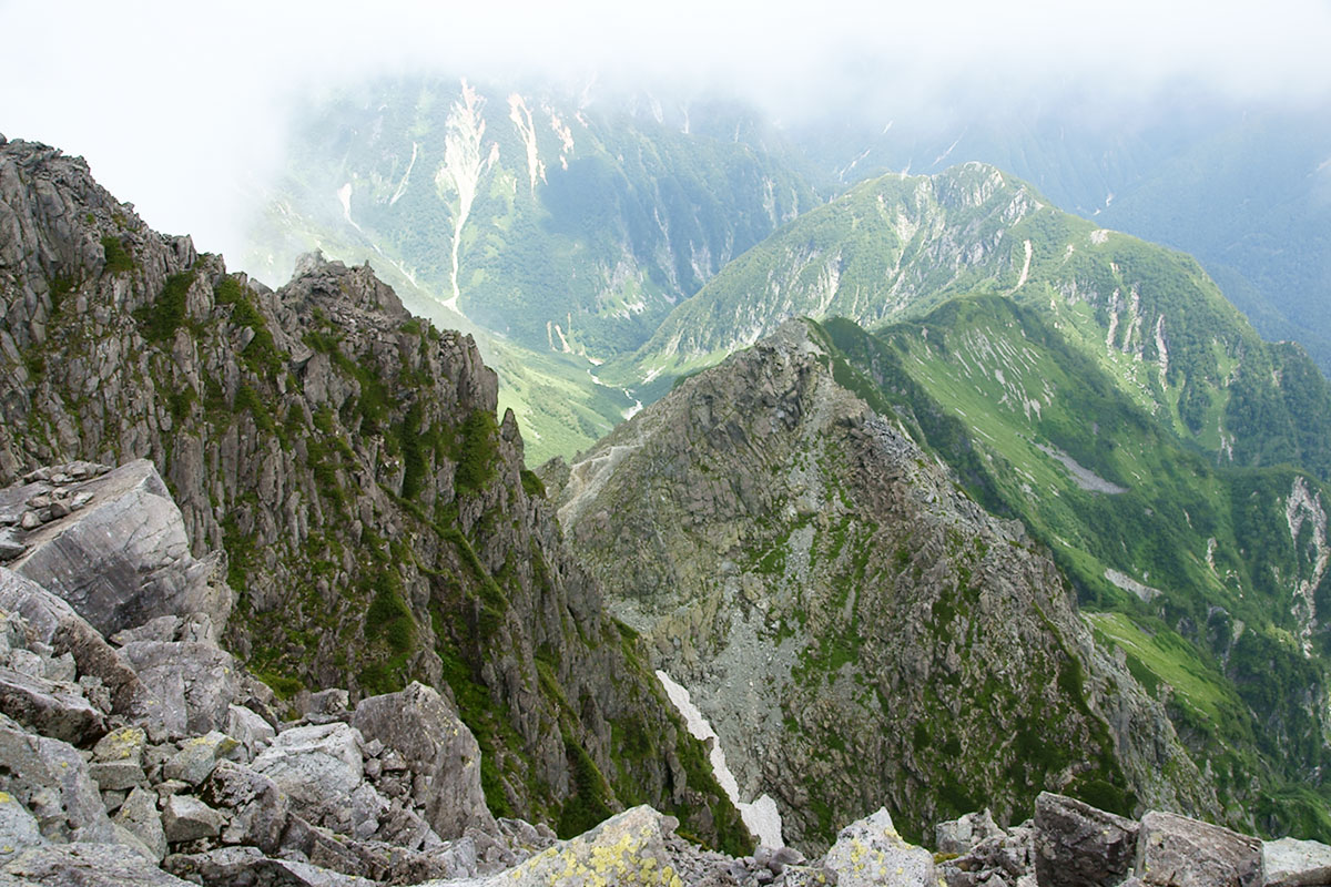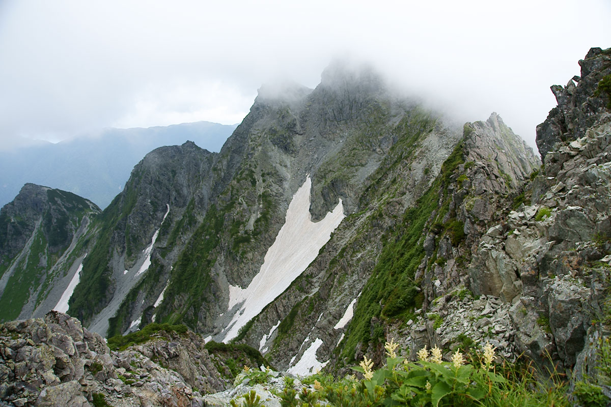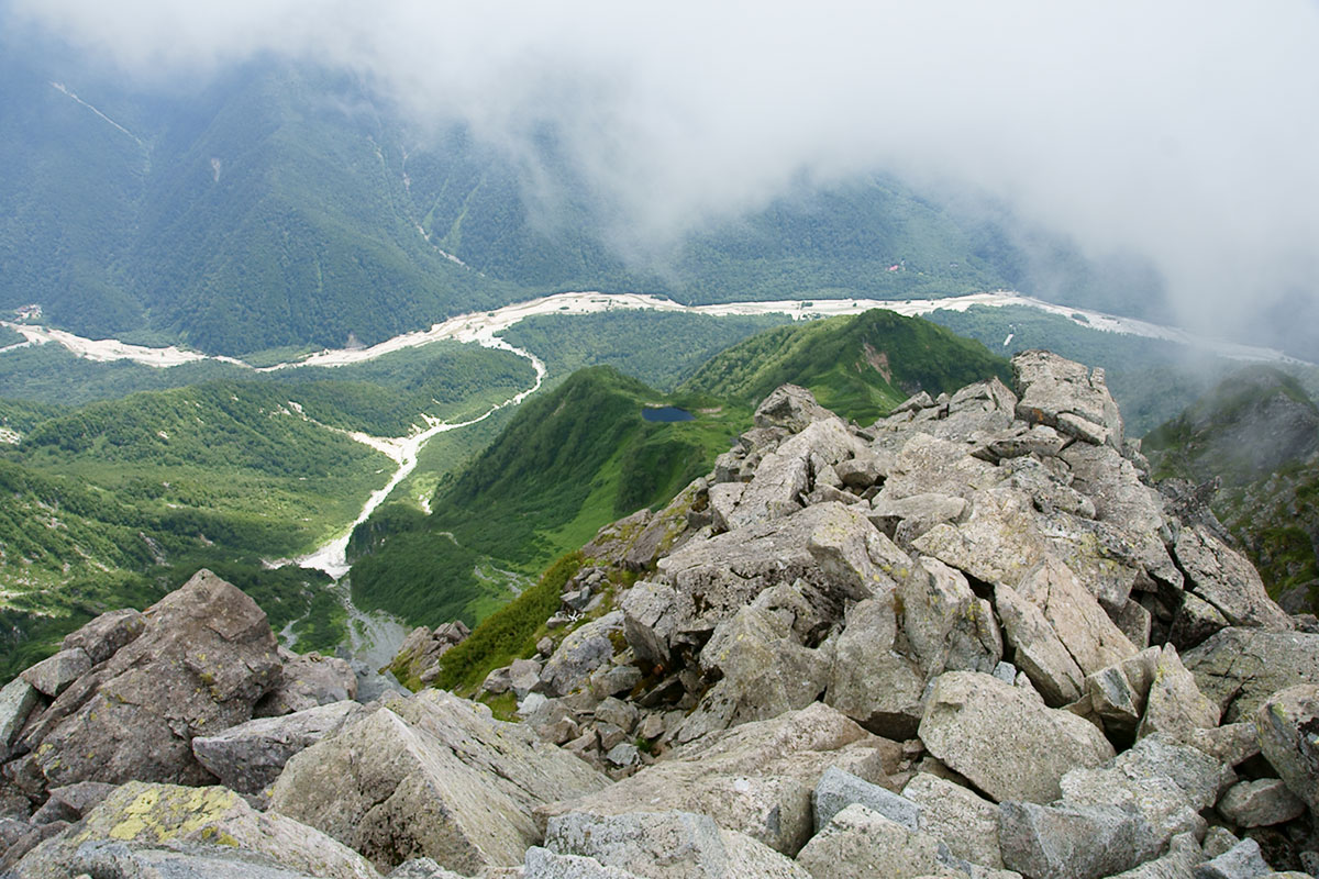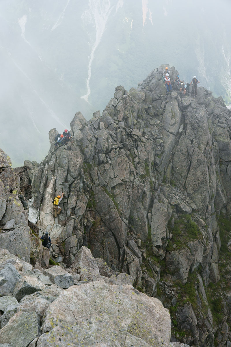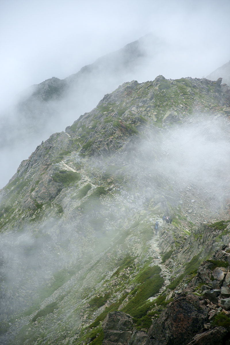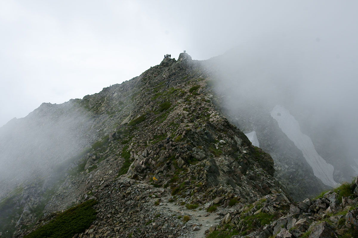 ■穂高連峰(北アルプス)2009年8月15,16日 No.502 隊長 | 15日の1 | 15日の2 | 16日の1 | 16日の2 | 紀美子平 紀美子平には10時半に到着した。コースタイムは2時間15分で、まずまずのタイムだった。今期4度目のアルプス山行となり、体も高所に順応したようで、自分のペースで登ることができたように思う。紀美子平はちょっとしたテラス状の広場になっており、たくさんの登山者が集っていた。少しお腹がすいてきたので岩に腰を下ろしてパンをかじり、ガスの切れ間から眺望を楽しんだ。さてここにザックをデポし、前穂を往復することにした。標高差は約150mほどで、1時間もあれば十分に山頂を往復できる。今日は出だしから雲ひとつない天気に喜んでいたが、ここにきてガスが出始め、眺望が得られなくなったのは残念だった。 前穂高岳 山頂に上がるとガスの中だったが、ガスの切れ間から少しだけ眺望が得られた。前回来たときは確か眺望はよかったように記憶している。その時は今日とは逆コースだった。このコース、奥穂方面から岳沢へ降りる登山者が大多数のようで、先ほど紀美子平で集っていた多くの登山者はすでに山頂から降りてきた人たちだったようだ。山頂は閑散としていた。ガスが出れば山頂には長居は無用ということだろう。しかし今日はまだ時間にゆとりがあるので、ガスの切れる撮影チャンスを待った。ガスの中から前穂北尾根の2,3峰が浮かび上がってきた。クライマーが岩に張り付いていた。眼下に目をやると、白い筋を引く梓川がくっきりと見えている。また茶臼の頭の左に奥又白池が確認できた。あの辺りは、「氷壁」の舞台となった前穂東壁のベースとなった所であることを思い出した。小説の登場人物の「小坂」が、ナイロンザイルが切れ遭難したのがこの前穂東壁だ。いずれにしろ山頂からの眺望は大変よく、かつ高度感も抜群に良いところだ。ガスがなければもう少し居たいが、すぐにガスに包まれ白濁の世界になってしまった。
