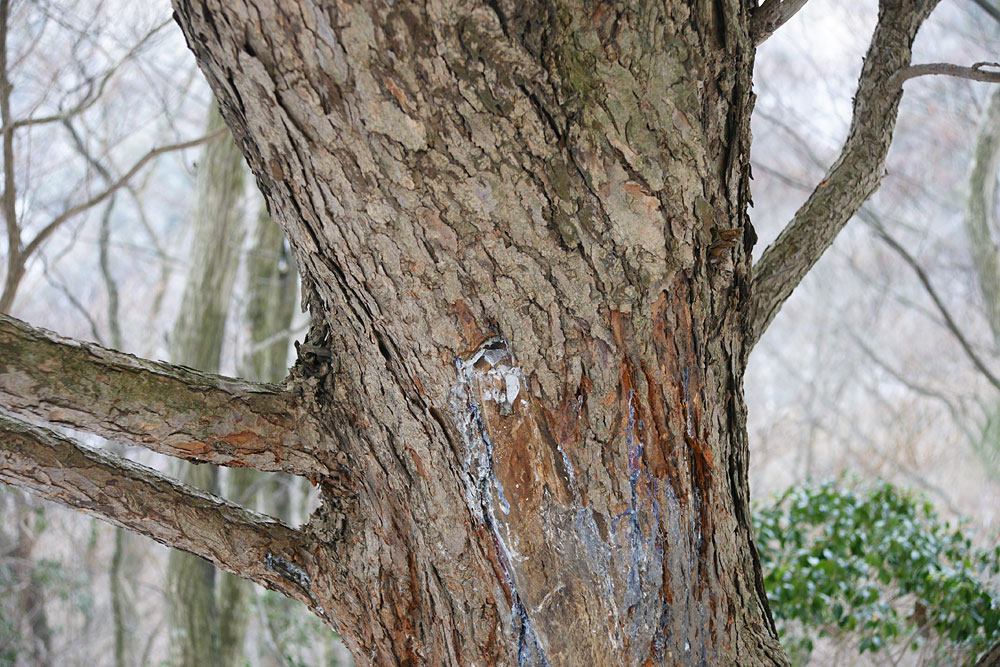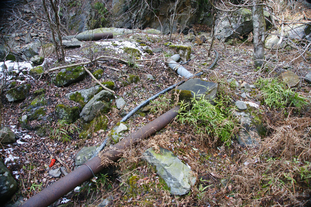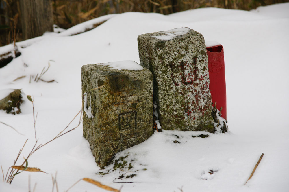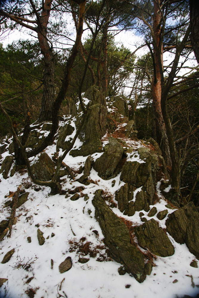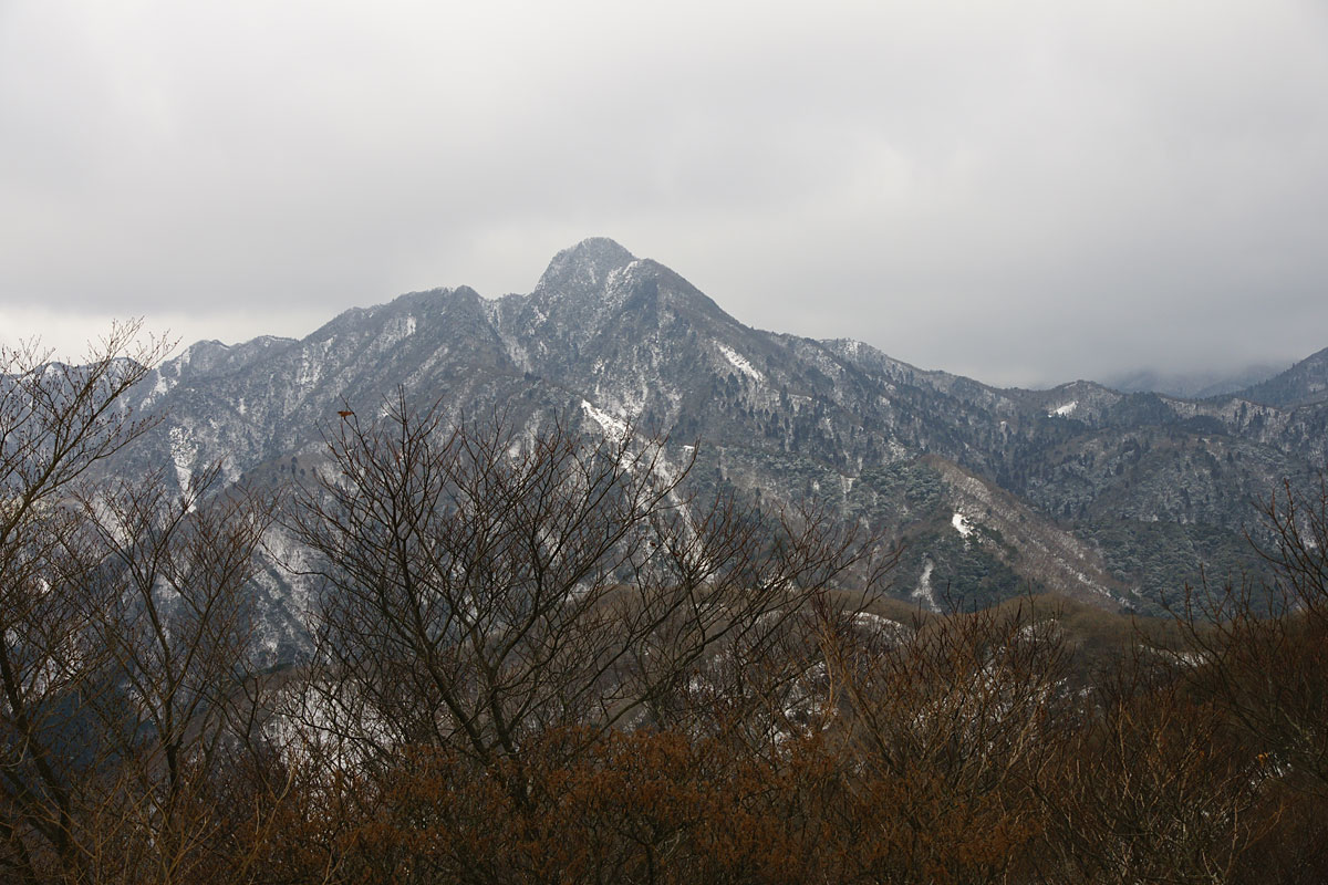■雲母峰(鈴鹿) 2010年1月16日 No.527 隊長 本日のルート 国土地理院の提供している電子国土Webシステムを利用 宮妻キャンプ場から雲母へのルートが使えるかを検証した。帰路はキララ谷右岸尾根を使ったが、雪のために滑りやすく、尾根末端は険しく誰にも歩かれていないようだった。大きな猪が二頭、目の前を悠々と歩いて行った。こんな所には人は来ないだろうと、警戒する様子もなかった。猪は目と耳が鈍感なのかもしれない。 プロローグ 雲母峰への登路は、湯の山温泉側からと東山麓の東海自然歩道からが一般的だ。西側からは、鎌ガ岳から雲母峰に延びる釣り尾根にルートがある。北側からは稲森谷からこの尾根に繋がっている。一方宮妻からはカズラ谷コースが一本あるが、雲母に向かうにはかなり大回りになる。791独標尾根は杣道があるようだが、一般的に登山道としては使われていない。しかしこのルートが使えると、利用価値の高い道になるかもしれない。 アプローチ 日陰の部分が凍り付いた林道を注意して走った。宮妻キャンプ場の駐車場は閑散としていた。寒波が緩んだがまだ、雪雲が山を越えて流れ込んでいた。準備を済ませ、道路を挟んだ駐車場の向かいから取り付いた。 791独表尾根 鈴鹿の山と谷では、この尾根ルートのことを、791独表尾根といっている。吊り尾根の中間地点にあり、鎌ガ岳、雲母峰どちらでもねらうことができ、また、エスケープルートとしても利用価値が高いとみている。確かにその通りだと思う。しかし最近のマップには記載されておらず、一般的には歩かれていないようだ。 しばらく進むとP606に到着した。樹木が視界を邪魔するが、西側を見ると、うっすらと雪化粧をした水沢岳が迫力をもって迫ってきている。東側に目をやると雲母峰が確認できた。植林帯に消えていたルートは、尾根が狭まるとルートがわかりやすくなり、所々で古い目印テープを見るようになる。P606あたりは痩せ尾根で東側は断崖になっているが、これを過ぎると、落葉樹林の緩やかな登りになる。 西平・東平 P606から50分ほど登るとP791に登りついた。途中のC650付近で大きなモミの木があった。西側のコバを西平、東側を東平というらしい。現在、西側のコバは植林帯になっている。登ってきた尾根は人よりも、鹿などの動物がよく利用しているようで、無数の踏み後が見られ、「ピー」という鹿の警戒音を何度かきいた。この辺り、今は涸れているが、スズタケのブッシュであったようだ。ここまで来ると吊り尾根の縦走路となり、標識やテープを見かけるようになる。 山頂 吊り尾根は、コナラ、イヌシデ、リョウブなどの落葉樹林で、雲母峰山頂へ向けて緩やかに登っていく。ここもスズタケが枯れていて、見通しもよく歩きやすくなっていた。誰にも会わないだろうと思っていたら、年配の単独男性と行き交った。P791までを往復したようだ。雪を踏みしめながら、のんびりと稜線を歩くのもいいものだ。30分ほど歩いて雲母峰山頂888.4に到着した。天候も回復してきているので誰か居るだろうと思ったが、東峰でも誰にも会わなかった。山頂付近の積雪は10センチほどだった。東峰に移り、展望のよい所で昼食とした。 キララ谷右岸尾根 雪を抱いた鎌ガ岳を撮影したかったが、曇り空だったので、見栄えのする写真は撮れなかった。30分ほど休憩し、体が冷えてきたので引き返すことにした。先ほど吊り尾根で行き交った男性が戻ってきた。P791を往復したのだろう。さて、下山だが、来た道を戻ったのでは芸がないので、キララ谷右岸尾根を下ることにした。東峰から、本峰から南に降りる尾根が確認できる。最初の100mほどの傾斜がきつそうだ。 イノシシ 予想通り最初の100mがアセビの灌木帯の急降下となった。雪でよく滑り、アセビの枝を掴みながら下った。歩かれている様子は全くない。灌木が邪魔になり大変歩きにくい。我慢して下るとやがて傾斜がゆるんできた。東側は断崖になっている。20分でP743を通過、C650まで下ると炭焼き釜跡があった。さらに100m高度を落とすと、岩場のガレた痩せ尾根にさしかかり、西側は断崖になっている。このまま無理に進んで断崖の行き詰まりになると、登り返さなければならない。さてどうするか。すると前方10mほどの所で、大きなイノシシが痩せ尾根で、うろうろとしている。立ち止まり息を潜めて行動を見守った。驚かせると、こちらに向かって来そうだ。するとすぐに、尾根から降りていった。やれやれと思うのもつかの間、その先には黒い大きな物が動いている。クマかと思ったが、イノシシとクマが仲良くするはずがない。よく見るとこれも大きなイノシシだった。野生動物との出会いは実にスリリングだった。 ウソ谷 イノシシが登ってきたのだから下れるはずだと判断し、そのまま痩せ尾根を下り、なんとかガレ場を通過した。もう少しで五郎谷に降りるはずだが、問題は尾根も末端だ。よそ通り、岩と木の根に捕まりながらの急降下となった