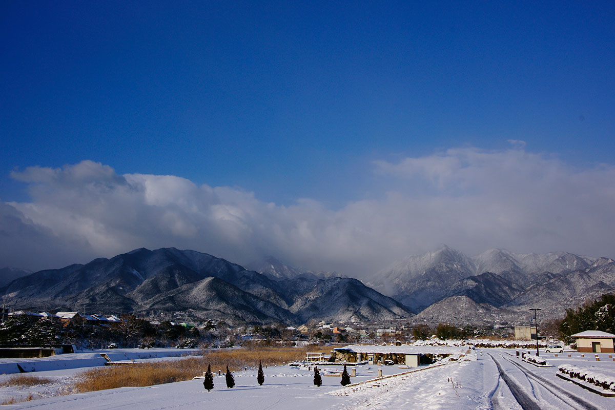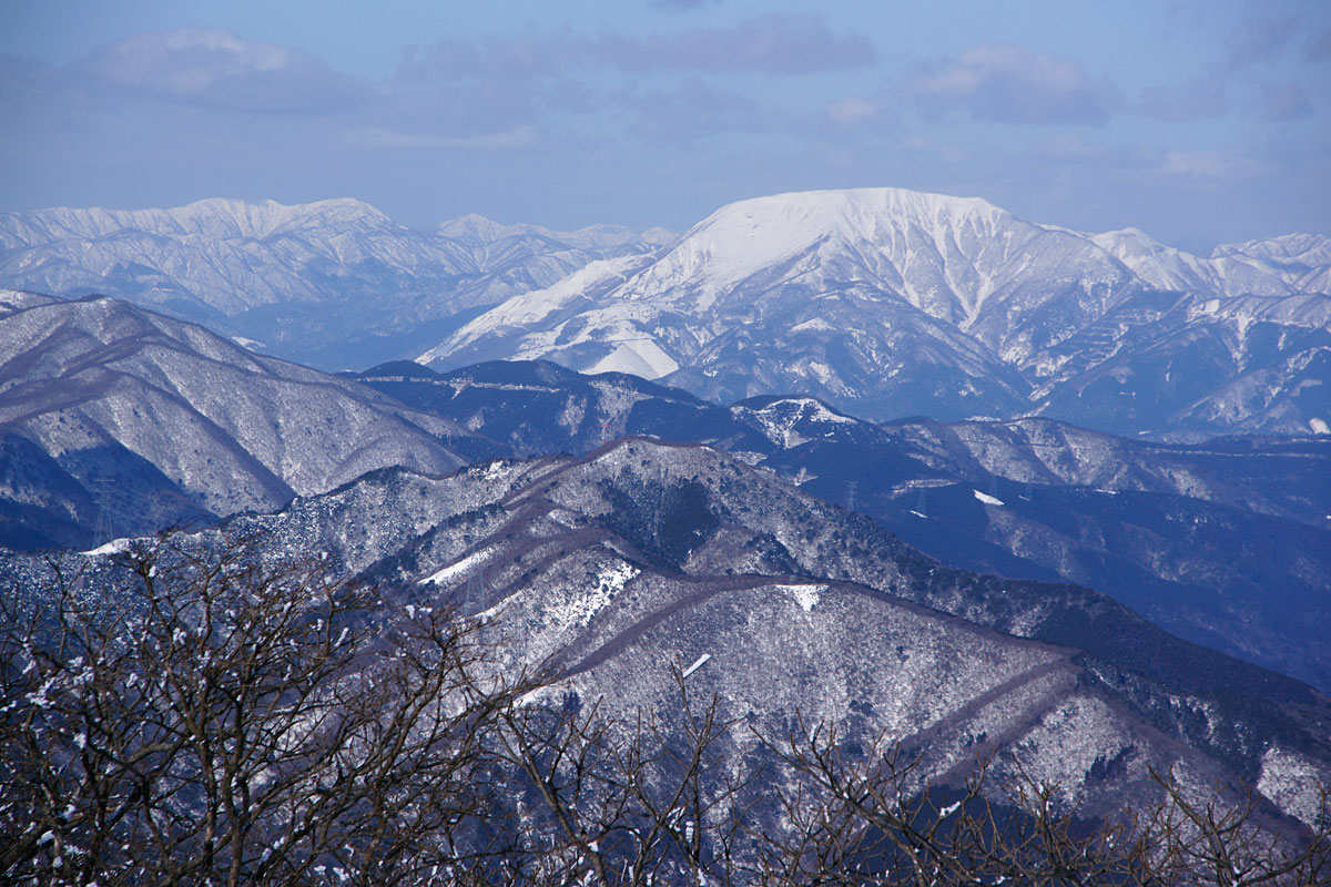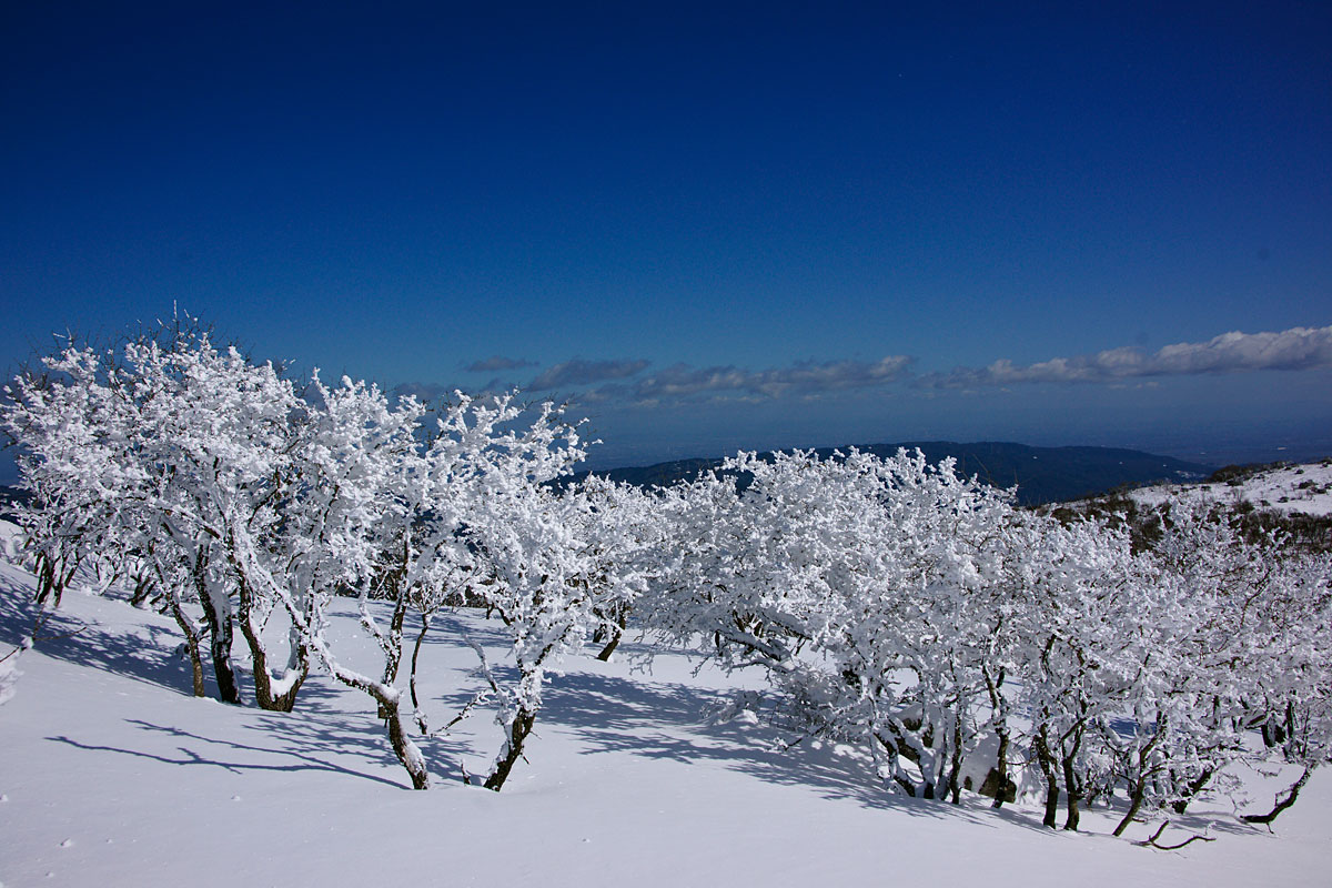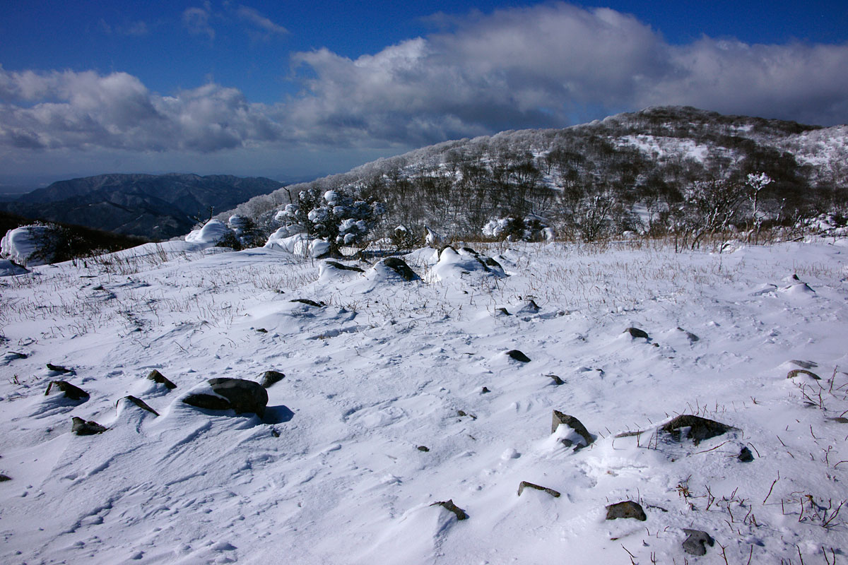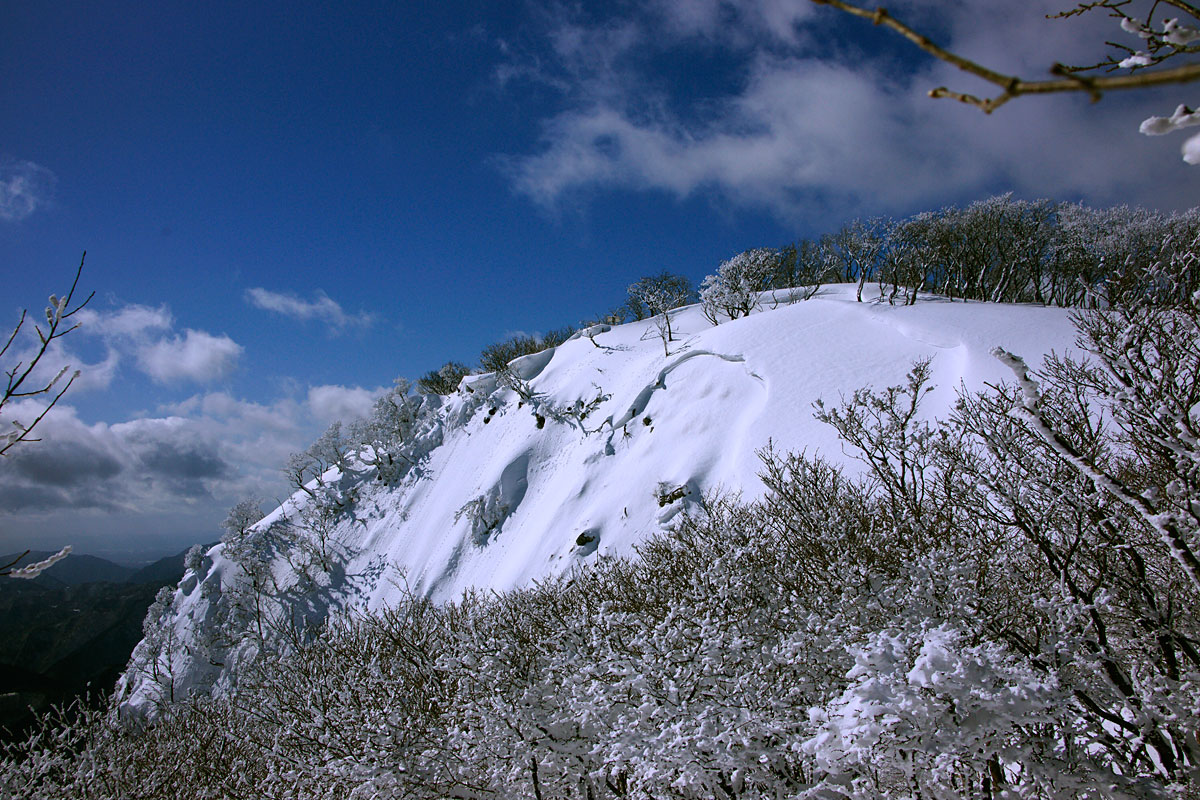 プロローグ 里に雪が降り出すといよいよ冬も終わり。この寒波を逃せば、今年はもう鈴鹿の雪山が楽しめないかもわからないので、今週は取材をさぼって、鈴鹿北部をめざした。例年なら迷わず、御池岳を目指すところだが、今回はうさぎをつれているのであまり無理ができない。そこで人出の少ない竜ヶ岳を目指したが、積雪のために駐車場に車を入れることができなかったので急遽、目的地を藤原岳に変更した。 アプローチ この日は平野部でも積雪があり、フロントガラスの雪を払い、氷を溶かしてから出発。普段は無用の4WDだが、積雪時は頼もしい。アクセルを踏み込むと瞬時に4WDのスイッチが入る。減速時はABSが、コーナーでは横滑り防止装置が作動する。なかなかおもしろい。山に向かう途中では、雪に足をとられクラッシュした車を何台も見た。いつもより慎重に運転し、竜ケ岳の登山口となる宇賀渓谷の落合橋に到着したが、除雪で路肩に雪が積み上げられていて、駐車場に車を入れることができなかった。竜ケ岳にこだわっていたわけでもないので機転を利かし急遽、目的地を混雑が予想される藤原岳に変更した。 大貝戸 登山口を入るとすぐに積雪があった。この日は先行者がかなり入るようで、よく踏まれているので歩きやすい。しめった重そうな雪だがまだ気温が低いのでペタつき感はない。二人とも体調はまずまずで、レイヤーで温度調節をしながら1時間少々で8合目まで登った。このあたりから積雪が増してくるが、先行者が多いようなのでトレースができている。念のためにスノーシューを装着したが、避難小屋までは不要だった。 避難小屋 この寒波で雪が供給されたので、山頂部は一面の銀世界になっていた。小屋を覗くと満員御礼だ。少しお腹が空いてきたので、軽くパンで食欲を満たし、とりあえず天狗岩まで行くことにした。途中で春日井から来た女性とウサギが仲良くなり、行動を共にすることにした。