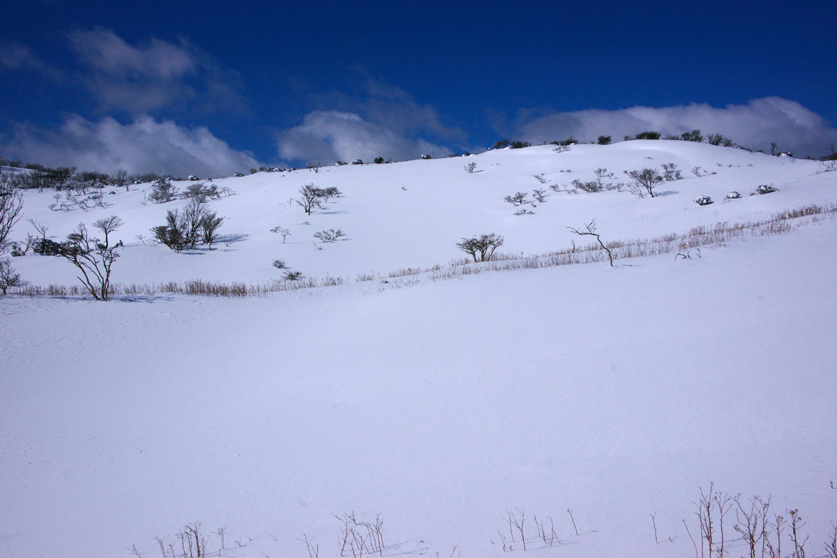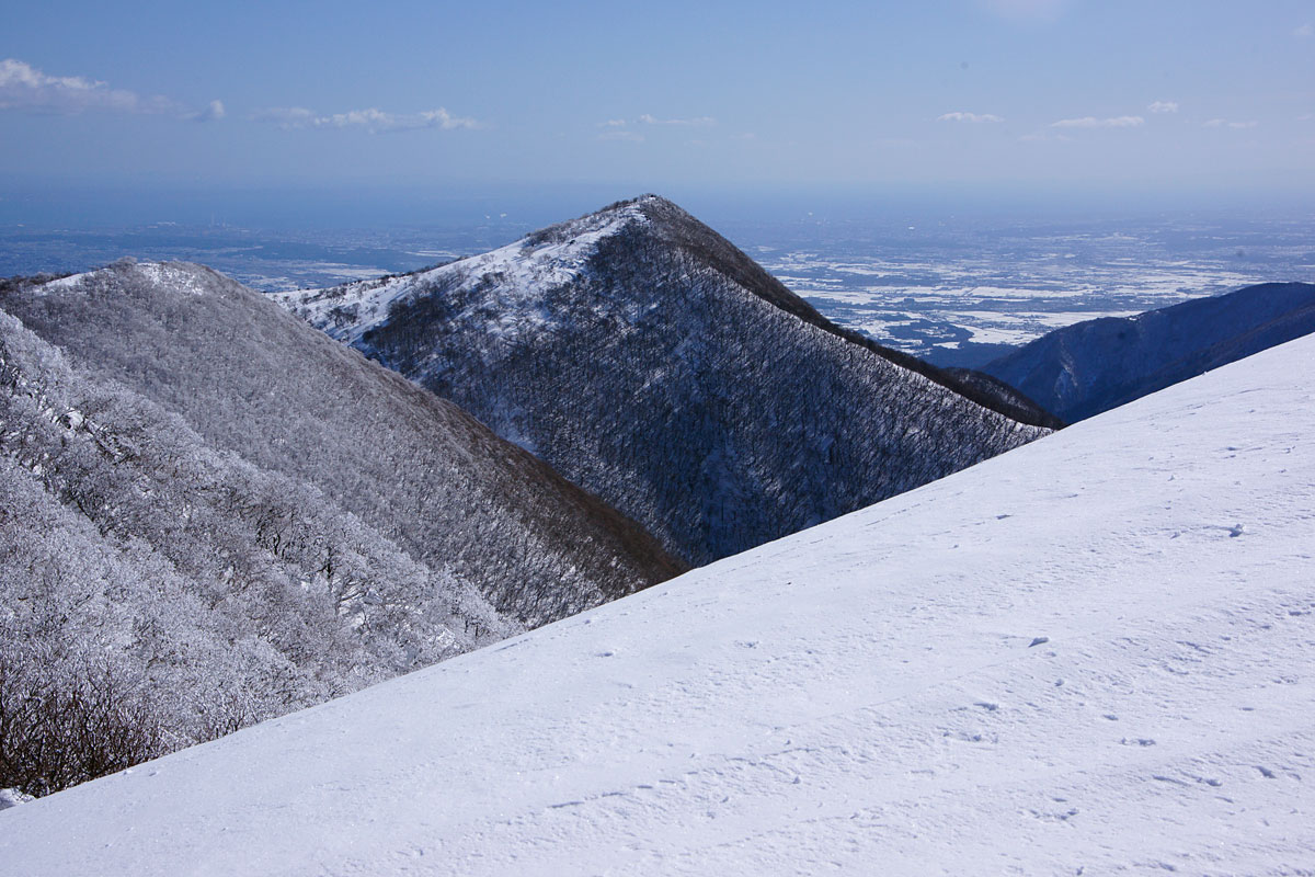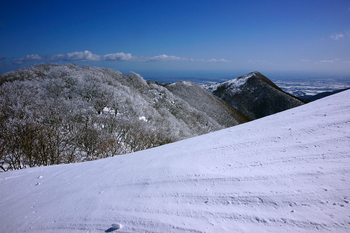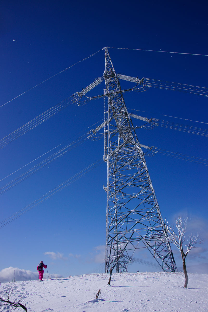 縦走路 さてここまでいいペースで来たので、頭蛇ケ平まで行き、木和田尾根で降りることにした。2人ほどのトレースがあり、一人はワカンで、ほう一人はつぼ足のようだ。我々はトレースを追わず、新雪を思う存分楽しみながら、鉄塔を目指してトレースしていった。天狗ー頭蛇の間は人もほとんど入らず、穴場かもしれない。遠くまで遠征しなくても、この稜線で十分楽しめるということだ。