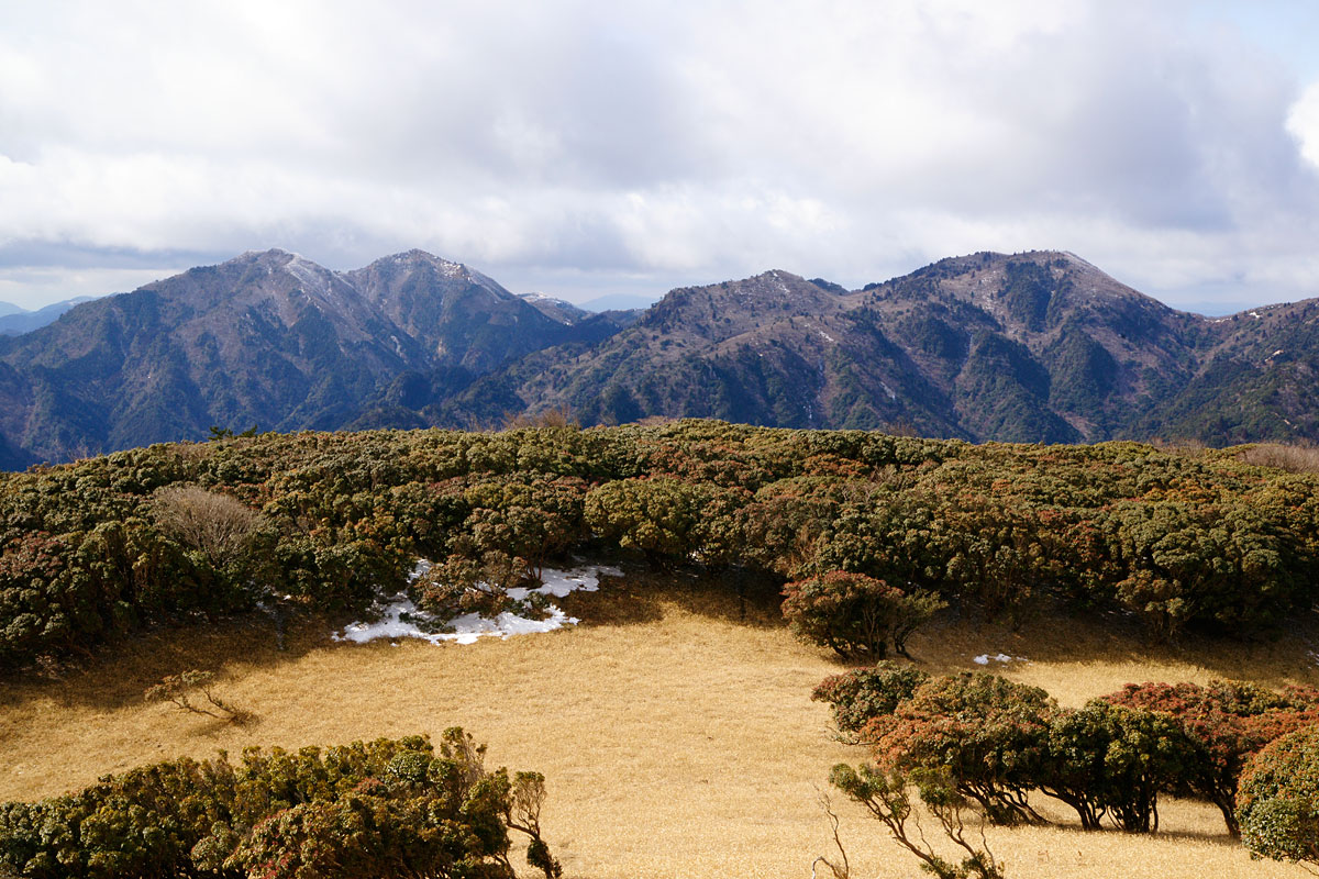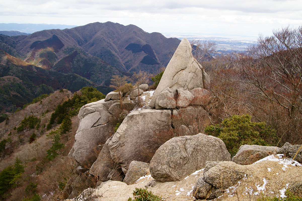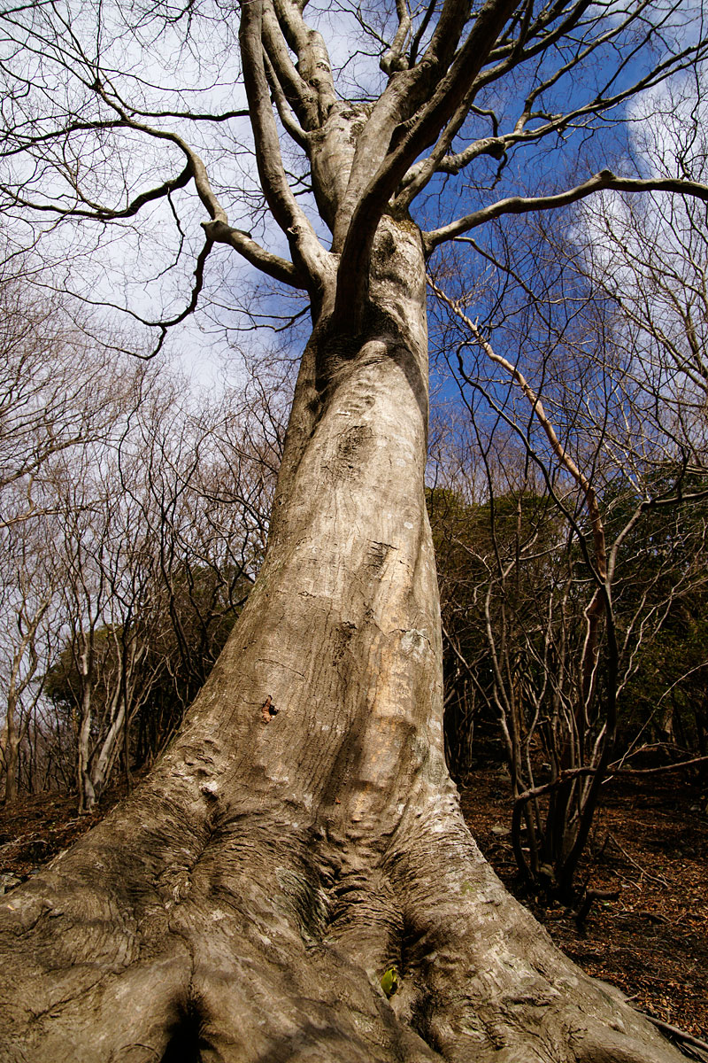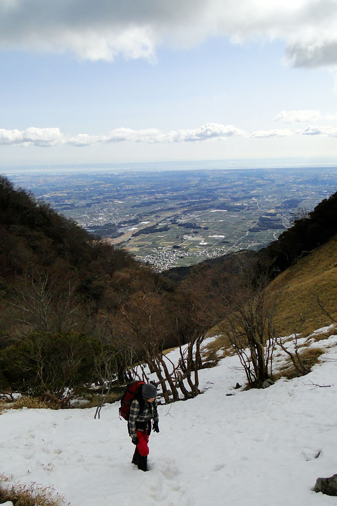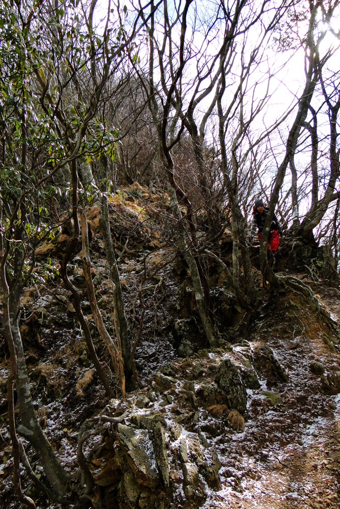■入道ガ岳(鈴鹿) 2010年2月13日 No.532 つくだにさん、隊長 プロローグ 根を詰めて取材山行を続けてきたので、少し気力が落ちてきた。昨年は雪にこだわったが今年は、別の課題があったので、雪に関しては少し淡泊になっている。少し冷え込んだので樹氷も楽しめそうだが、思い切って初物を探しに出かけた。 プラン uttyさんは今回、スキーに行くみたいなので不参加になり、つくだにさんと二人になった。単独ならどうしても、出発地点に戻るルートになってしまうが、車が二台あるので一台を小岐須の祓塚に回しておくことにし、帰路はイワクラ尾根を通り、仏岩と重ね岩を見物して帰ることにした。 出発 堰堤の駐車場は登山者の車が数台駐まっており、10人ほどの若いグループが出発の準備をしていた。他のグループは二本松尾根の方へ入って行った。若いグループは我々と同じ、井戸谷コースのようだ。このコースを使うと最短で山頂に立て、せっせと歩くと1時間強で登ってしまう。まだ9時前だし、ピークハント目的の山行でもないので、若者グループに先に行ってもらうべく、道端で追い越していくのを待った。 寒気は入ってきているが、日射しには力強さが感じられるようになってきた。木々が芽を吹き、葉が日射しを遮るまでに、春の草本は芽を出し、結実しなければ生き残れない。融雪を待ち、光のエネルギーを捉え、やがて一斉に咲き出すだろう。今年もまた、春がやってくる。2月の後半から咲き出し、7月の後半には3000mのアルプスの頂まで咲き上がっていく。 井戸谷 井戸谷も通報ポイント6あたりまでは雪が溶けていた。上部の灌木帯を抜け、笹原(ミヤコザサ)に入ると残雪があった。寒気が入り気温が低いので、よく凍り付いている。ときおり青空が覗くが、天候は回復途上にあるのか、冬雲がアラレを運んできている。笹原に入ってからの30分は急勾配で登りがきつい。立ち止まり振り返ると、平野や伊勢湾がよく見えている。空気に透明度があるようだ。 アセビ 山頂部に上がると風が冷たかった。笹原にアセビが群生する、入道ならではの景観が広がる。アセビも赤い花芽を出し始めている。鈴鹿主稜線の山々の頂は樹氷がついているようだ。空気の透明度が高いので、三角点峰(山頂)に立ち、ぐるっとひと回りするとパノラマ展望が楽しめた。 入道岳 三等三角点の記 点名:入道岳 所在地:鈴鹿市小岐須町1191 所有者:小岐須森林組合 選点:明治23年5月23日 埋標:明治23年6月5日。点名は入道ケ岳ではなく、入道岳だ。「ケ」と「ガ」があるが、山と渓谷社ではガに統一している。 奥宮 入道には3つの峰があって、最も標高があるのが奥宮のピークのようだ。風の強い三角点峰を避け、奥宮で昼食にした。風裏になり日射しがあるので暖かい。昼食はいつものように、おにぎりとカップ麺。食事に凝った時期もあったが、最近はシンプルな方がよくなってきた。デザートは熊野のポンカン。これがまたおいしい。 イワクラ尾根 さて帰路は、イワクラ尾根を仏岩まで歩き、そこから大岩谷左岸尾根で下る。起伏の激しいイワクラ尾根の最初は痩せ尾根の急降下で、雪が凍結しているのでスリップ注意だ。単独者と男性二人組と行き交った。雪もない、花もない、緑もない中途半端な季節だが、私たちの他にもここを歩いている人もいるものだ。寒気の影響が残っていて、とりおりアラレがぱらぱらと降ってきた。春を待つ紫色に変色したイワカガミの葉が、アラレに埋まっていた。 大岩谷左岸尾根 古代原始信仰の盤座(いわくら)信仰の対象となった仏岩。椿神社では、この仏岩と重ね岩を盤座として扱っている。 仏岩を過ぎるとすぐに大岩谷左岸尾根への分岐がある。以前はほとんど目印がなかったが、今は目印テープで賑やかになっている。邪魔になる灌木をのこぎりで切り払いながら下った。小谷が合流する所で尾根は終わり、谷コースとなる。谷をしばらく下ると白滝が足元に見える。さらに下っていくと松の木谷に合流する。これから先は植林帯となり、趣にかけるが作業道は歩きやすい。最後に谷を渡ると林道に出て、大石橋に至る。てくてく歩いて祓塚駐車場へ。 完 etc 今日、出会った福寿草。花についての記述はあえて記述しません。保護のためです。 |