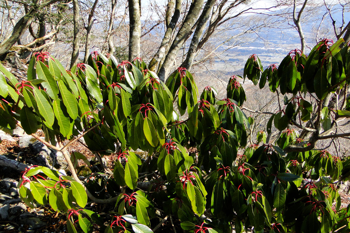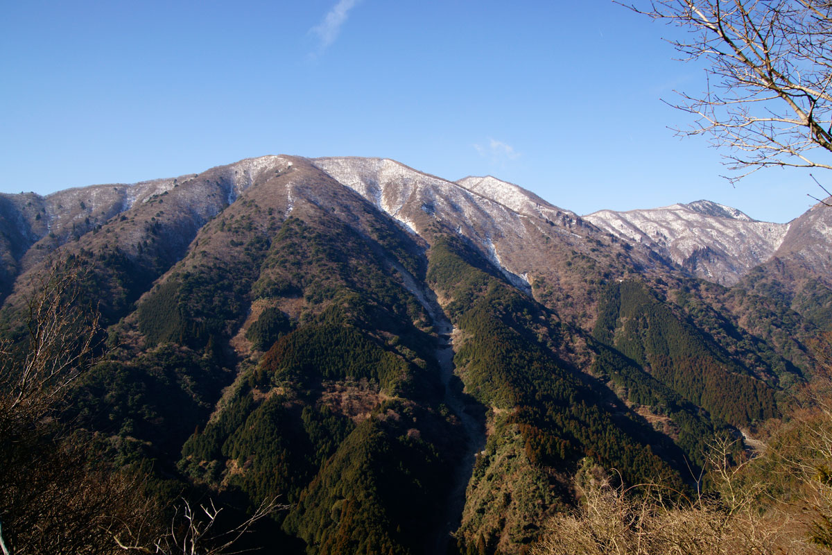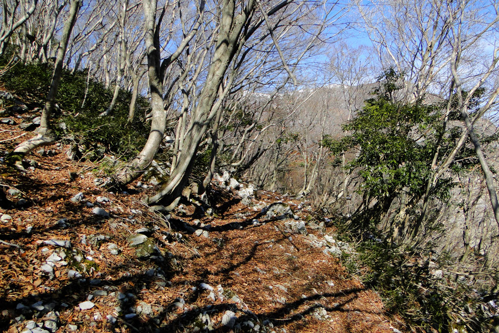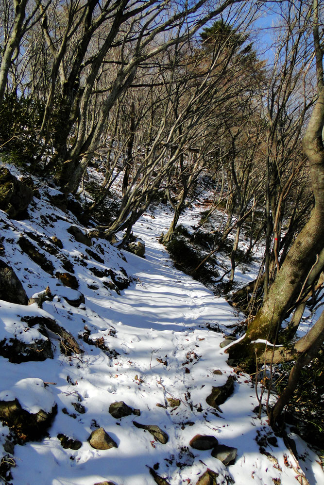 ■孫太尾根(鈴鹿) 2010年2月21日 No.533 隊長 | ページ1 | ページ2 | アプローチ 今回は孫太尾根から県境縦走で周回コースをとる予定だったので、駐車地は、キャンピングパークでもよかったが、いつもの習慣で配水池まで車を進めた。孫太尾根に取り付くには林道からのアプローチもあるが、ネットで見てみると配水池からの方が多いようだ。天気もよく登山日和だが、駐車地は空きだった。早速準備を済ませ歩き出す。 孫太尾根 杉林に入り青川の左岸岸壁まで進むと尾根コースとなる。孫太尾根は鈴鹿でも屈指の長い尾根である。尾根からは、青川キャンピングパーツの施設が俯瞰できる。ここからは15分ほどだが急斜面の登りとなり、標高点387まで続く。ここは神武祠があった所だそうだが、今は、私設の標識が木にかけられているだけだ。鈴鹿の山と谷で調べてもいわれはわからない。おそらく鉱山関係のもので、勇猛で景気のよい神武天皇にあやかりたいからと推測している。さてここで一旦傾斜が緩むがやがて、石灰岩の転がる灌木帯に入っていく。何年か前はコクサギのブッシュになっていて、非常に歩きにくかったところだ。展望もよく、青川を挟んで、長大な遠足尾根や銚子岳と静ガ岳のよく見えている。 丸山 丸山までは、ヤブサンザシ、メギ、コクサギ、オニシバリなどの灌木、シキミ、ヤブツバキ、サカキ、ケヤキなどの多い尾根が続く。丸山手前で石灰岩の急斜面となる。セツブンソウや福寿草を探したが、まだ時期が早いようで、福寿草が1輪、花を開いていただけだった。ミスミソウも葉を出していたので、今年も花を開いてくれるだろう。丸山はC650mの山だ。これを過ぎると大きなモミの木があり、更に進むとコバになっていて、東に降りる尾根が分岐している。「ツヅラ尾」というらしい。以前、下山時に誤ってこの尾を少し降りてしまったことを思い出した。丸山を過ぎると残雪があった。 丸山を過ぎると積雪があった。足跡から判断すると先行者が一人いるようだ。先の方を見ると単独者が下山してくるようだ。尾根を降りてきたので行き交うことはなかった。この先で足跡が消えていたので、おそらく途中で引き返してきたようだ。きっと、花が目的だったのだろう。 草木 緩やかに高度を上げていくと丸山から約50分で草木に到着した。標高点834の独標は「草木」(くさき)と呼ばれている。露出した石灰岩で歩きにくい。樹間からは残雪の藤原岳がよく見えた。 | ページ1 | ページ2 | |