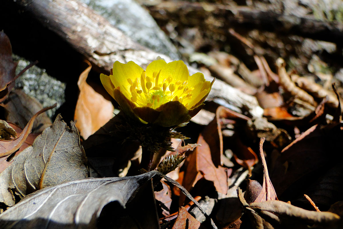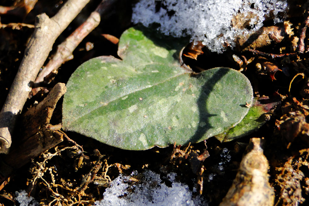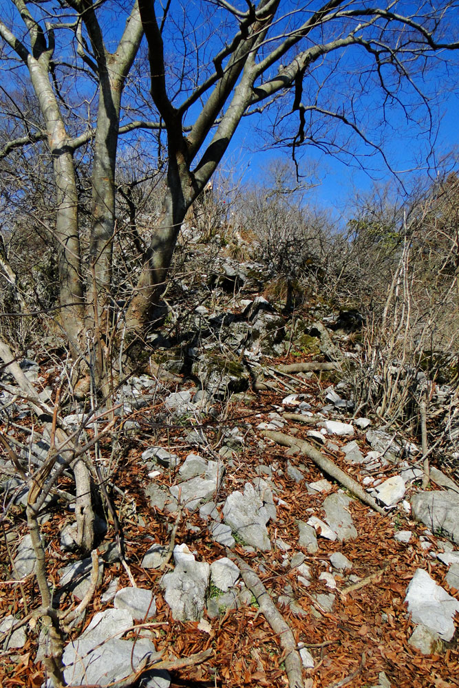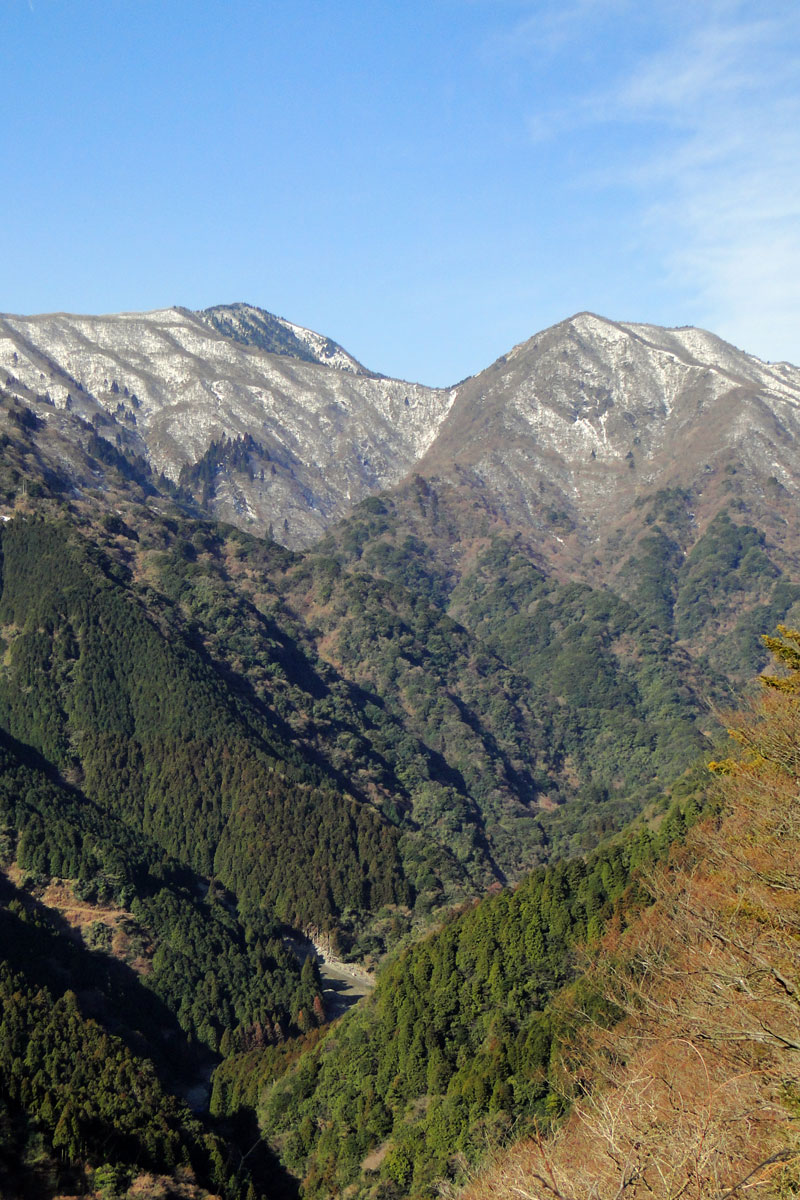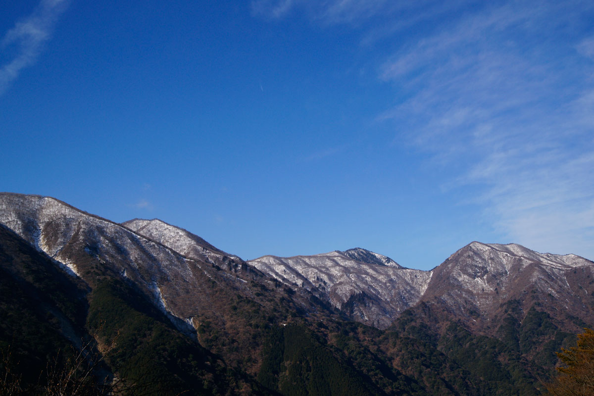 ■孫太尾根(鈴鹿) 2010年2月21日 No.533 隊長 | ページ1 | ページ2 | アプローチ 今回は孫太尾根から県境縦走で周回コースをとる予定だったので、駐車地は、キャンピングパークでもよかったが、いつもの習慣で配水池まで車を進めた。孫太尾根に取り付くには林道からのアプローチもあるが、ネットで見てみると配水池からの方が多いようだ。天気もよく登山日和だが、駐車地は空きだった。早速準備を済ませ歩き出す。 孫太尾根 杉林に入り青川の左岸岸壁まで進むと尾根コースとなる。孫太尾根は鈴鹿でも屈指の長い尾根である。尾根からは、青川キャンピングパーツの施設が俯瞰できる。ここからは15分ほどだが急斜面の登りとなり、標高点387まで続く。ここは神武祠があった所だそうだが、今は、私設の標識が木にかけられているだけだ。鈴鹿の山と谷で調べてもいわれはわからない。おそらく鉱山関係のもので、勇猛で景気のよい神武天皇にあやかりたいからと推測している。さてここで一旦傾斜が緩むがやがて、石灰岩の転がる灌木帯に入っていく。何年か前はコクサギのブッシュになっていて、非常に歩きにくかったところだ。展望もよく、青川を挟んで、長大な遠足尾根や銚子岳と静ガ岳のよく見えている。 丸山 丸山までは、ヤブサンザシ、メギ、コクサギ、オニシバリなどの灌木、シキミ、ヤブツバキ、サカキ、ケヤキなどの多い尾根が続く。丸山手前で石灰岩の急斜面となる。セツブンソウや福寿草を探したが、まだ時期が早いようで、福寿草が1輪、花を開いていただけだった。ミスミソウも葉を出していたので、今年も花を開いてくれるだろう。丸山はC650mの山だ。これを過ぎると大きなモミの木があり、更に進むとコバになっていて、東に降りる尾根が分岐している。「ツヅラ尾」というらしい。以前、下山時に誤ってこの尾を少し降りてしまったことを思い出した。丸山を過ぎると残雪があった。 丸山を過ぎると積雪があった。足跡から判断すると先行者が一人いるようだ。先の方を見ると単独者が下山してくるようだ。尾根を降りてきたので行き交うことはなかった。この先で足跡が消えていたので、おそらく途中で引き返してきたようだ。きっと、花が目的だったのだろう。 草木 緩やかに高度を上げていくと丸山から約50分で草木に到着した。標高点834の独標は「草木」(くさき)と呼ばれている。露出した石灰岩で歩きにくい。樹間からは残雪の藤原岳がよく見えた。 | ページ1 | ページ2 | |