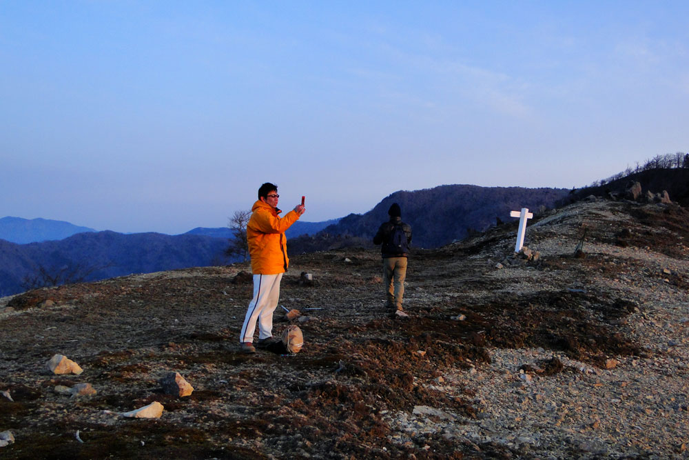 マブシ嶺 息を切らせて登ったが、すでに太陽は水平線の上に昇ってしまっていた。しかし朝焼けがまだ残っていたので、何とか日の出を撮影できた。何事も早い目の行動が大切だと戒める。しばらく日の出の景色を楽しみ大台ヶ原に向かうことにした。マブシ嶺1410.96mだが、点名は「雷峠1」で、住所は「尾鷲市大字相賀字二ノ俣1307」三等三角点で点の記はない。この地域に点名「雷峠2」があるが、坂本貯水池の南方だ。