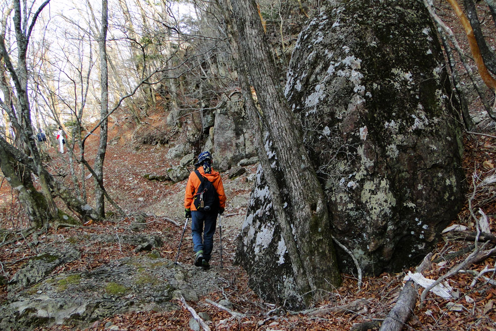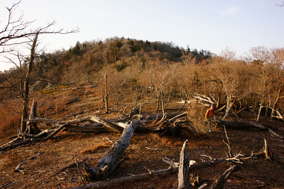 P1362を過ぎると広がりのある緩やかな尾根になる。水の有無はともかくとして、野営適地といっていいだろう。1泊二日の行程なら、一日目にこの辺りまで進んでおいた方が良さそうだ。もう少し進んで堂倉山周辺まで行くと水はとれると思うが、国立公園の特別地区に入ってしまうので野営地にはできない。
