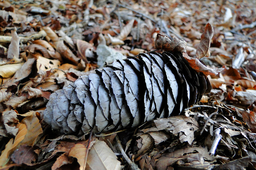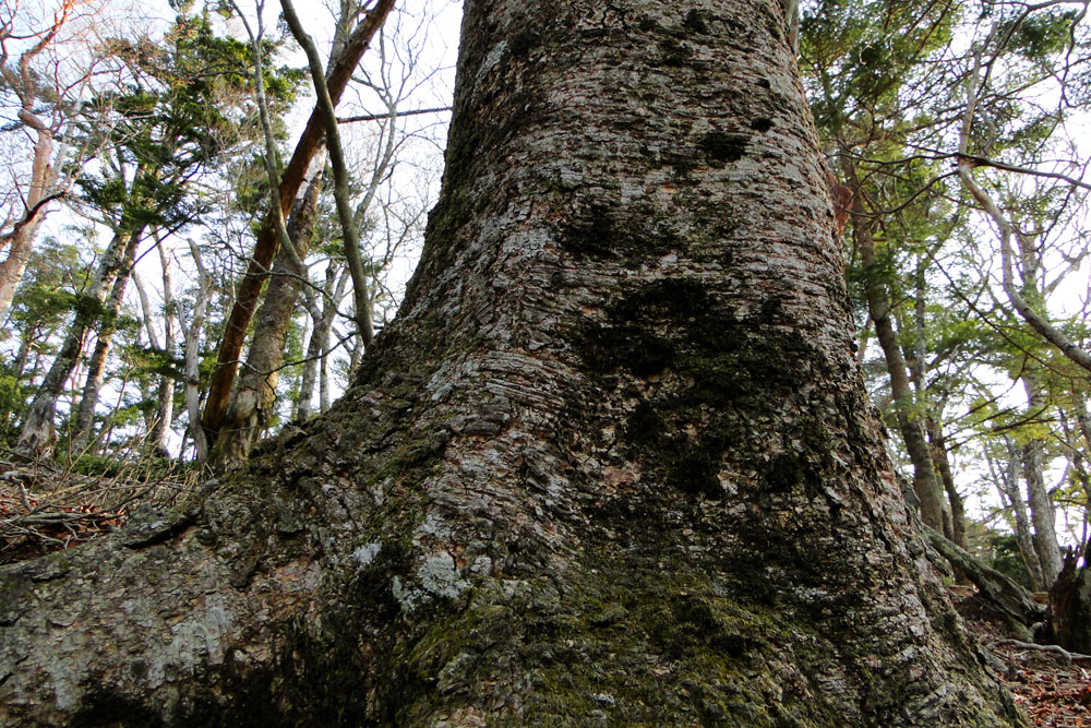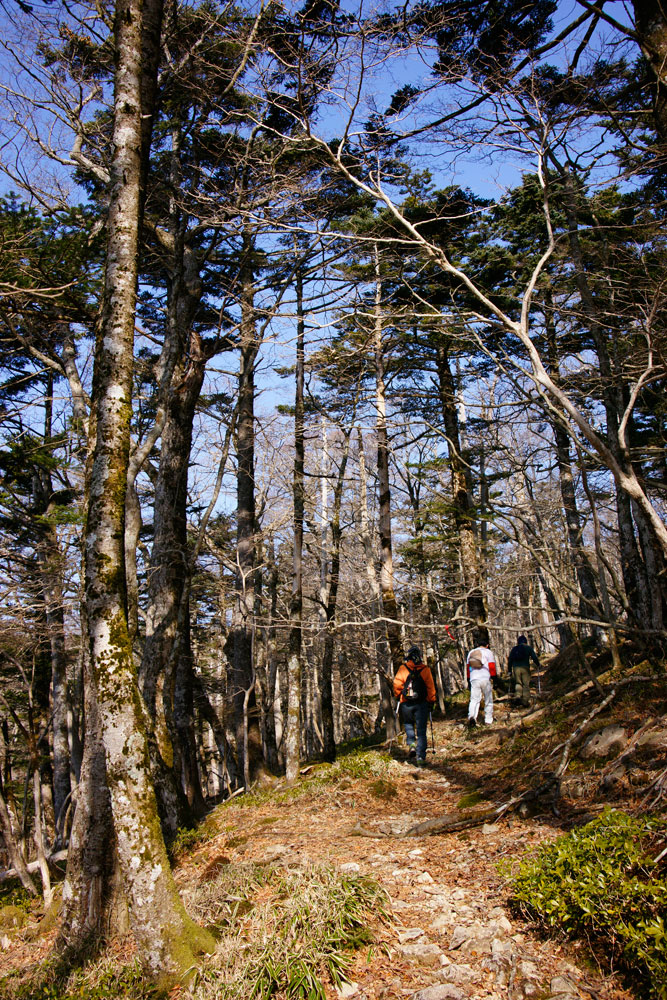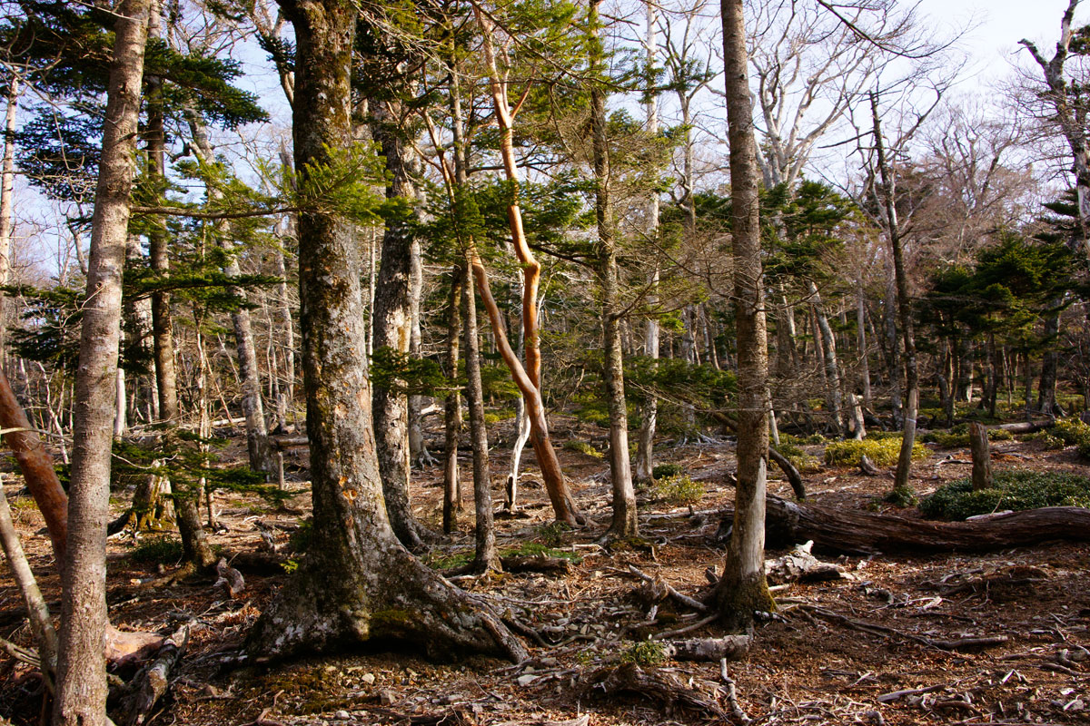 堂倉山 堂倉山が近づくと、小ピークや尾根が絡む複雑な地形になってくる。この辺りの登山道は稜線を通らず、西側のトラバース道となりP1414の南側を通過し、小さな吊り尾根の鞍部から堂倉山の南斜面に入っていく。林床にミヤマシキミを従えたウラジロモミ主体の常緑針葉樹林帯に入り、ブナやミズナラと混成した状態になり、亜高山帯の雰囲気に変わってくる。コースは堂倉山のピークは踏まず、緩やかに登って尾鷲辻に至る。
