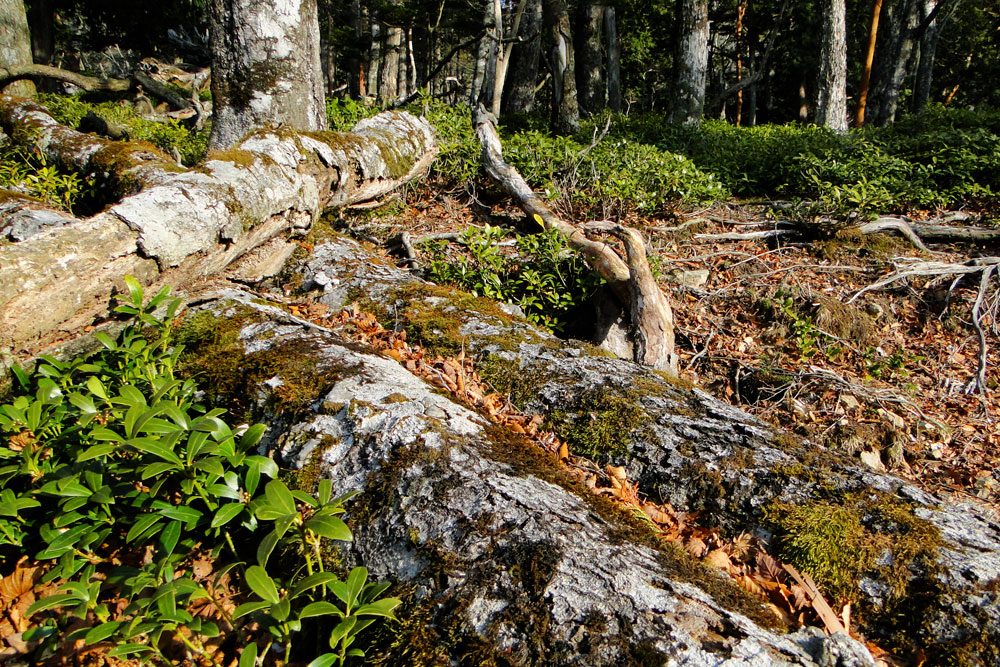 P1362付近 マブシ嶺からP1362までは痩せ尾根が続き展望もよい。国土地理院の地形図を見ると稜線の西側にトラバース気味にルートが付けられているようだが、今回は展望を重視し、尾根芯を歩いた。所々に倒木は見られるが、歩きにくさは感じなかった。また、シロヤシオ、シャクナゲ、アケボノツツジが所々で見られ、春の花の時期が楽しみだ。正面に堂倉山と大台ケ原を見て進み、シロヤシオの老木に感心しつつ歩いていたら、ひとつ尾根を間違えてしまった。すぐに修正し本来の登山道に復帰したが、P1362の手前が崩壊していたので再び稜線にもどった。