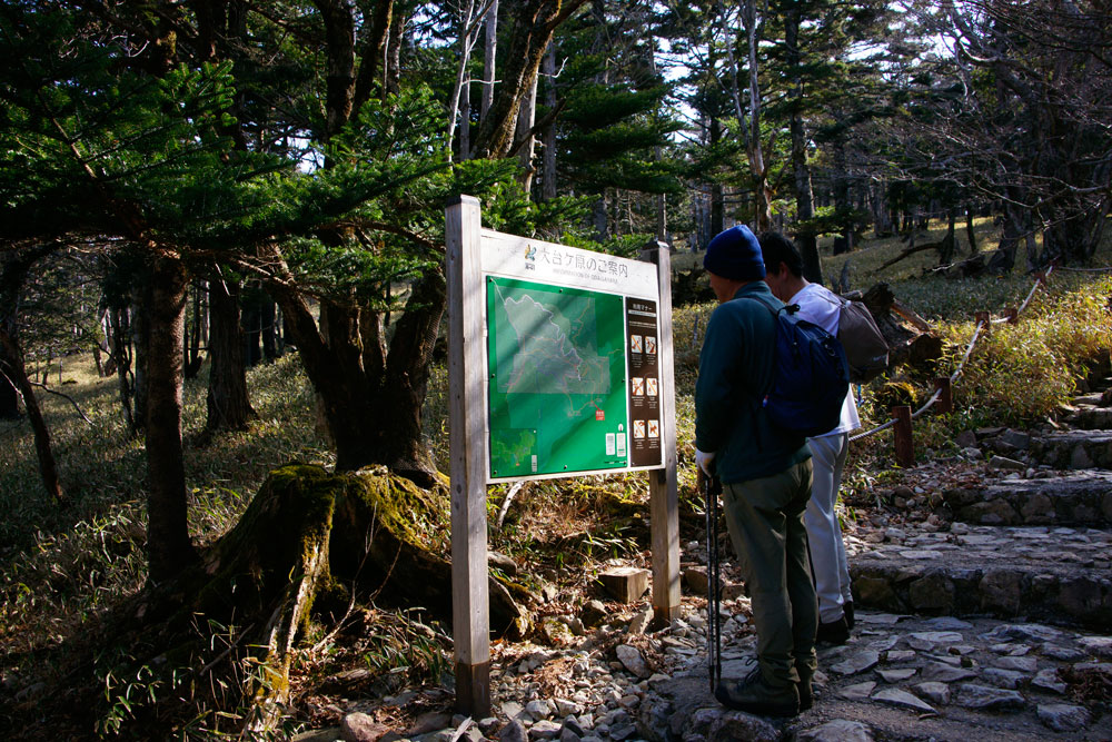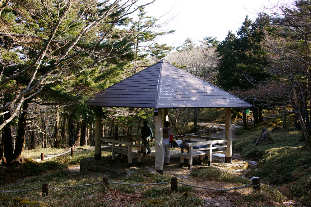 尾鷲辻 傾斜を揺る山に登っていくと、見覚えのある尾鷲辻の東屋が見えてきた。野営地を5時40分に出発し、約3時間で到着したことになる。標高はすでに1600mで、これからは整備された補導を山頂まで歩く。距離は2kmほどだ。当然だが、木道を歩いているのは我々だけだ。これから山頂を往復するが、この日は誰にも会わなかった。