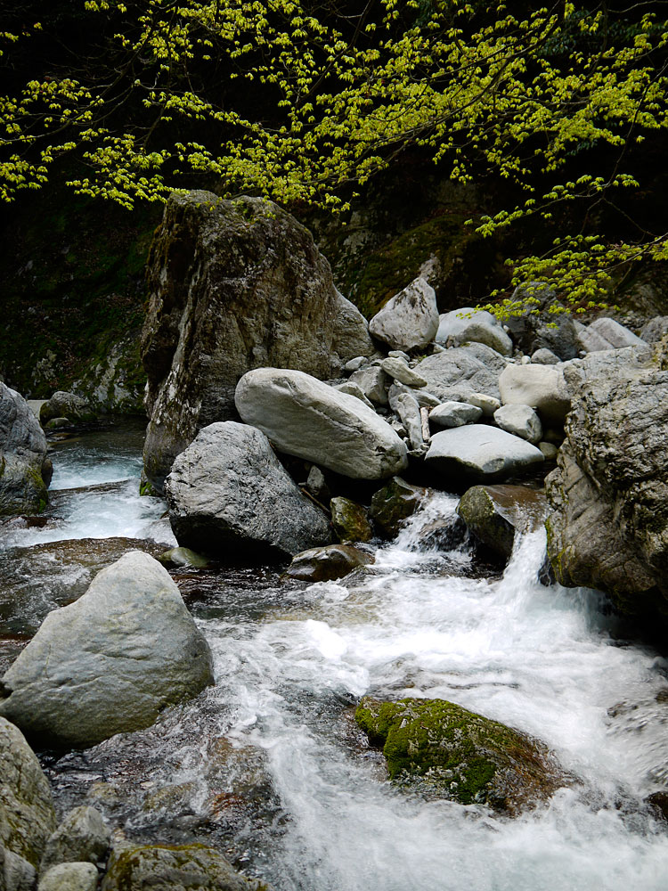 本流には小滝が連続する。降水後なので水量があり迫力を感じる。芽吹き直後の新緑がまぶしい。渓流にばかり目がいくが、足下を見るとヒメレンゲが黄色い小さなたくさんの花を開いていた。アケボノツツジがまだ咲き残っている。以前にもこの季節に歩いたことはあったが、そのときにはすでに落花していた記憶がある。4月に気温が上がらず、花記が遅れているようだ。