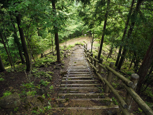 作業小屋登山口(林道三和片川線) 当然のことだが、平日なので登山口に車などが駐まっているはずがない。梅雨の時の晴れ間は大変蒸し暑く、エアコンの効いた車から降りるとむっとした。この時期にこの山に登るは、好き者呼ばわりされそうだが、締め切りのせまった取材なので仕方がない。林道の終点には数台の駐車スペースがあった。登山口を見る限り、丸太階段が設置されていて、この先もよく整備されているだろうことが予想できる。登山口から丸太階段を登ると左手に作業小屋が建っていた。このあたりには特に地名がないようなので、作業小屋登山口と呼ばれるようだ。ここからはいきなり標高差100mの下りになり、谷間で一旦降りてしまう。石積みや丸太で階段がよく整備されているが、あまり踏まれていたいようだ。谷に沿って少し歩き、谷を離れて山腹斜面を登ると小滝コースの分岐に出る。コースはよく整備されていて、道幅もあって歩きやすい。地形に従い山腹を徐々に高度を上げていくと傾斜が緩み山頂部に乗ったことがわかる。地形に従い小谷を渡るとすぐに山頂に到着した。このコースはかなり上部まで水がある。もちろんコースが短いので途中で給水することもないが。