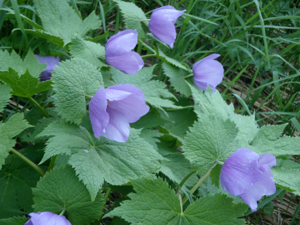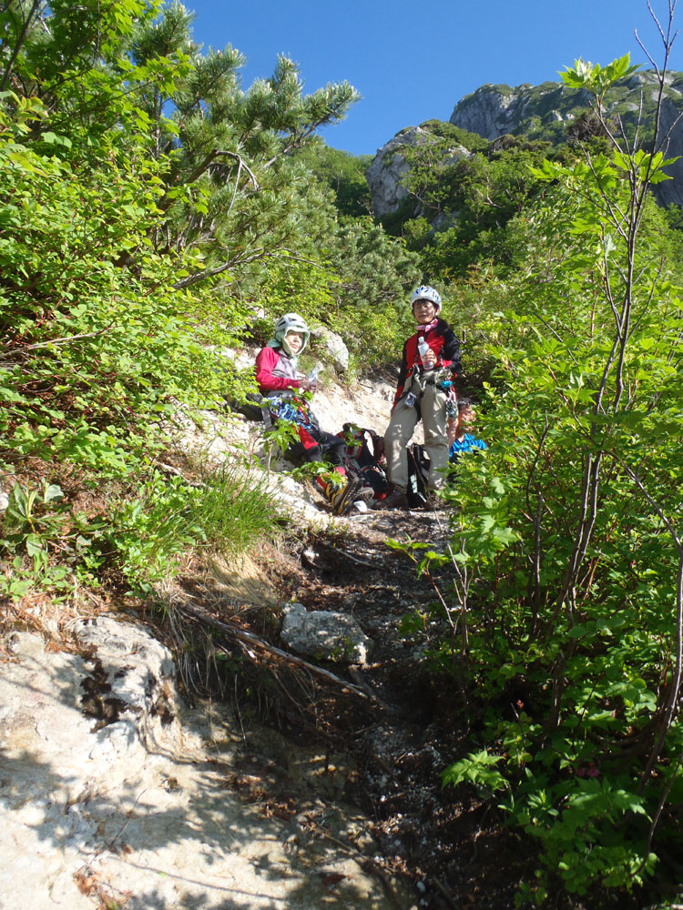 源次郎尾根でヘッドランプが光った。先行パーティーがすでに尾根を登り始めているようだ。我々と同じ時間に下ってきたのは若者2人パーティーだ。八ツ峰Cフェースをやるようだ。後続に2,3パーティーあったが,取り付きで止まらずそのまま下って行ったので,ほとんどは八ツ峰のようだった。 シラネアオイ 源次郎尾根の取付は,平蔵谷との合流点にあり,草付きの斜面のトレースがはっきりとしているのですぐに確認できた。バリエーションとはいえ,よく歩かれているようだ。草付きの斜面にはシラネアオイが花を咲かせており,緊張した心を和ませてくれた。 登攀準備 さて,アイゼンをはずしピッケルをザック収納し登攀具を身に付け準備完了。時計を見るとちょうど5時を少し回ったところだった。草付の斜面のトレースをたどるすぐに岩場があり,さっそくロープを出すことになった。ほんの3メートルほどの岩場だが,W級くらいの1,2手が必要で,中間部にハーケンが打ってあり,ロープがラダーの用に設置されていた。これに足をかけると,上のホールドがとれるが,ラダーの使い方に慣れてないとかえって手こずることになる。終了点にはスリンクがかけてあったので使わせてもらった。私がリードで登り確保した。ウサギが続くが,いきなりテンション。朝露に濡れた岩が滑るようだ。次いてutty,とっちゃんと続き,いきなりの第一関門を突破。 その後も岩と灌木のジャングルの登攀が続く。ほとんどはU級程度なので,確保なしでフリーで登った。ただし,T峰手前のルンゼルートとの合流点までにはV級程度の岩場があり,3回ほどロープを出すことになった。今回は50mロープを2本持っているが,2本出すとロープ操作に時間を食われるので1本でやりくりした。 T峰手前のルンゼルートとの合流点までに要した時間は,休憩を入れると2時間15分だった。後続に2人パーティーがいた。ロープ操作が余分にかかる我々4人パーティに追いついてきたので,休憩中に追い越してもらった。その後ろが3人パーティーと4人パーティーで,我々と同じくらいのペースで後につけていた。 T峰手前のルンゼルートとの合流点まで来ると展望が開け,眼下には平蔵谷が俯瞰でき,高度感が感じられるところだ。岩に腰かけ休憩していると,先ほどの2人グループの声が?峰の平蔵谷側から聞こえてくる。?峰の平蔵谷側は断崖になっているので,堂もルートを間違えているようだ。T峰を見上げると尾根筋を行った方が正解のようだ。後続3人をコルで待たせ,先駆してルートを確かめることにした。ハイマツとの境の岩場を登って行くとなんとか?峰の肩まで行けそうなので,後続3人を尾根に誘導し,肩の南面まで上がり小休止をとった。 さてここからは快適な逆気味のスラブで,上部はハイマツ帯になっている。どこからでも登れそうだが,左手にちょっとしたルンゼがあるのでそこを登ってみた。後続にはロープが必要だったので,時間短縮のために後続にスラブ帯を指示した。ところが上部のハイマツ帯の手前の一手が難しく,結局確保のためにハイマツのジャングルに入ることになった。240センチスリンクで突破したのはよかったが,ハイマツ帯に突っ込み無駄なアルバイトをさせることになった。リーダーの判断ミスを深く反省した。 このルンゼを抜けるとT峰のピークは近い。肩を経てハイマツ帯の岩場を登ると?峰のピークに到着した。2709mの標高点になっていて,狭い岩峰だが,展望を楽しみながらゆっくりと休憩できた。また少し緊張がほぐれたのか空腹感を感じたので,軽く昼食を摂ることにした。ここで3グループの後に続くことにし時間調節をした。 |