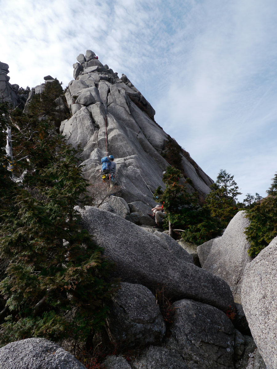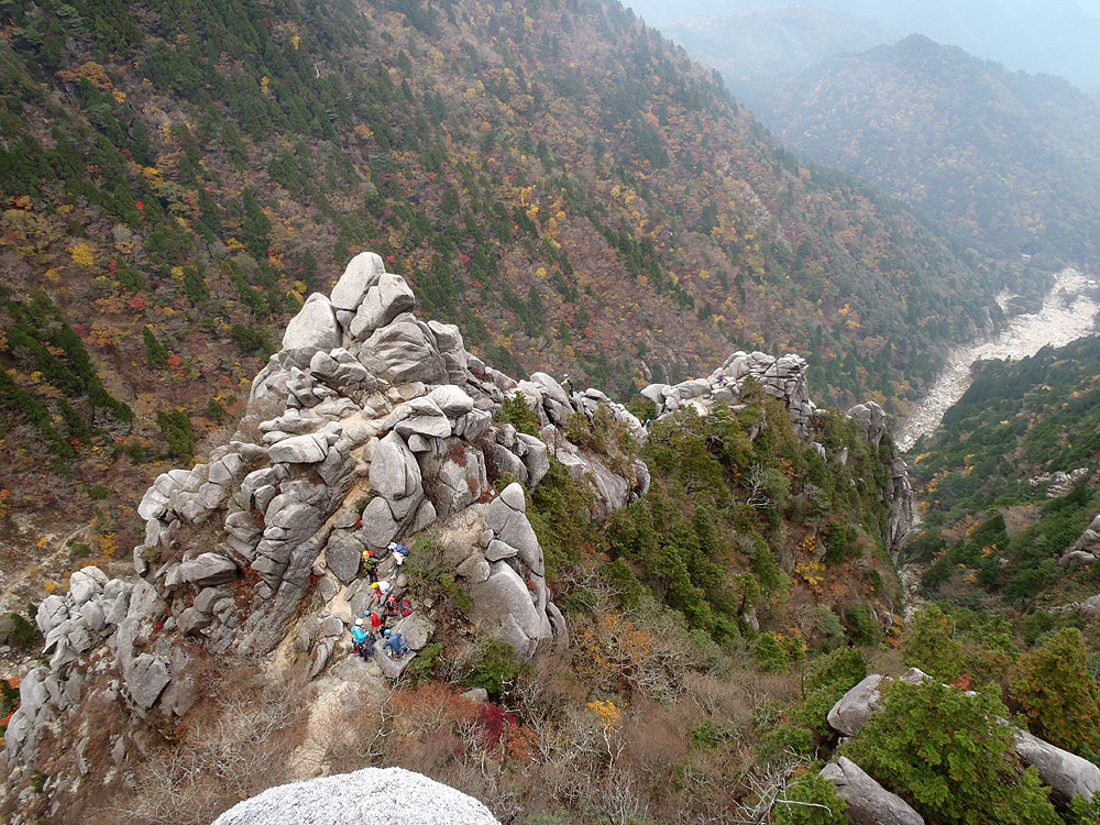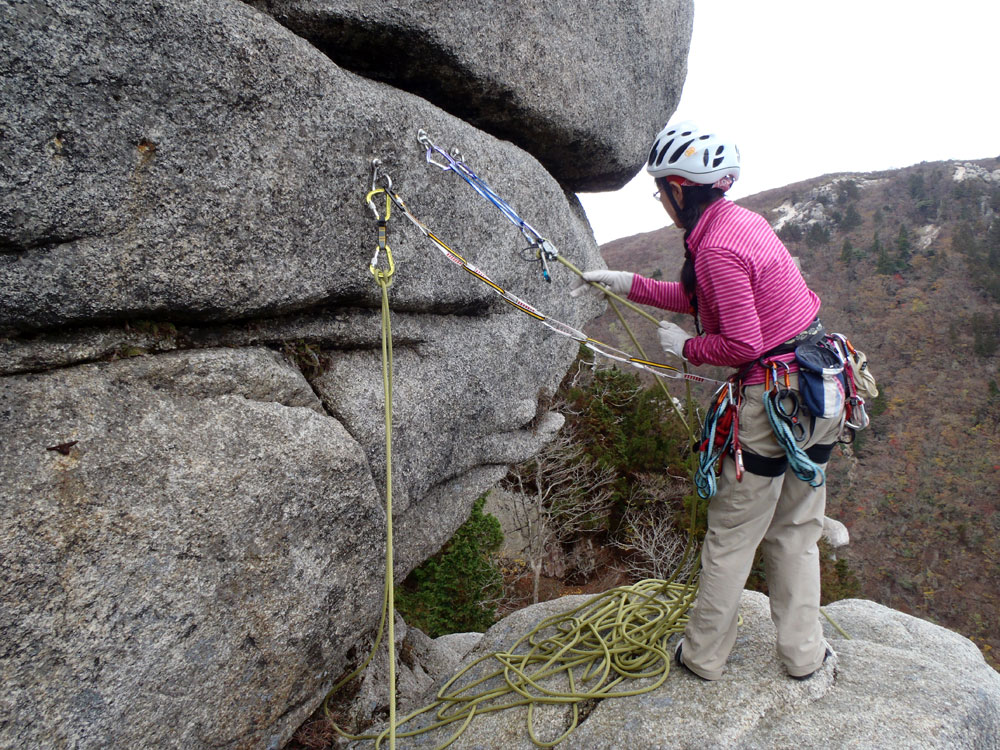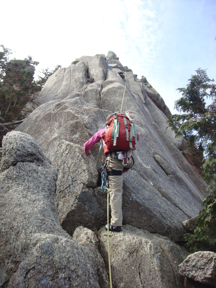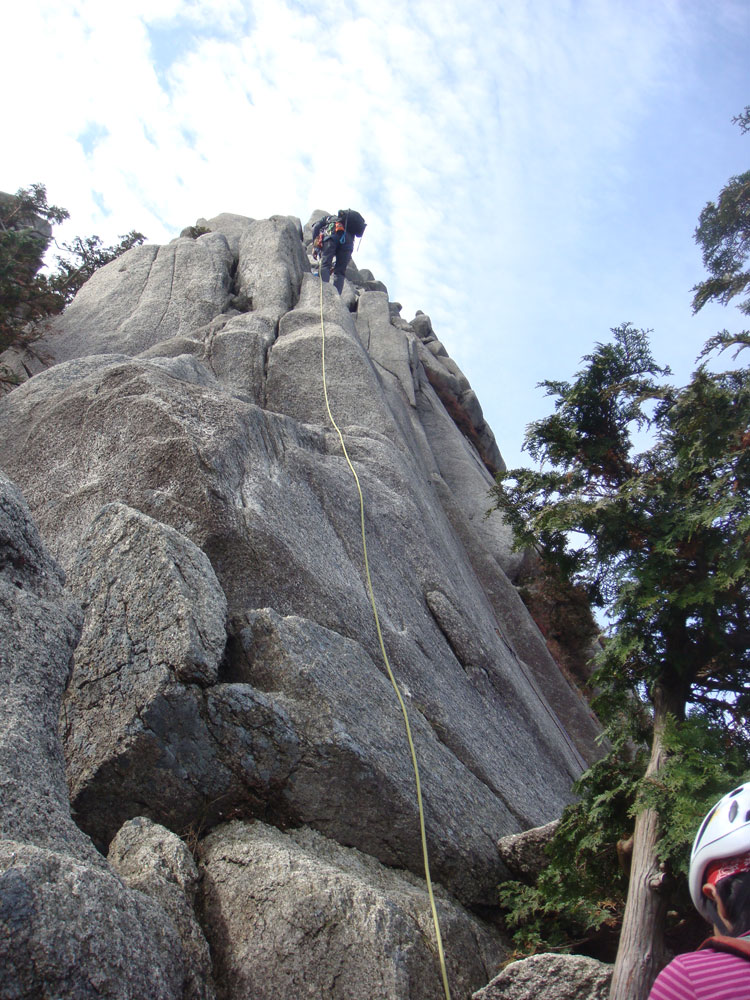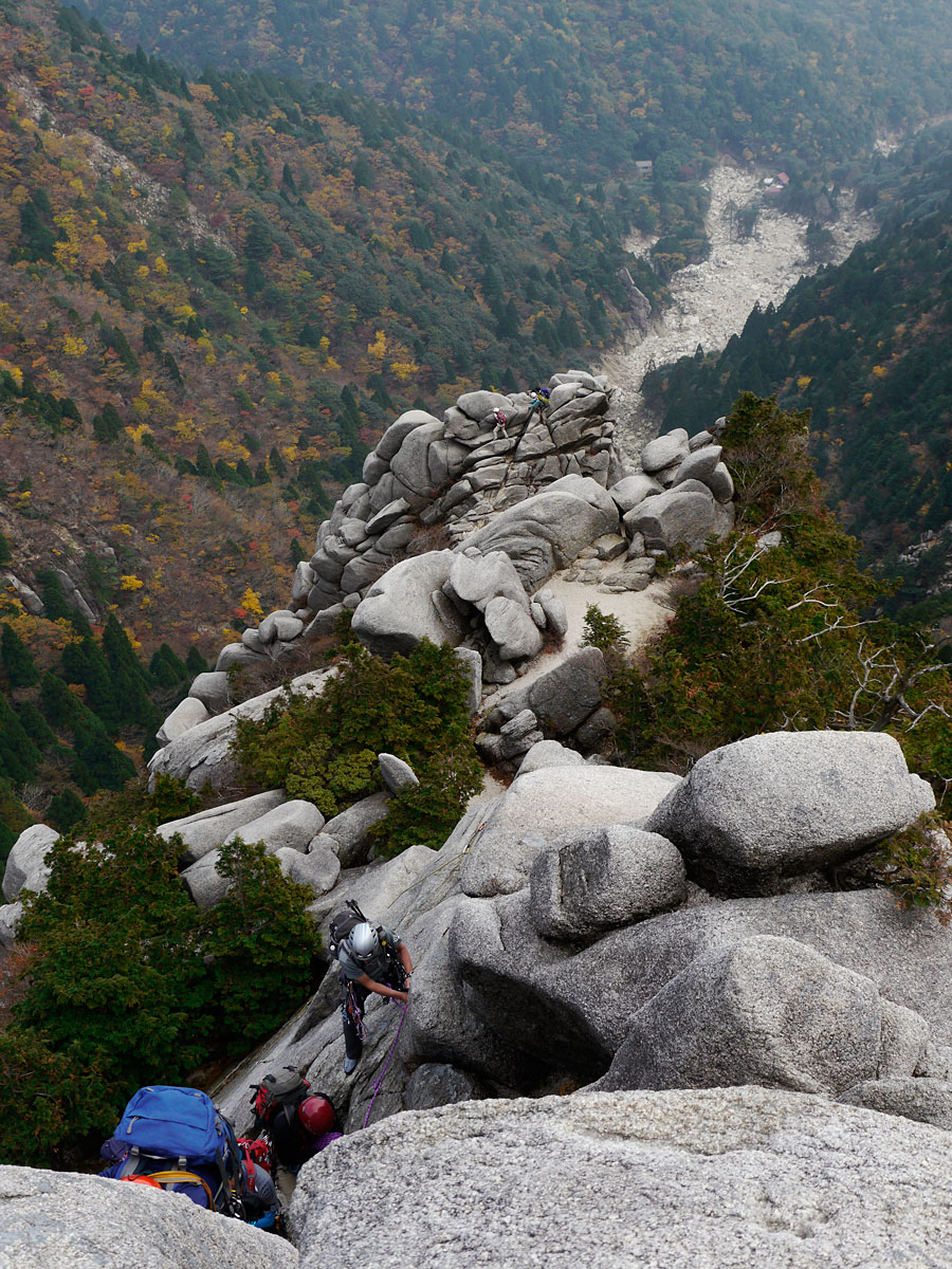 ■前尾根@御在所岳(鈴鹿)2011年11月3日 No.631 とっちゃん、隊長、うさぎ | ページ1 | ページ2 | とやま山歩記さんのレポート P3はコンテで登り、最終ピッチはスタカット。展望がいいところなのでゆっくりと景色を楽しみたいが、混雑しているので先を急いた。 P2ヤグラ ヤグラに到着すると京都の山岳会の人たちが数人、仲間が登り終えるのを待っていた。この待ち時間を利用して急いで昼食。今日は早出をし、前後の気を配りながらの登攀が続いたので行動食もほとんど口にしていなかった。さて前尾根のクライマックスはP2ヤグラ。W級だがクラックあり、フェースありで十分に楽しめる25mだ。しっかりと登って側面を懸垂下降。富山のI&Nさんが後に続く。