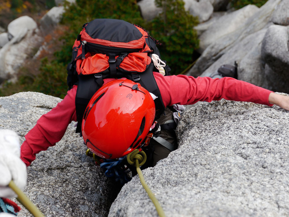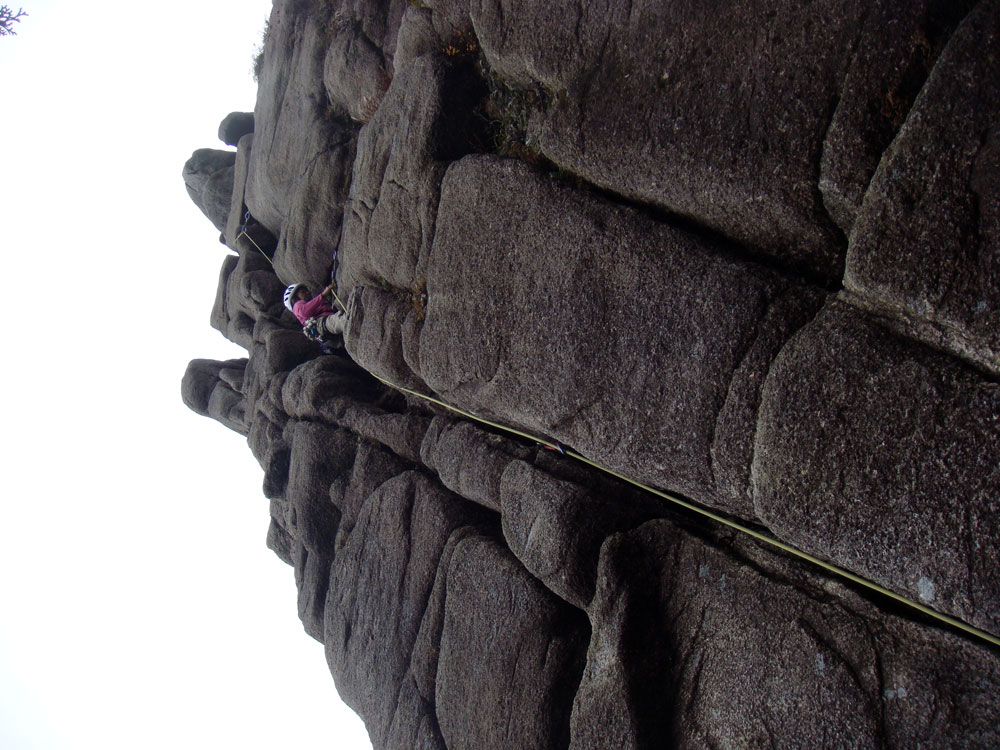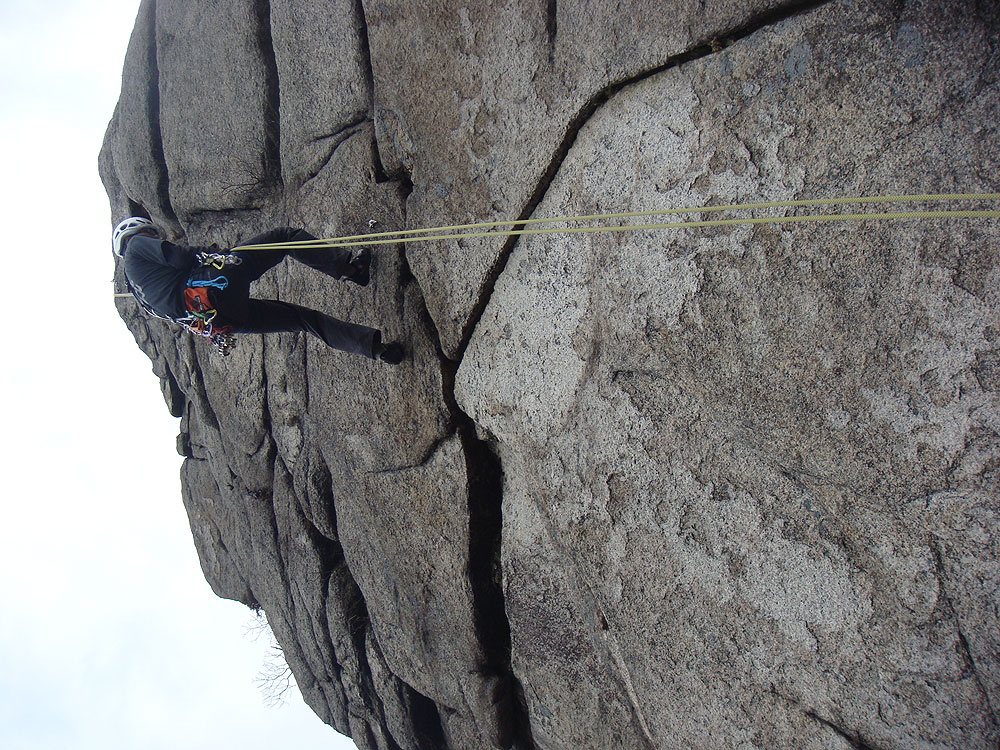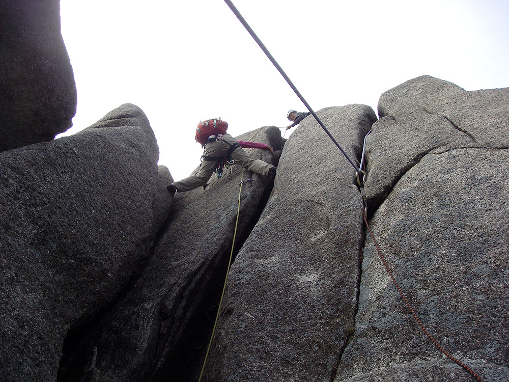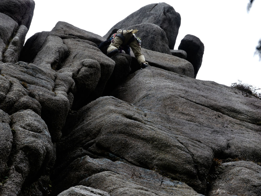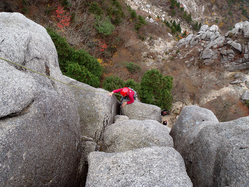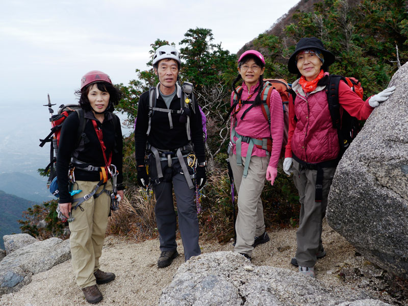 ■前尾根@御在所岳(鈴鹿)2011年11月3日 No.631 とっちゃん、隊長、うさぎ | ページ1 | ページ2 | とやま山歩記さんのレポート P3はコンテで登り、最終ピッチはスタカット。展望がいいところなのでゆっくりと景色を楽しみたいが、混雑しているので先を急いた。 P2ヤグラ ヤグラに到着すると京都の山岳会の人たちが数人、仲間が登り終えるのを待っていた。この待ち時間を利用して急いで昼食。今日は早出をし、前後の気を配りながらの登攀が続いたので行動食もほとんど口にしていなかった。さて前尾根のクライマックスはP2ヤグラ。W級だがクラックあり、フェースありで十分に楽しめる25mだ。しっかりと登って側面を懸垂下降。富山のI&Nさんが後に続く。