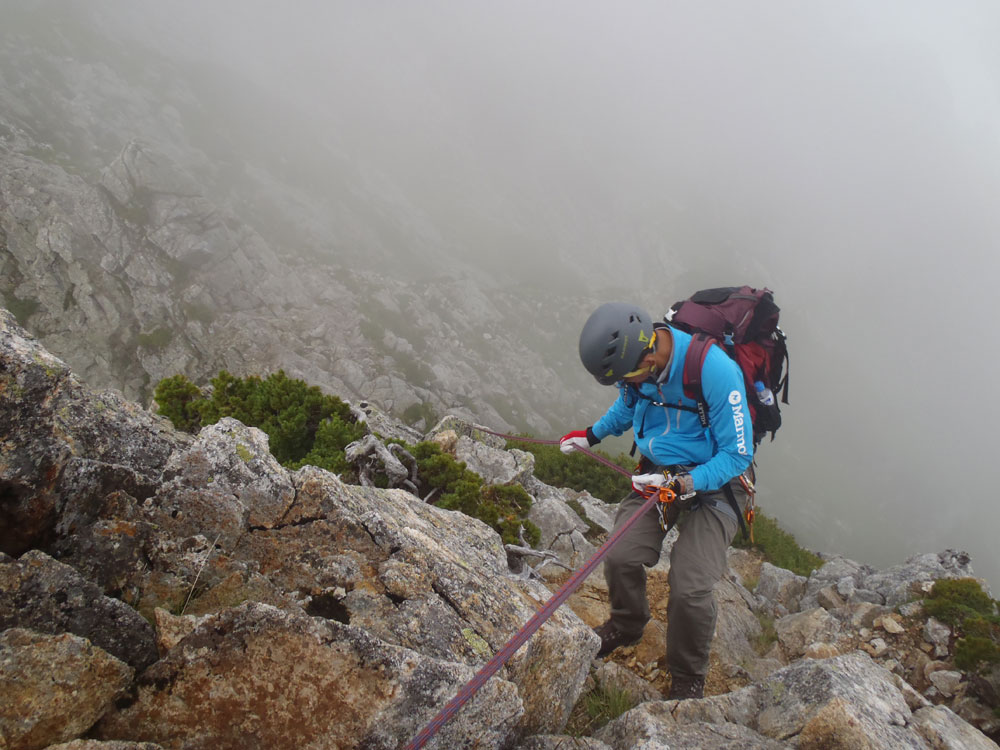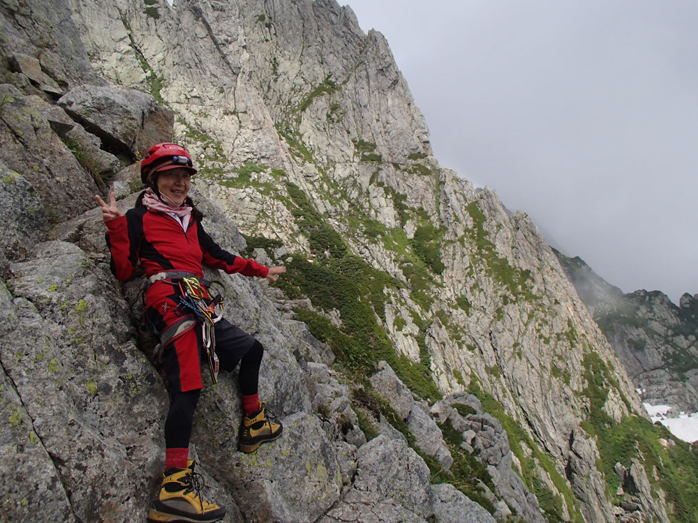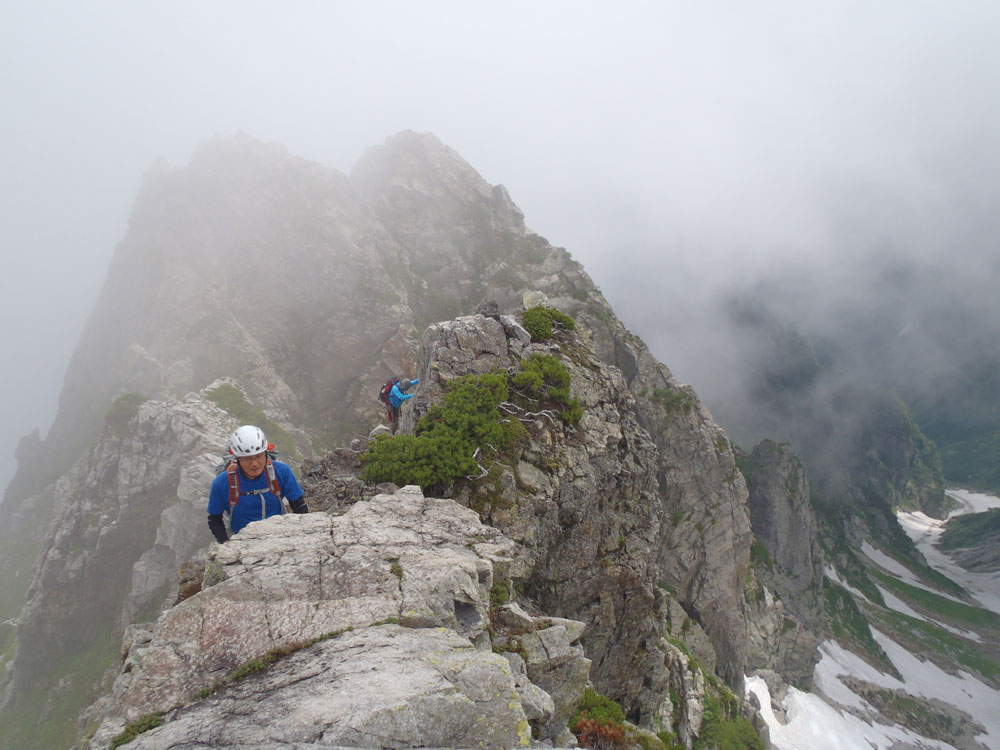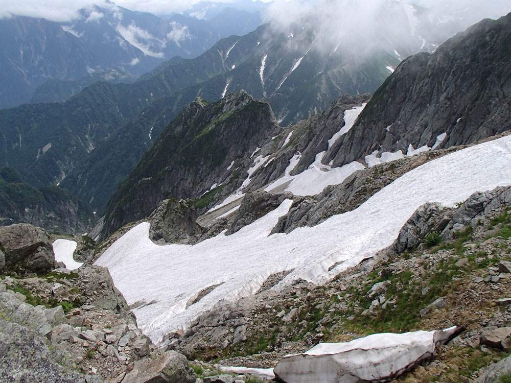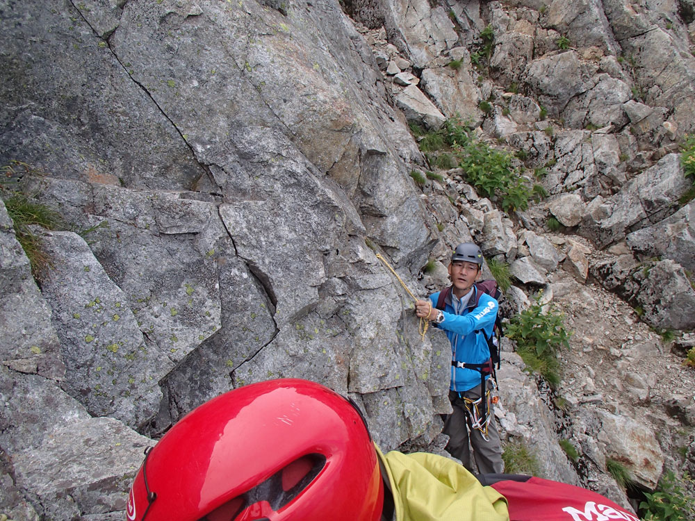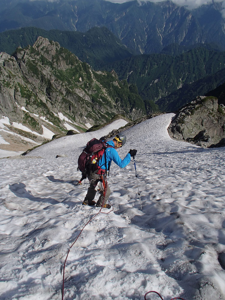 ■八ッ峰6峰Cフェース〜八ッ峰の頭@剱岳(北アルプス)2012年8月17日18日19日 No.687 じんじんさん、隊長、うさぎ 7峰 さて、7峰はゴジラの背のような稜線が続く。三の窓側に巻き道があるようだが、展望のいい岩稜を行くことに。 小さなアップダウンを繰り返しながらピークに立った。この辺りからガスが出てきて、遠雷が聞こえだした。いつでも待避できるように心の準備をした。頭からは懸垂下降。ダブルロープ1本では距離が足りないが、二本繋げると面倒なので最後のクライムダウンで済ませた。今日はチンネに取る着いているパーティーは少ないようだ。こんな日に登れるといいのだが。 8峰 次は8峰だ。八ッ峰上半部の登攀のハイライトといえるだろう。しかし、グレードはV程度なので、今回はコンテで登ることにした。スタカットで登るのが順当だろうが、ガスの遠雷にせかされ、時間短縮を図った。コルから少し三の窓側にトラバースしリッジに沿って登る。プロテクションは中間位置にハーケンが2,3本残置されている。なた、クラックがあるのでカムが使える。 8峰の登りは快適だが、中途半端な懸垂が待っている。昨年は一気に降りようとしてロープ回収時にスタックさせてしまった。その時は後続パーティにロープを外してもらったが、今回は、上半部に居るのは我々だけだ。その反省から2回に分けて懸垂することにした。急がば回れだ。 八ツ峰の頭 懸垂で8峰から狭いコルに降りると長次郎側のバンドを少しトラバースし ルンゼに取り付くことになる。最初にハーケンがある出口にカムでプロテクションをとり、念のためにスタカットで登った。バンドからルンゼにロープが90度折れるので、引き上げがやたらと重くなった。予定通り八ッ峰の頭に到着、時計を見ると 12時30分だ。昨年は確か11時30分だったように記憶している。1時間遅れのようだ。これからまともに剱に登っていると、帰着が7時を過ぎてしまうことになる。さてどうするか。とりあえずは、池の谷乗越まで懸垂で降りてからだ。前回懸垂は、ルンゼに降りてしまい、落石の巣窟を肝を冷やしながらクライムダウンしたので、今回は、ルンゼの手前で一旦ピッチを切って他のルートを探した。少しトラバースするとしっかりとしたクライムダウンできるフェースがあり、安心して池の谷乗越に降りることができた。シコタンソウがきれいに咲いていた。 北方稜線 さて問題は時間だ。 最短で剱沢に戻るには、ここの乗越から長次郎右俣で降りるのがいいと思うが、八ッ峰から見下ろしたところ、雪渓はズタズタになっていて、とても危険だ。とりあえずここからは、一般登山道で剱岳を目指すしかない。遠雷が収まりかけているので、時間がかかっても剱岳経由でもいいのだが。ガスはまとわりついていて、見通しがきかない。とりあえず、長次郎の頭まで行くことにした。ここで一般道ということで安心感があったのかルートミス。行きつ戻りつ30分のロスタイム。長次郎側の危険箇所はよく雑誌にも紹介されている所。持参したロープスリングをサービスでハーケンに通しておいた。しかし、ますます時間がなくなってきた。とりあえず長次郎左俣までと思ったが、雪渓がうまくつながっているところがあったので、剱岳経由から長次郎雪渓の下降に切り替えた。 長次郎谷右俣のコルまでは行かなかったが、 雪渓がつながっている所から下降を開始した。最初は傾斜がきついので、4ピッチ200mはロープを出して下った。岩場よりも遙かに雪渓下りの方がリスクが高い。慎重に下ったので熊の岩まで2時間を要してしまった。雪渓の下降により時間の短縮を図ったつもりだが、結果としてほぼ剱岳経由と変わらなくなってしまった。このあたりの判断は難しく、経験を積むしかない。 16時間行動 長次郎出合には17時10分に到着した。さてここから標高差500mの登返しがある。行動時間はすでに13時間を越えていてるが、がんばるしかない。雪渓を半分ほど登返したところで、間違えて斜面に取り付いてしまった。ここでまたルートミス。30分のロスタイム。ヘッデンを点けて雪渓を離れ谷に入ると剱沢小屋から夕食の揚げ物のいい臭いが流れてきた。40分がんばってやっと小屋まで登りかえしとりあえず缶ビールを購入した。 テント場に戻ると20時になっていた。なんと16時間行動になってしまった。この間の食料はパン1個と行動食少々、水1リットルだった。人間やればできるものだ。20年以上山をやっているが、これほどの長時間行動は過去になかった。今後の山行プランの参考にしたい。 |