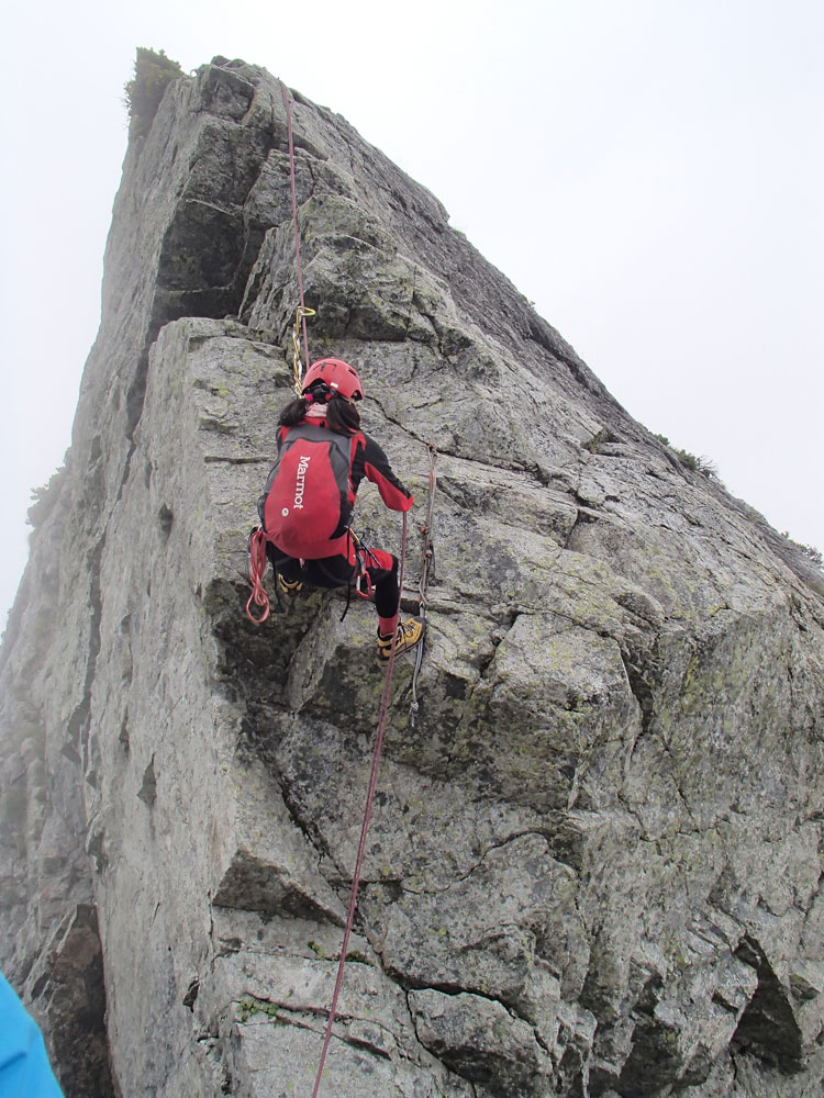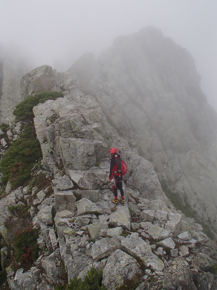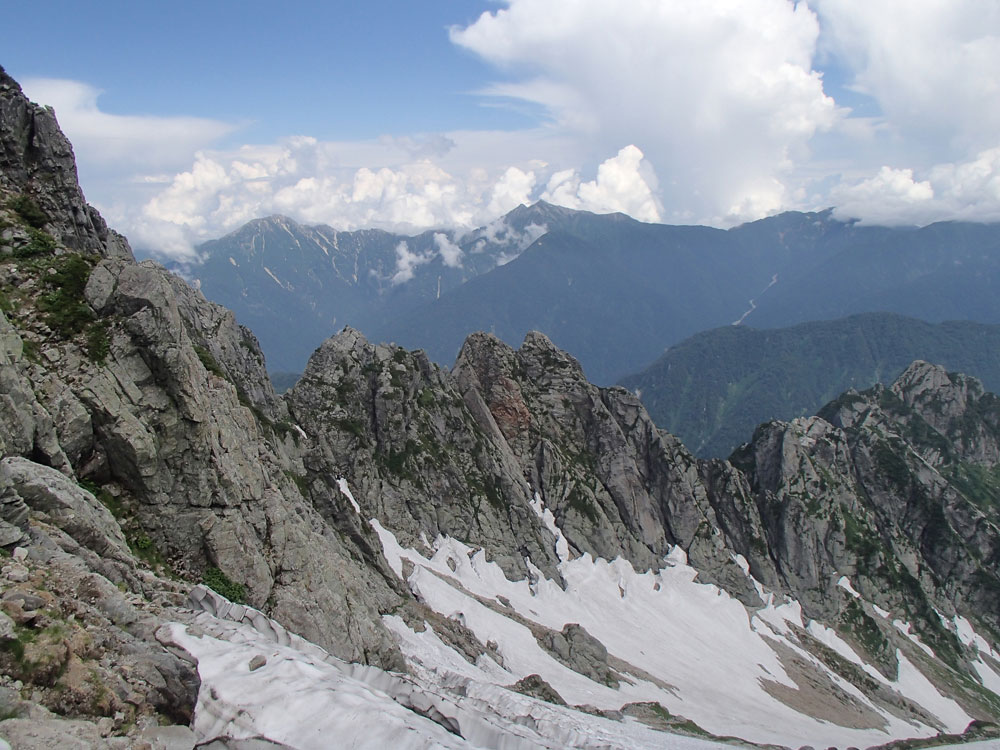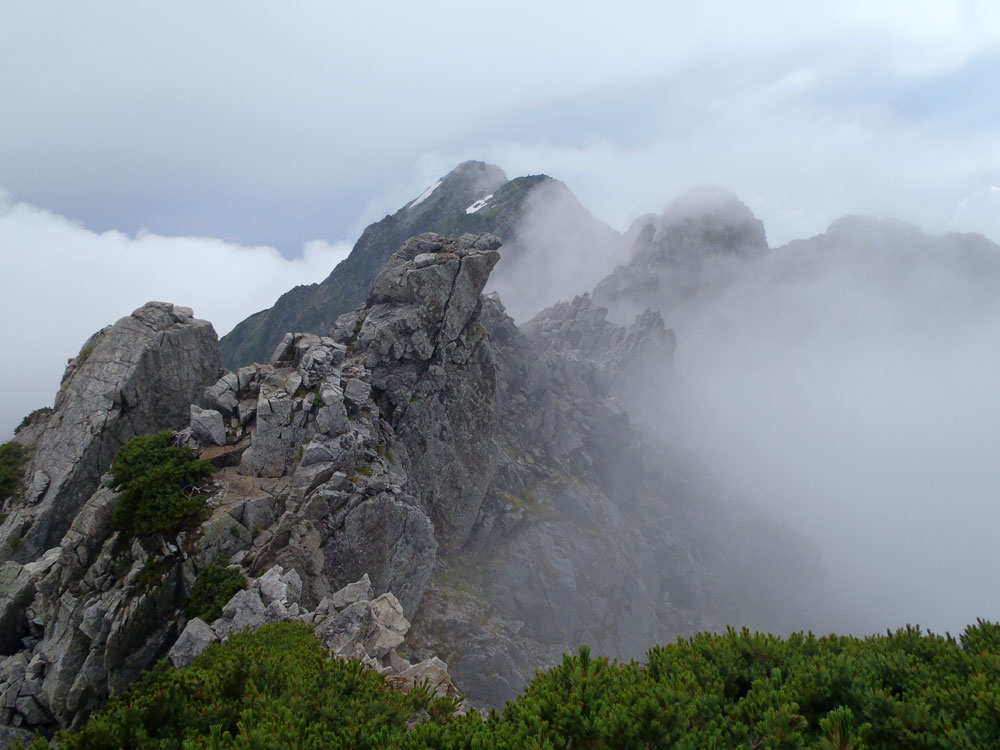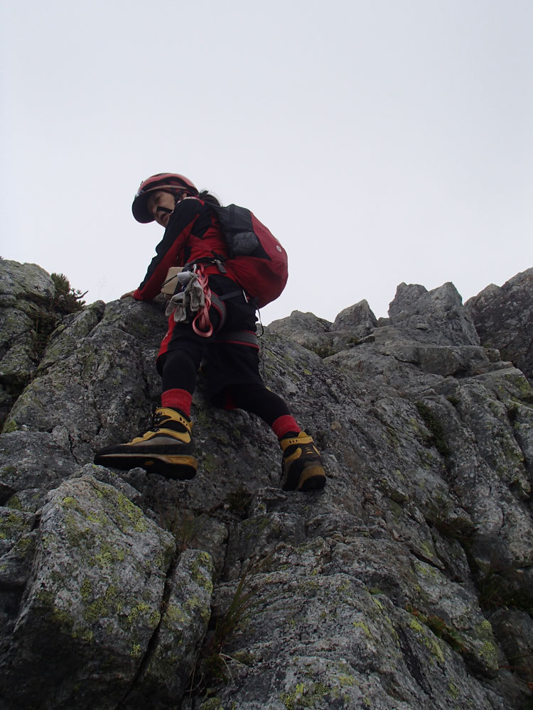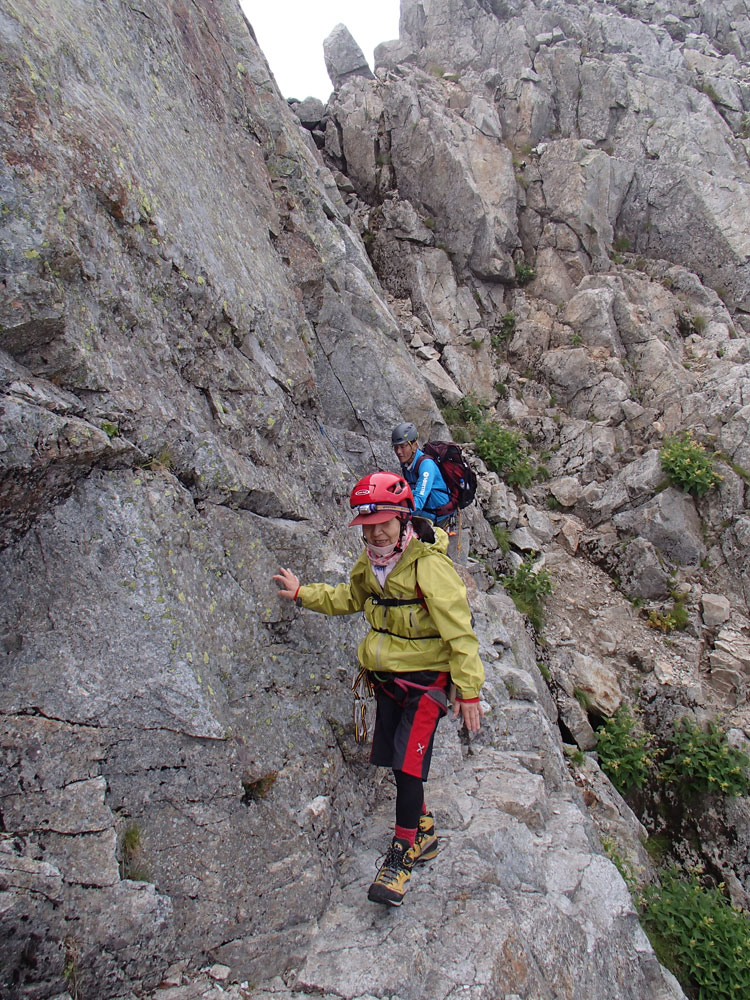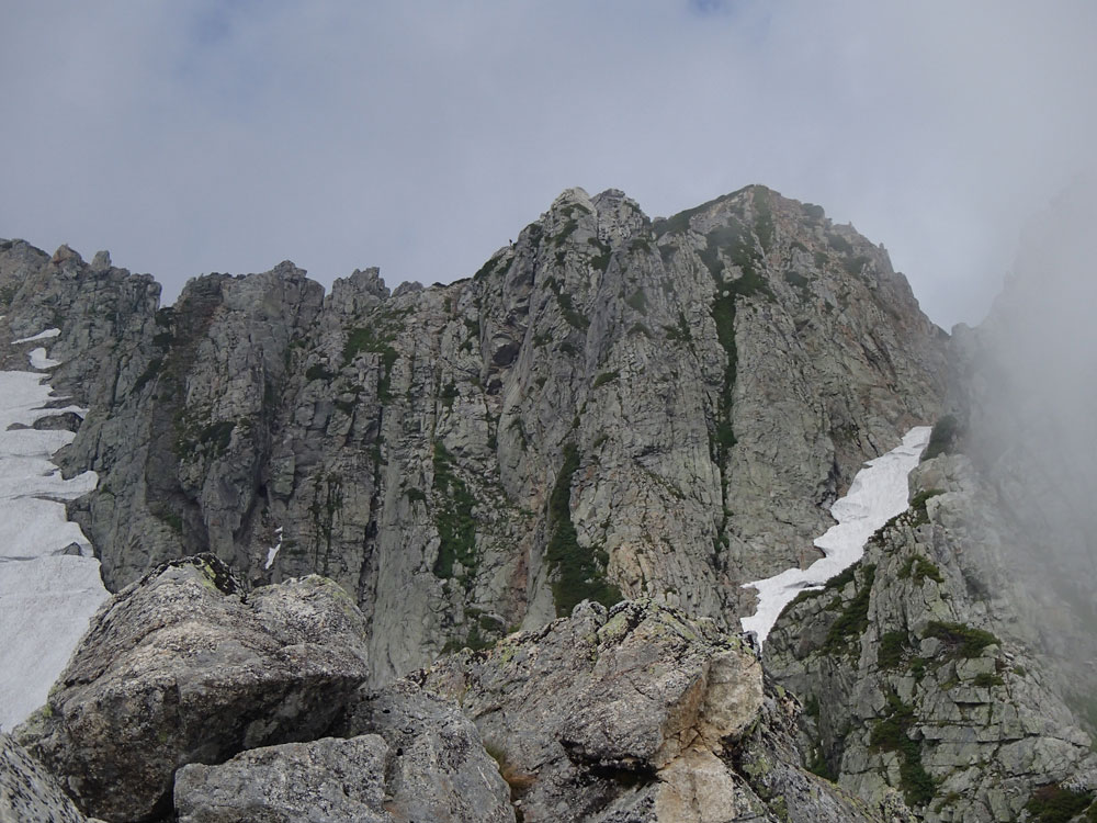 ■八ッ峰6峰Cフェース〜八ッ峰の頭@剱岳(北アルプス)2012年8月17日18日19日 No.687 じんじんさん、隊長、うさぎ 7峰 さて、7峰はゴジラの背のような稜線が続く。三の窓側に巻き道があるようだが、展望のいい岩稜を行くことに。 小さなアップダウンを繰り返しながらピークに立った。この辺りからガスが出てきて、遠雷が聞こえだした。いつでも待避できるように心の準備をした。頭からは懸垂下降。ダブルロープ1本では距離が足りないが、二本繋げると面倒なので最後のクライムダウンで済ませた。今日はチンネに取る着いているパーティーは少ないようだ。こんな日に登れるといいのだが。 8峰 次は8峰だ。八ッ峰上半部の登攀のハイライトといえるだろう。しかし、グレードはV程度なので、今回はコンテで登ることにした。スタカットで登るのが順当だろうが、ガスの遠雷にせかされ、時間短縮を図った。コルから少し三の窓側にトラバースしリッジに沿って登る。プロテクションは中間位置にハーケンが2,3本残置されている。なた、クラックがあるのでカムが使える。 8峰の登りは快適だが、中途半端な懸垂が待っている。昨年は一気に降りようとしてロープ回収時にスタックさせてしまった。その時は後続パーティにロープを外してもらったが、今回は、上半部に居るのは我々だけだ。その反省から2回に分けて懸垂することにした。急がば回れだ。 八ツ峰の頭 懸垂で8峰から狭いコルに降りると長次郎側のバンドを少しトラバースし ルンゼに取り付くことになる。最初にハーケンがある出口にカムでプロテクションをとり、念のためにスタカットで登った。バンドからルンゼにロープが90度折れるので、引き上げがやたらと重くなった。予定通り八ッ峰の頭に到着、時計を見ると 12時30分だ。昨年は確か11時30分だったように記憶している。1時間遅れのようだ。これからまともに剱に登っていると、帰着が7時を過ぎてしまうことになる。さてどうするか。とりあえずは、池の谷乗越まで懸垂で降りてからだ。前回懸垂は、ルンゼに降りてしまい、落石の巣窟を肝を冷やしながらクライムダウンしたので、今回は、ルンゼの手前で一旦ピッチを切って他のルートを探した。少しトラバースするとしっかりとしたクライムダウンできるフェースがあり、安心して池の谷乗越に降りることができた。シコタンソウがきれいに咲いていた。 北方稜線 さて問題は時間だ。 最短で剱沢に戻るには、ここの乗越から長次郎右俣で降りるのがいいと思うが、八ッ峰から見下ろしたところ、雪渓はズタズタになっていて、とても危険だ。とりあえずここからは、一般登山道で剱岳を目指すしかない。遠雷が収まりかけているので、時間がかかっても剱岳経由でもいいのだが。ガスはまとわりついていて、見通しがきかない。とりあえず、長次郎の頭まで行くことにした。ここで一般道ということで安心感があったのかルートミス。行きつ戻りつ30分のロスタイム。長次郎側の危険箇所はよく雑誌にも紹介されている所。持参したロープスリングをサービスでハーケンに通しておいた。しかし、ますます時間がなくなってきた。とりあえず長次郎左俣までと思ったが、雪渓がうまくつながっているところがあったので、剱岳経由から長次郎雪渓の下降に切り替えた。 長次郎谷右俣のコルまでは行かなかったが、 雪渓がつながっている所から下降を開始した。最初は傾斜がきついので、4ピッチ200mはロープを出して下った。岩場よりも遙かに雪渓下りの方がリスクが高い。慎重に下ったので熊の岩まで2時間を要してしまった。雪渓の下降により時間の短縮を図ったつもりだが、結果としてほぼ剱岳経由と変わらなくなってしまった。このあたりの判断は難しく、経験を積むしかない。 16時間行動 長次郎出合には17時10分に到着した。さてここから標高差500mの登返しがある。行動時間はすでに13時間を越えていてるが、がんばるしかない。雪渓を半分ほど登返したところで、間違えて斜面に取り付いてしまった。ここでまたルートミス。30分のロスタイム。ヘッデンを点けて雪渓を離れ谷に入ると剱沢小屋から夕食の揚げ物のいい臭いが流れてきた。40分がんばってやっと小屋まで登りかえしとりあえず缶ビールを購入した。 テント場に戻ると20時になっていた。なんと16時間行動になってしまった。この間の食料はパン1個と行動食少々、水1リットルだった。人間やればできるものだ。20年以上山をやっているが、これほどの長時間行動は過去になかった。今後の山行プランの参考にしたい。 |