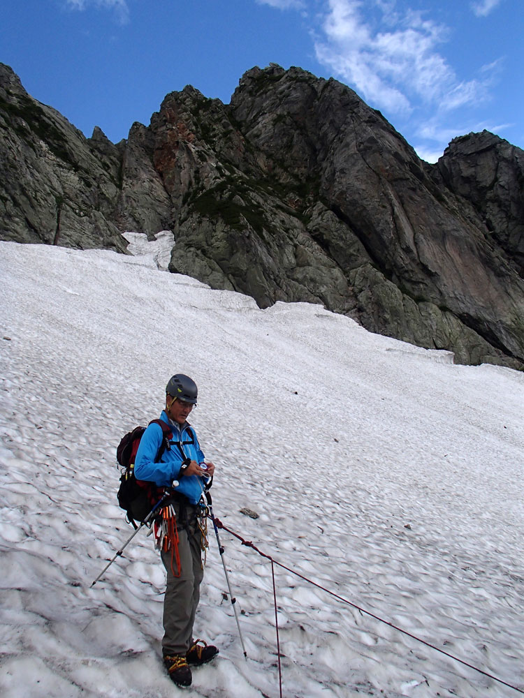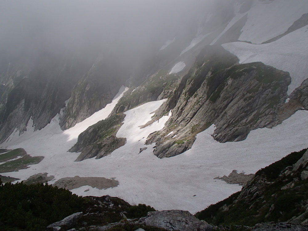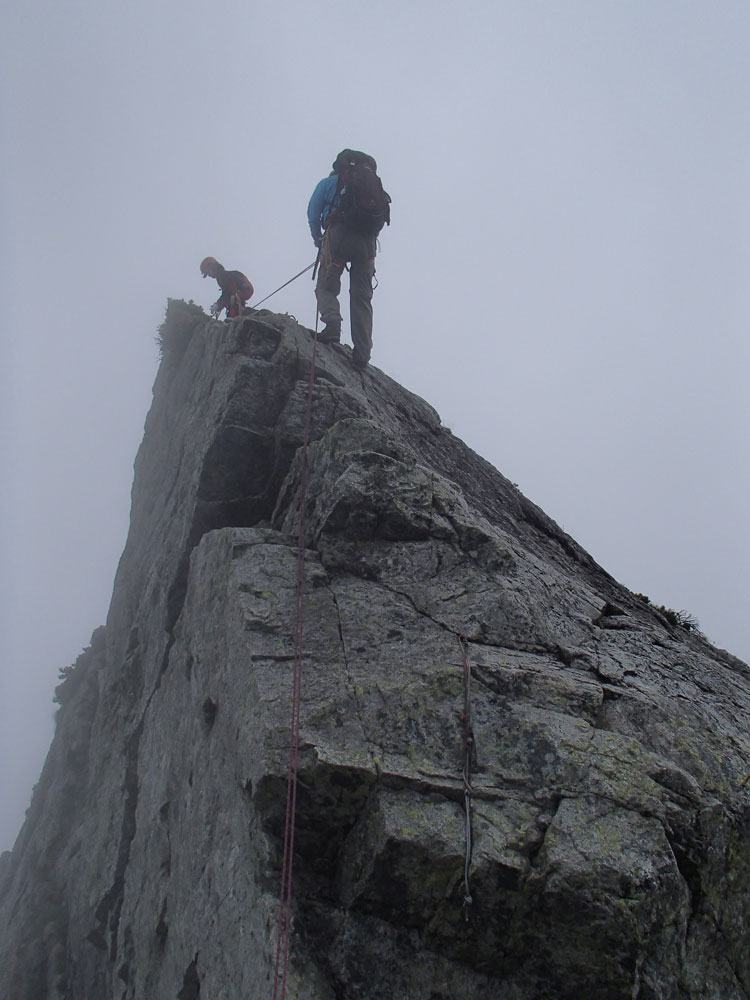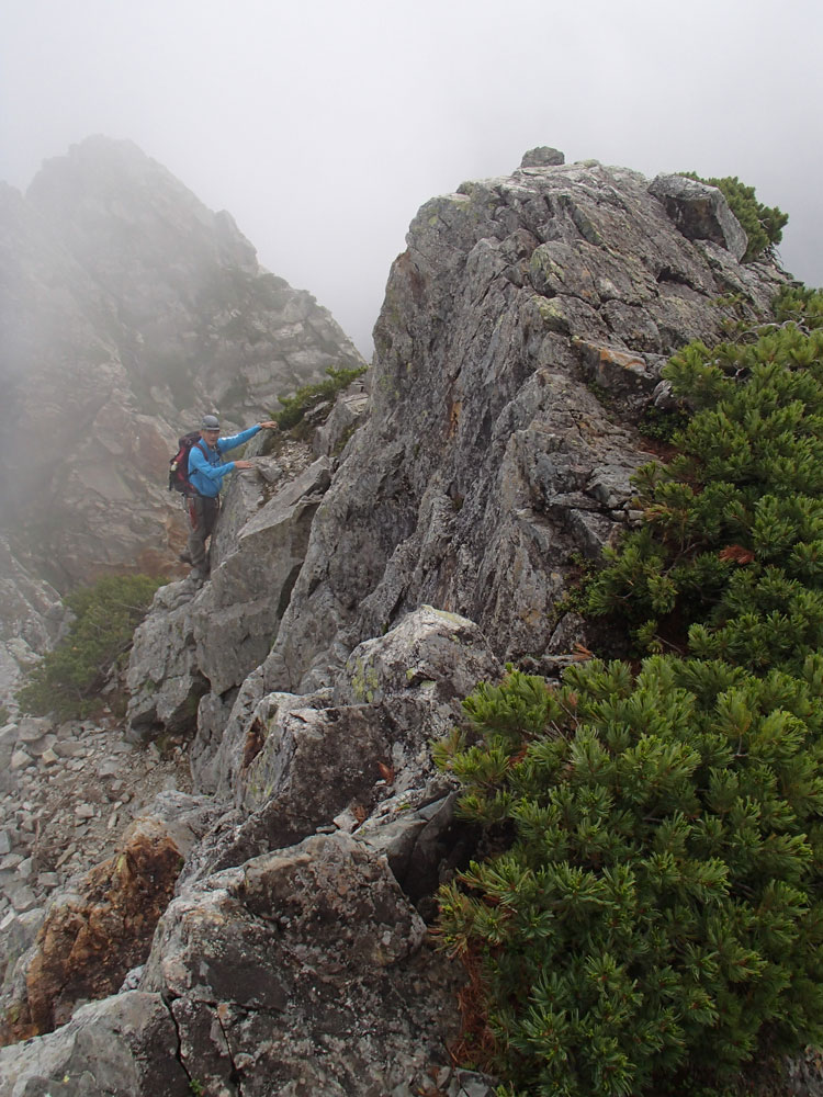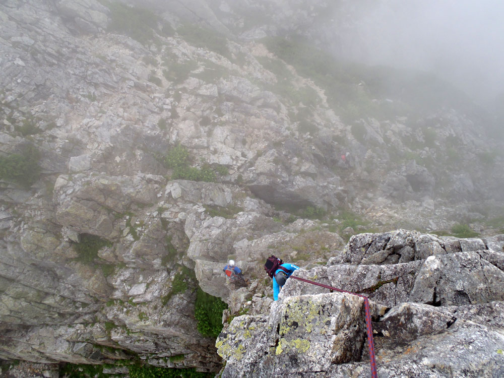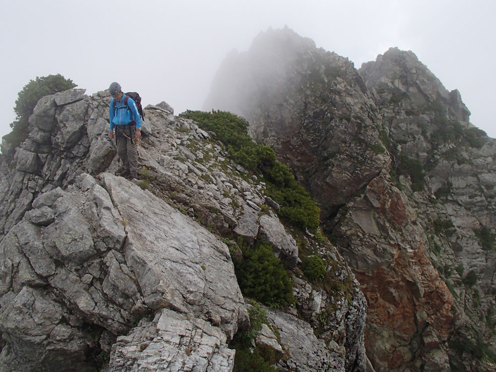 ■八ッ峰6峰Cフェース〜八ッ峰の頭@剱岳(北アルプス)2012年8月17日18日19日 No.687 じんじんさん、隊長、うさぎ 7峰 さて、7峰はゴジラの背のような稜線が続く。三の窓側に巻き道があるようだが、展望のいい岩稜を行くことに。 小さなアップダウンを繰り返しながらピークに立った。この辺りからガスが出てきて、遠雷が聞こえだした。いつでも待避できるように心の準備をした。頭からは懸垂下降。ダブルロープ1本では距離が足りないが、二本繋げると面倒なので最後のクライムダウンで済ませた。今日はチンネに取る着いているパーティーは少ないようだ。こんな日に登れるといいのだが。 8峰 次は8峰だ。八ッ峰上半部の登攀のハイライトといえるだろう。しかし、グレードはV程度なので、今回はコンテで登ることにした。スタカットで登るのが順当だろうが、ガスの遠雷にせかされ、時間短縮を図った。コルから少し三の窓側にトラバースしリッジに沿って登る。プロテクションは中間位置にハーケンが2,3本残置されている。なた、クラックがあるのでカムが使える。 8峰の登りは快適だが、中途半端な懸垂が待っている。昨年は一気に降りようとしてロープ回収時にスタックさせてしまった。その時は後続パーティにロープを外してもらったが、今回は、上半部に居るのは我々だけだ。その反省から2回に分けて懸垂することにした。急がば回れだ。 八ツ峰の頭 懸垂で8峰から狭いコルに降りると長次郎側のバンドを少しトラバースし ルンゼに取り付くことになる。最初にハーケンがある出口にカムでプロテクションをとり、念のためにスタカットで登った。バンドからルンゼにロープが90度折れるので、引き上げがやたらと重くなった。予定通り八ッ峰の頭に到着、時計を見ると 12時30分だ。昨年は確か11時30分だったように記憶している。1時間遅れのようだ。これからまともに剱に登っていると、帰着が7時を過ぎてしまうことになる。さてどうするか。とりあえずは、池の谷乗越まで懸垂で降りてからだ。前回懸垂は、ルンゼに降りてしまい、落石の巣窟を肝を冷やしながらクライムダウンしたので、今回は、ルンゼの手前で一旦ピッチを切って他のルートを探した。少しトラバースするとしっかりとしたクライムダウンできるフェースがあり、安心して池の谷乗越に降りることができた。シコタンソウがきれいに咲いていた。 北方稜線 さて問題は時間だ。 最短で剱沢に戻るには、ここの乗越から長次郎右俣で降りるのがいいと思うが、八ッ峰から見下ろしたところ、雪渓はズタズタになっていて、とても危険だ。とりあえずここからは、一般登山道で剱岳を目指すしかない。遠雷が収まりかけているので、時間がかかっても剱岳経由でもいいのだが。ガスはまとわりついていて、見通しがきかない。とりあえず、長次郎の頭まで行くことにした。ここで一般道ということで安心感があったのかルートミス。行きつ戻りつ30分のロスタイム。長次郎側の危険箇所はよく雑誌にも紹介されている所。持参したロープスリングをサービスでハーケンに通しておいた。しかし、ますます時間がなくなってきた。とりあえず長次郎左俣までと思ったが、雪渓がうまくつながっているところがあったので、剱岳経由から長次郎雪渓の下降に切り替えた。 長次郎谷右俣のコルまでは行かなかったが、 雪渓がつながっている所から下降を開始した。最初は傾斜がきついので、4ピッチ200mはロープを出して下った。岩場よりも遙かに雪渓下りの方がリスクが高い。慎重に下ったので熊の岩まで2時間を要してしまった。雪渓の下降により時間の短縮を図ったつもりだが、結果としてほぼ剱岳経由と変わらなくなってしまった。このあたりの判断は難しく、経験を積むしかない。 16時間行動 長次郎出合には17時10分に到着した。さてここから標高差500mの登返しがある。行動時間はすでに13時間を越えていてるが、がんばるしかない。雪渓を半分ほど登返したところで、間違えて斜面に取り付いてしまった。ここでまたルートミス。30分のロスタイム。ヘッデンを点けて雪渓を離れ谷に入ると剱沢小屋から夕食の揚げ物のいい臭いが流れてきた。40分がんばってやっと小屋まで登りかえしとりあえず缶ビールを購入した。 テント場に戻ると20時になっていた。なんと16時間行動になってしまった。この間の食料はパン1個と行動食少々、水1リットルだった。人間やればできるものだ。20年以上山をやっているが、これほどの長時間行動は過去になかった。今後の山行プランの参考にしたい。 |