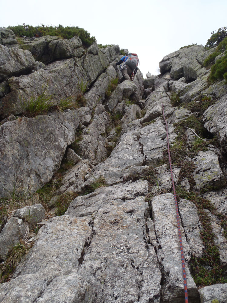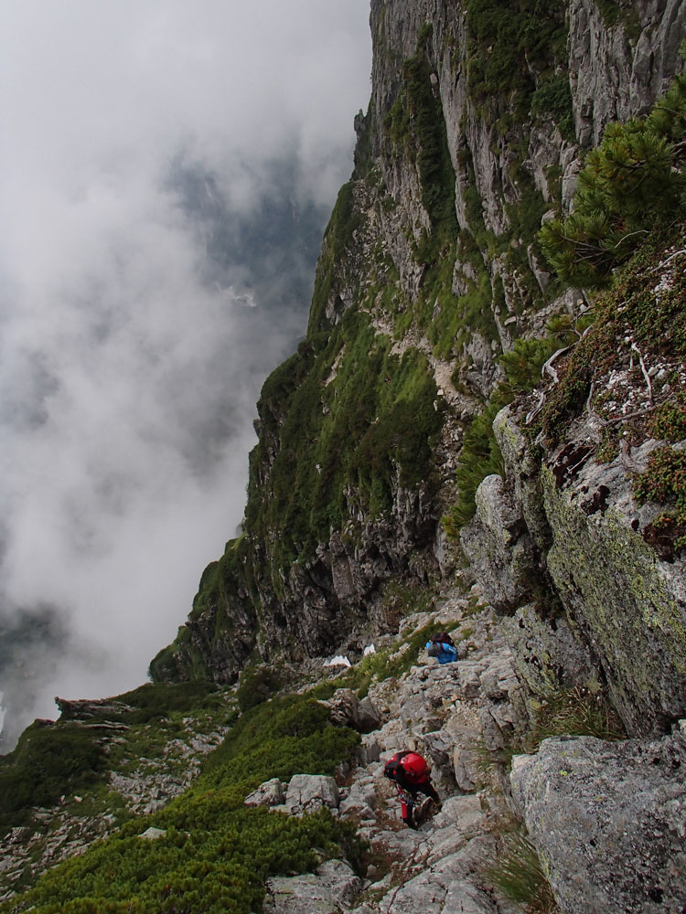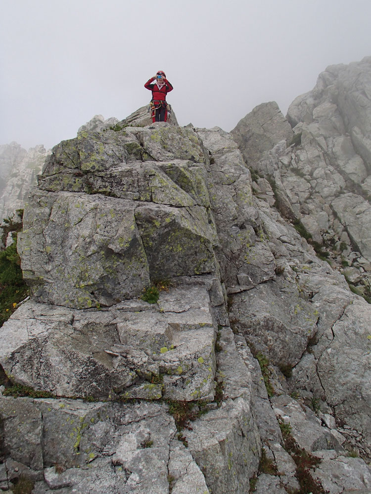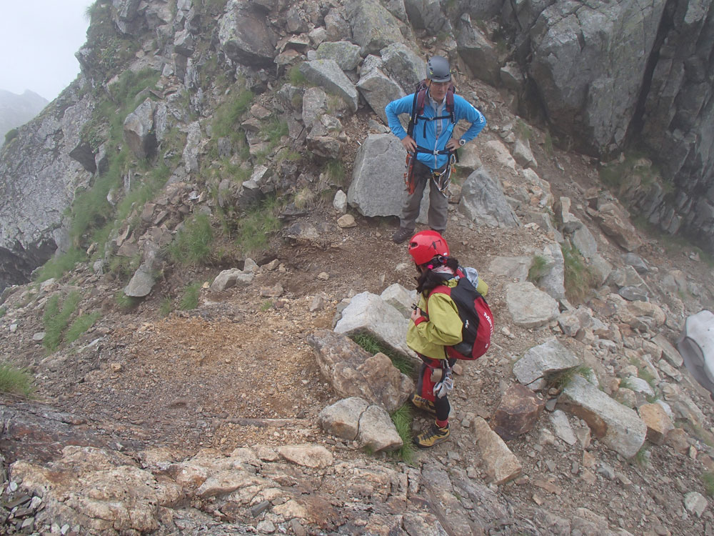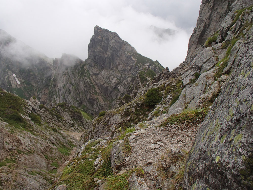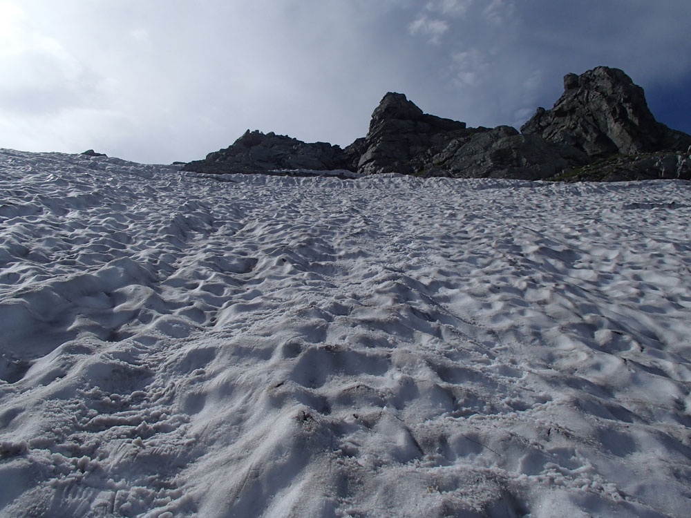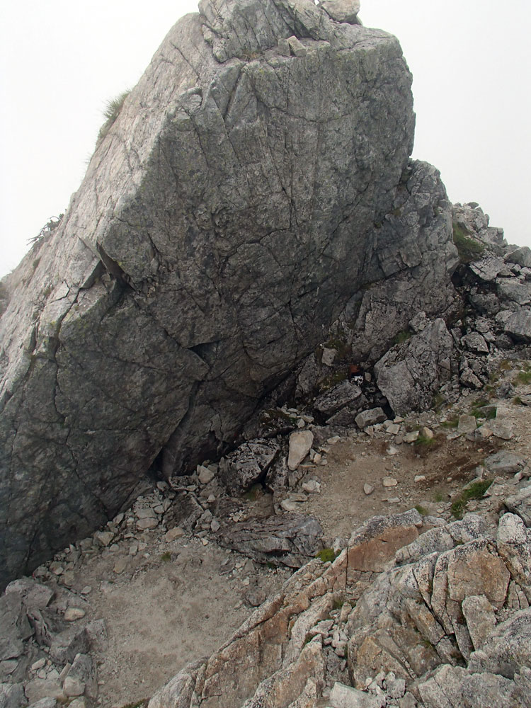 ■八ッ峰6峰Cフェース〜八ッ峰の頭@剱岳(北アルプス)2012年8月17日18日19日 No.687 じんじんさん、隊長、うさぎ 7峰 さて、7峰はゴジラの背のような稜線が続く。三の窓側に巻き道があるようだが、展望のいい岩稜を行くことに。 小さなアップダウンを繰り返しながらピークに立った。この辺りからガスが出てきて、遠雷が聞こえだした。いつでも待避できるように心の準備をした。頭からは懸垂下降。ダブルロープ1本では距離が足りないが、二本繋げると面倒なので最後のクライムダウンで済ませた。今日はチンネに取る着いているパーティーは少ないようだ。こんな日に登れるといいのだが。 8峰 次は8峰だ。八ッ峰上半部の登攀のハイライトといえるだろう。しかし、グレードはV程度なので、今回はコンテで登ることにした。スタカットで登るのが順当だろうが、ガスの遠雷にせかされ、時間短縮を図った。コルから少し三の窓側にトラバースしリッジに沿って登る。プロテクションは中間位置にハーケンが2,3本残置されている。なた、クラックがあるのでカムが使える。 8峰の登りは快適だが、中途半端な懸垂が待っている。昨年は一気に降りようとしてロープ回収時にスタックさせてしまった。その時は後続パーティにロープを外してもらったが、今回は、上半部に居るのは我々だけだ。その反省から2回に分けて懸垂することにした。急がば回れだ。 八ツ峰の頭 懸垂で8峰から狭いコルに降りると長次郎側のバンドを少しトラバースし ルンゼに取り付くことになる。最初にハーケンがある出口にカムでプロテクションをとり、念のためにスタカットで登った。バンドからルンゼにロープが90度折れるので、引き上げがやたらと重くなった。予定通り八ッ峰の頭に到着、時計を見ると 12時30分だ。昨年は確か11時30分だったように記憶している。1時間遅れのようだ。これからまともに剱に登っていると、帰着が7時を過ぎてしまうことになる。さてどうするか。とりあえずは、池の谷乗越まで懸垂で降りてからだ。前回懸垂は、ルンゼに降りてしまい、落石の巣窟を肝を冷やしながらクライムダウンしたので、今回は、ルンゼの手前で一旦ピッチを切って他のルートを探した。少しトラバースするとしっかりとしたクライムダウンできるフェースがあり、安心して池の谷乗越に降りることができた。シコタンソウがきれいに咲いていた。 北方稜線 さて問題は時間だ。 最短で剱沢に戻るには、ここの乗越から長次郎右俣で降りるのがいいと思うが、八ッ峰から見下ろしたところ、雪渓はズタズタになっていて、とても危険だ。とりあえずここからは、一般登山道で剱岳を目指すしかない。遠雷が収まりかけているので、時間がかかっても剱岳経由でもいいのだが。ガスはまとわりついていて、見通しがきかない。とりあえず、長次郎の頭まで行くことにした。ここで一般道ということで安心感があったのかルートミス。行きつ戻りつ30分のロスタイム。長次郎側の危険箇所はよく雑誌にも紹介されている所。持参したロープスリングをサービスでハーケンに通しておいた。しかし、ますます時間がなくなってきた。とりあえず長次郎左俣までと思ったが、雪渓がうまくつながっているところがあったので、剱岳経由から長次郎雪渓の下降に切り替えた。 長次郎谷右俣のコルまでは行かなかったが、 雪渓がつながっている所から下降を開始した。最初は傾斜がきついので、4ピッチ200mはロープを出して下った。岩場よりも遙かに雪渓下りの方がリスクが高い。慎重に下ったので熊の岩まで2時間を要してしまった。雪渓の下降により時間の短縮を図ったつもりだが、結果としてほぼ剱岳経由と変わらなくなってしまった。このあたりの判断は難しく、経験を積むしかない。 16時間行動 長次郎出合には17時10分に到着した。さてここから標高差500mの登返しがある。行動時間はすでに13時間を越えていてるが、がんばるしかない。雪渓を半分ほど登返したところで、間違えて斜面に取り付いてしまった。ここでまたルートミス。30分のロスタイム。ヘッデンを点けて雪渓を離れ谷に入ると剱沢小屋から夕食の揚げ物のいい臭いが流れてきた。40分がんばってやっと小屋まで登りかえしとりあえず缶ビールを購入した。 テント場に戻ると20時になっていた。なんと16時間行動になってしまった。この間の食料はパン1個と行動食少々、水1リットルだった。人間やればできるものだ。20年以上山をやっているが、これほどの長時間行動は過去になかった。今後の山行プランの参考にしたい。 |