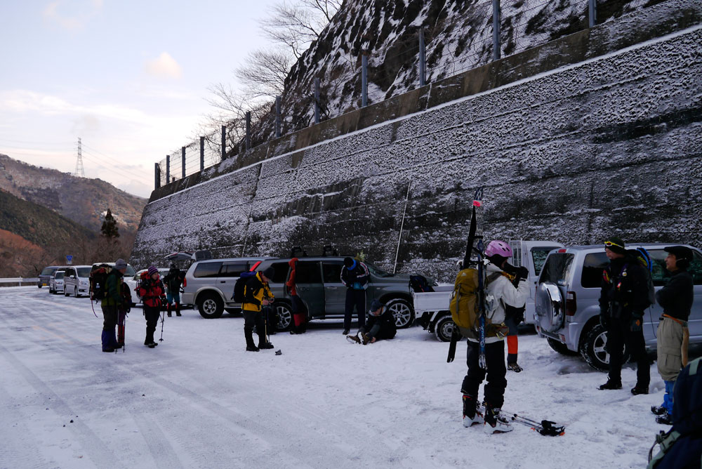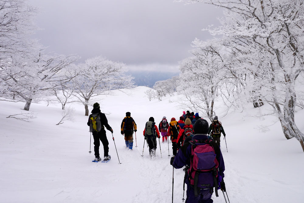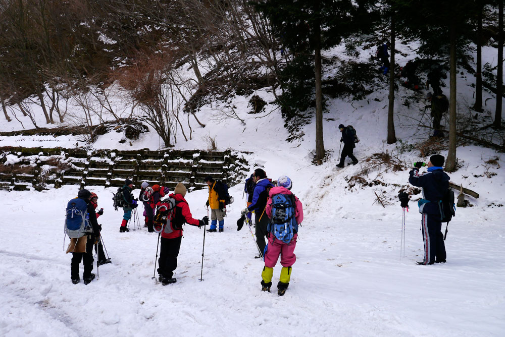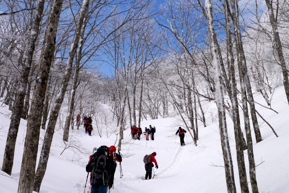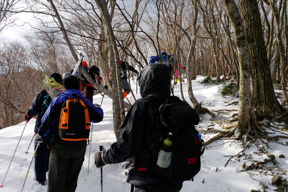 プロローグ 雪と格闘しながらの捜索活動が思い出される。あれから一年、1回忌登山ということで、Nさんの関係者や捜索に従事した人たちが集まった。昨年は週末ごとに寒波がやってきて、吹雪の中の捜索が多く、青空はあまり見られなかったことを思い出す。今日は寒波の影響が残っていたが、青空がほほえんでくれた。樹氷もすばらしかった。大勢がやってきたのでNさんもびっくりしたことだろう。 前日からの参加者は,ルート整備後,犬帰し橋手前で野営したようだ。当日参加者は6時30分に山口ゲートに集合した。途中合流を含めると総勢40人になった。こんなに大勢のパーティ登山は初めての経験となった。 コグルミ谷右岸尾根 本日の行程は,コグルミ谷右岸尾根を使いボタンブチを往復するというもの。コグルミ谷右岸尾根への取付きはいくつかあるが,今回は,F学園とNさん関係の初級者が同行するので,比較的緩やかな枝尾根を利用するよう配慮されていた。取り付いてみるここれはなかなか歩きやすいルートだった。 寒気 昨日からオホーツクまで進んだ台風並みの低気圧が猛威をふるい,北海道は大変な暴風雪になり,車に閉じ込められたり,低体温症になったりする死亡事故が起きている。その影響で御池岳も冬型となり,積雪はそれほど多くはないが,気温が低いためにさらっとした雪が尾根についていた。 カタクリ峠 適度に休憩を入れ取り付きから約1時間20分でカタクリ峠に到着した。昨年の捜索では何度この峠を通過したことだろうか。断片的に記憶が蘇ってきた。この辺りから積雪が増し,スノーシューやワカンの装着指示が出た。 真の谷 ノーマルルートで進み,約40分で真の谷の分岐に到着。ここから丸山のコルまでの登りが本日の踏ん張りどころだ。約50分で登って小休止。Nさん関係者の方々に先にボタンブチに降りてもらい静かな雰囲気で慰霊してもらった。後で我々がボタンブチに集合した。風も弱まり,白銀に輝く奥の平の急稜と青空と樹氷がきれいだった。2週間前に訪れているが,今回は慰霊登山ということでしんみりとした気持ちになった。 Nさんが発見された尾根を見下ろすたびに,Nさんの当日の行動を推測してしまう。確かな情報が得られないので推測のまま課題として残っている。滑落なのか道迷いなのか,それとも他に原因があるのか,いくら考えても推測の域を出ない。 ボタンブチで30分過ごし丸山のコルへ戻り昼食休憩になった。ゆったりとした時間が過ぎていった。帰路はシリセードを交えながら1時間20分で下り,イベントが終了した。完 節分草 帰りにセツブンソウを見に行った。今年は花付きも良く、ちょうど満開になっていた。これから4月上旬にかけて山頂間で咲き上がっていくことだろう。今年も花の季節が始まった。