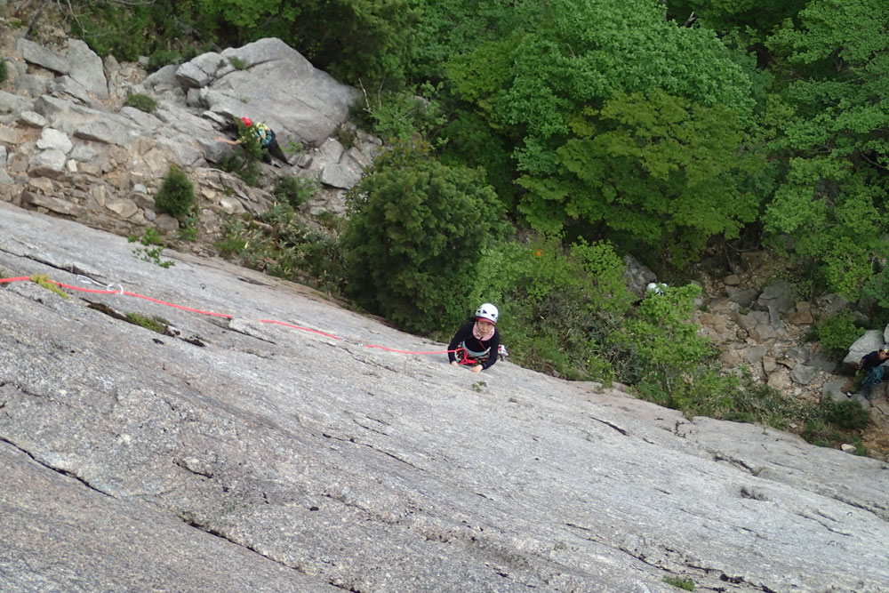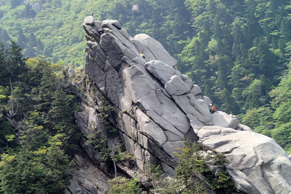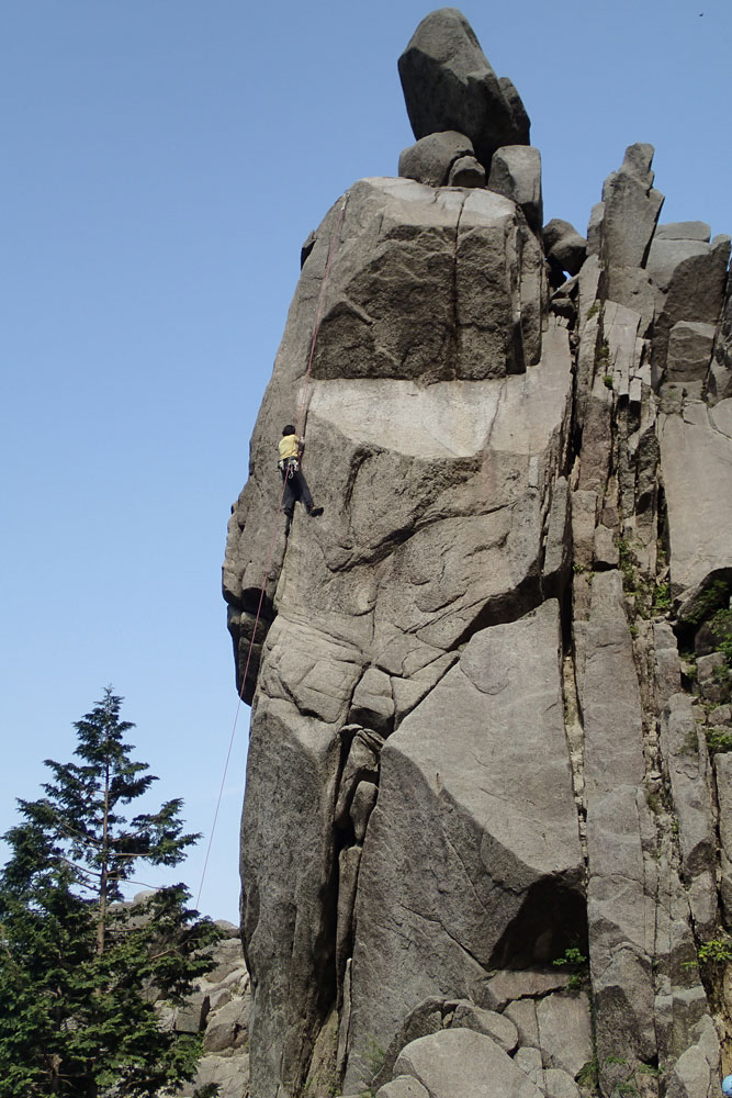 中尾根 P4 午後からは静かな中尾根に移動。久しぶりなので少し迷ってなんとかP4の基部に到着。ここはクラック中心のルートで支点はNP。P4には古いハーケンがあるが、カムで支点をとるのが基本。グレード的なXなのでそれほど難しくはないが、しっかりとカムをセットする練習にはなる。今年のGWに小川山のセレクション最終ピッチの墜落でカムを2つ飛ばしているので、慎重に確実にセットしながらのぼった。このルートはいつもスクールのMさんのセカンドばかりだったが今回は初リードということになった。クラックからチムニーに入っていくところが面白い。 さてP4の2ピッチ目は中に入ると身動きが取れなくなるので、フレークを掴んで外へ出ると比較的容易に登れる。 中尾根 P3 このピッチもグレードはXで、クラックに入り込むとP4以上に苦しくなる。核心はフレークのところで、右足のフットジャムがフレークに決まれば身体があげられる。残置はほとんどないのでカムが必要だ。2ピッチ目は時間がなくなってきたのでやめにして、ここから懸垂で戻った。 時間があればモンキーフェースをやりたかったが、今回はパス。次回のお楽しみにしておこう。 seitaroチームの宇宙遊泳 一の壁に戻るとseitaroチームが宇宙遊泳をやっていた。今日もしっかりと基本が出来たのでここで終了とし、失礼して先に帰路についた。