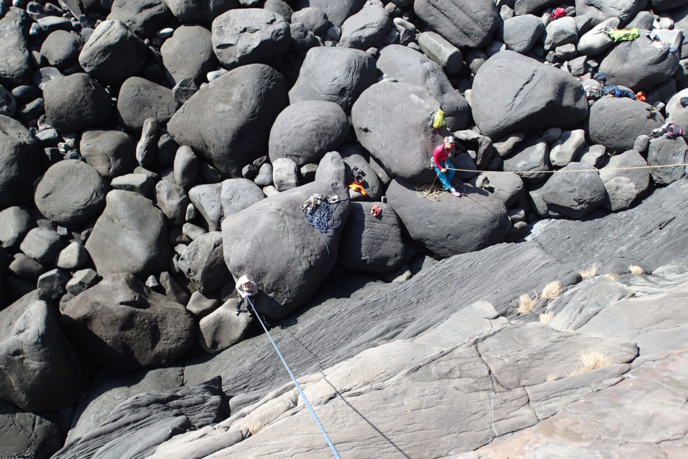 シンクロックス5.8 最初はグレードの低いのから入る。このルートはNPで、小さいカムかナッツが必要で、自分のワンセットにタクさんから小さいカムを借りて離陸。核心はうすかぶりのところで正面のフレークをどう使うかがポイント。最初はムーブがわからずにしどろもどろ。2回目はスムーズにムーブがつながり、1回目のドタバタはなんだったのか。勉強になった。やはり城ヶ崎のグレードは「辛い」なと思った。
