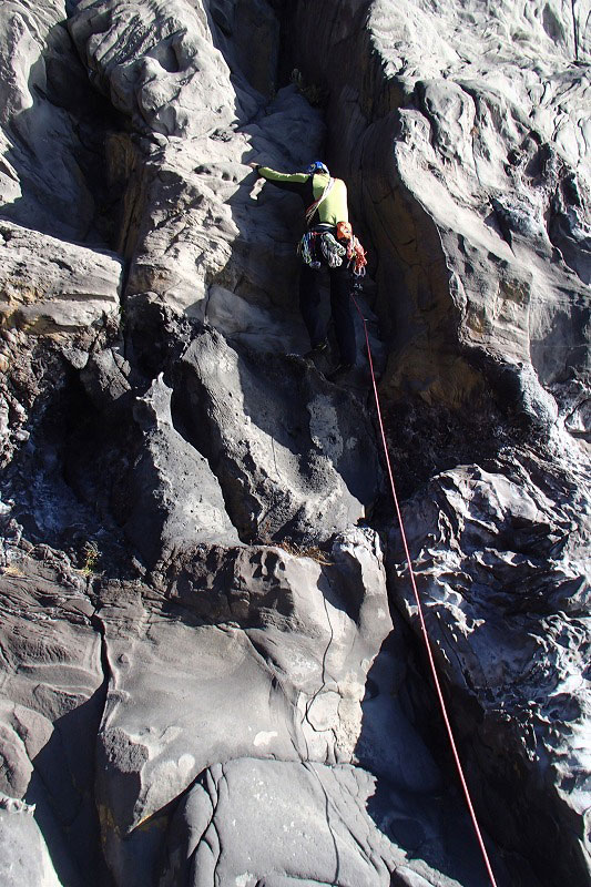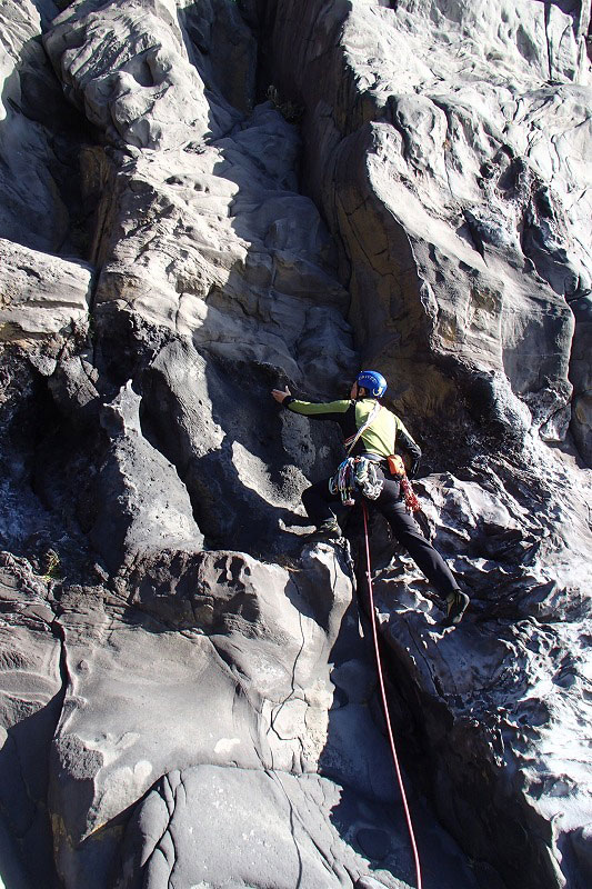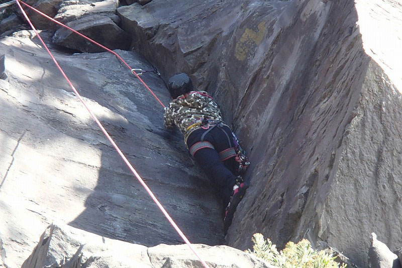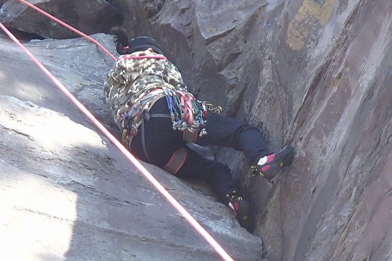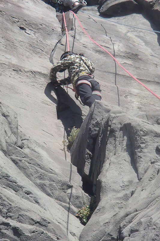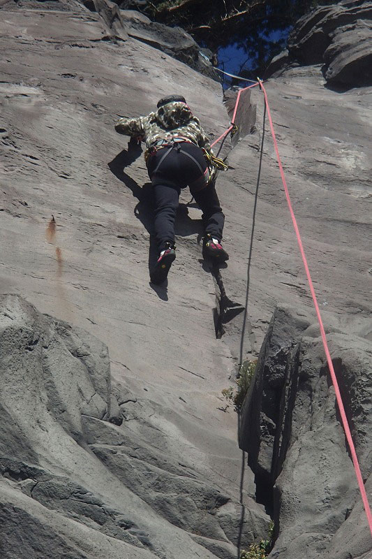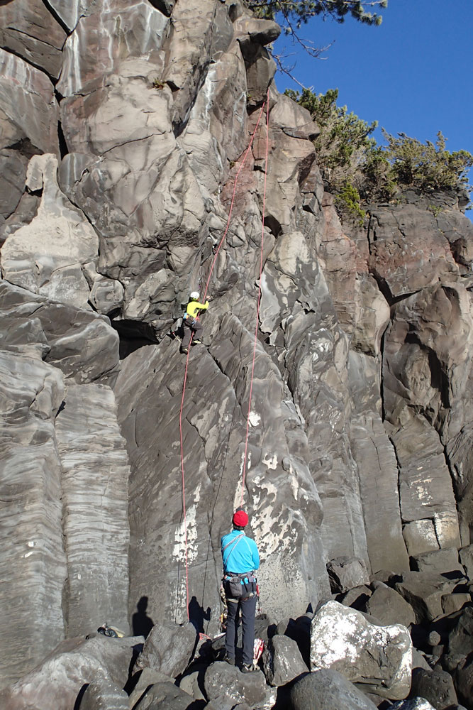 城ヶ崎 昨夜は常宿になっている「民宿いさお丸」で、美味しいものを食べて、美味しいお酒を飲んで、温かいお風呂で体をほぐしエネルギー充填。朝もしっかりと食べて、いがいが駐車場に向かった。駐車場の混雑が心配だったが、意外と空きが多かった。前回はかぶり系でギブアップしたので今回はあかねの浜へ。我々にとって手頃なグレードのルートがある。 イソギク 5.9 まずはイソギクでウォームアップ。核心は上部のフィンガークラック。指が太い人は入らない。結局ステミングが正解のようだ。 ツワブキ 5.10a 上部数mが核心。ハンドジャムが1回使えるがその上はフィンガーサイズ。バランスをとればクラックだけで行けそうだが、フェースを使うと正対でいけた。今度は色々とムーブを試してみたい。 |