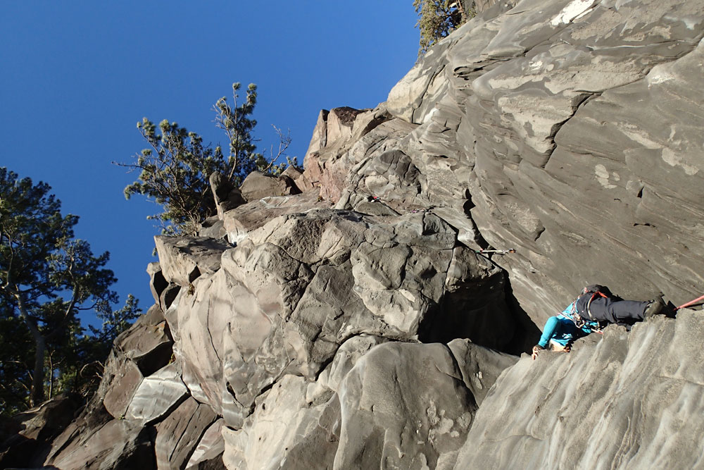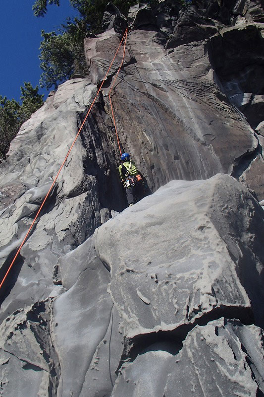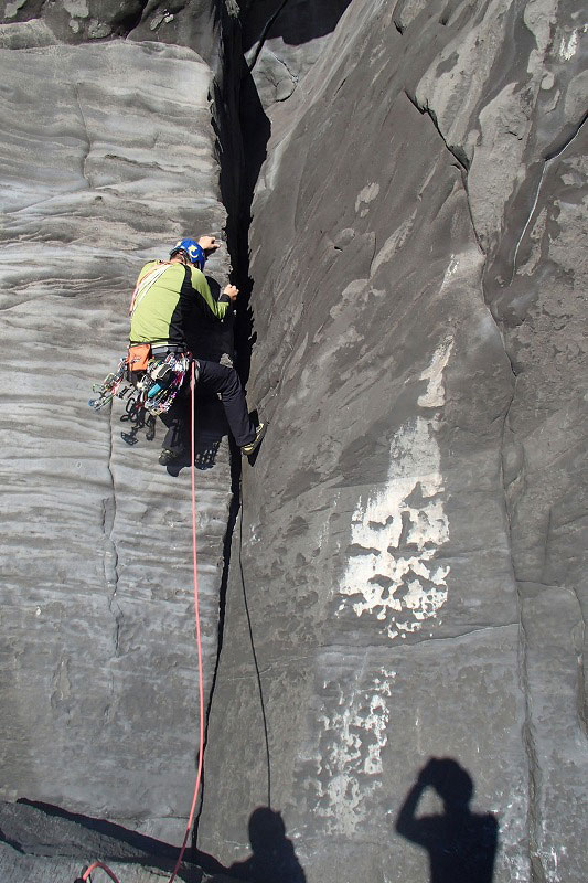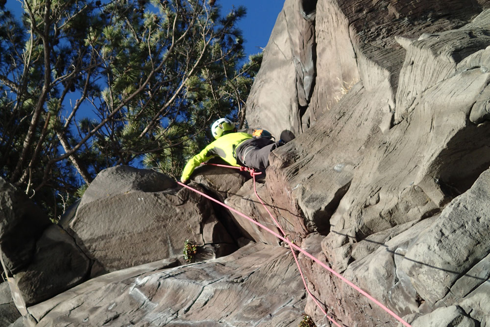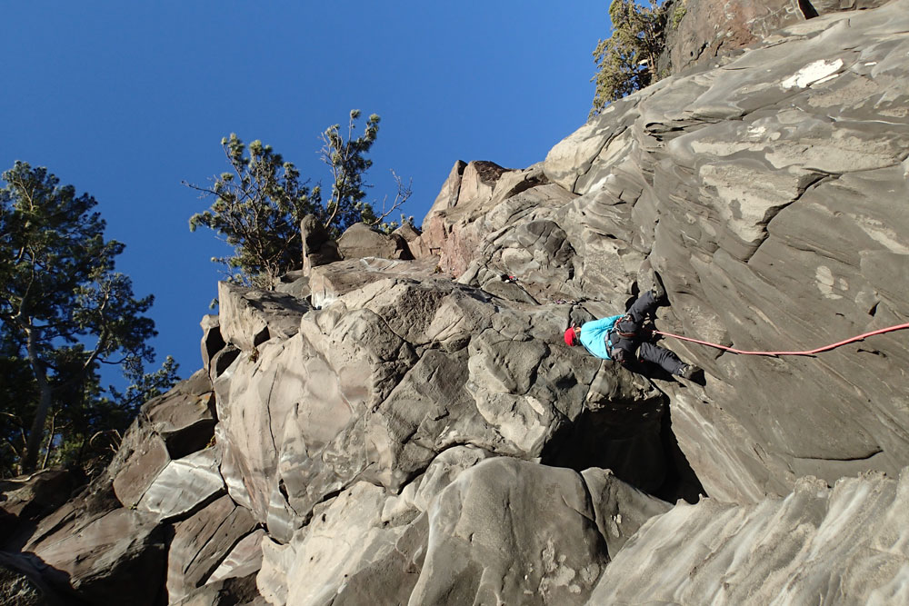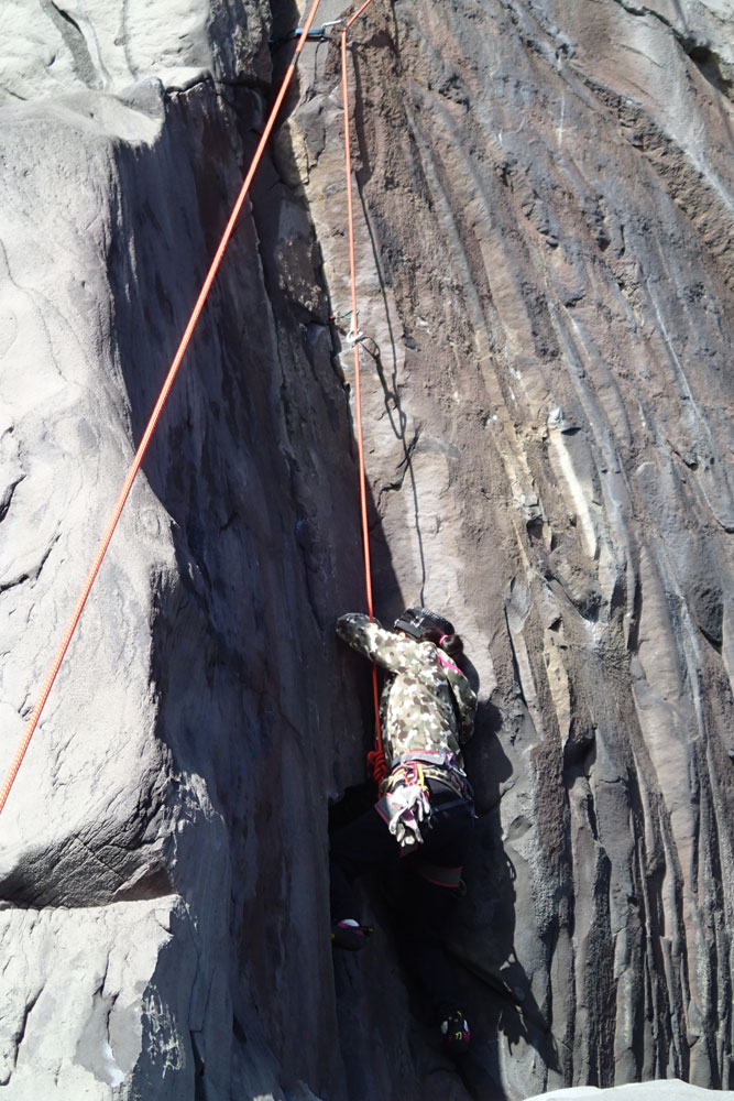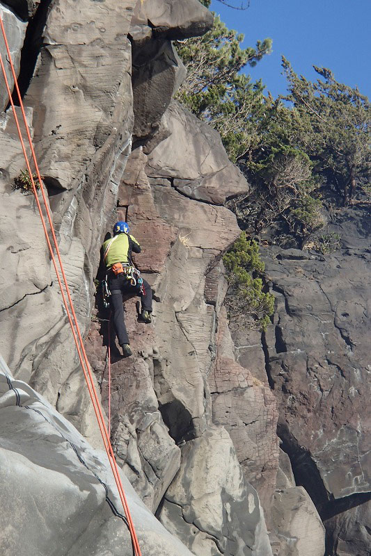 ホタテラック 5.10b/c 構成多岐なムーブが上下にあると魅惑のトラッドでは紹介されている。3テンションで前半の核心が通過できた。上部のフレークとフェースはガバがあり行けそうだったが、すでに手の保持力が落ちていてテンション。断念した。これも次回の課題だ。 前半のクラックはハンドジャムが1回だけ使える。その上はフィンガーをどう使うか。フェースを使ったりして何度かやっているうちに身体を上げられた。どうやったか思い出せないが、ムーブガ決まったのだろう。 毘沙門天 5.9+ 出口が核心。ハングを右から巻くが、かなり悪い。全階ナッツを回収できなかったが、やはりまだ残っていた。 |