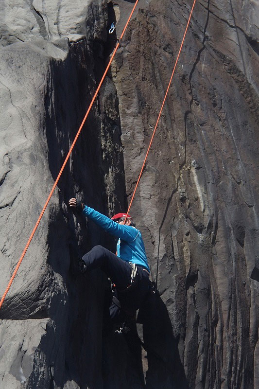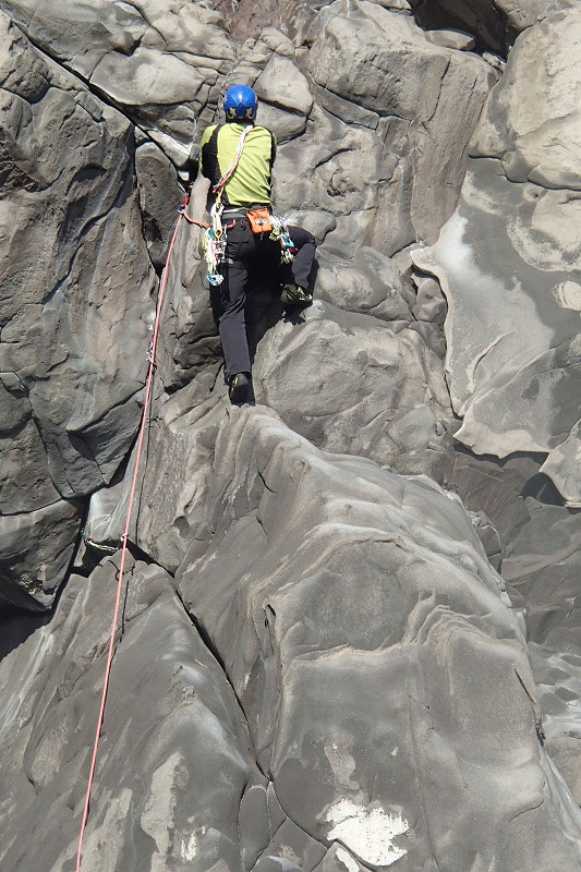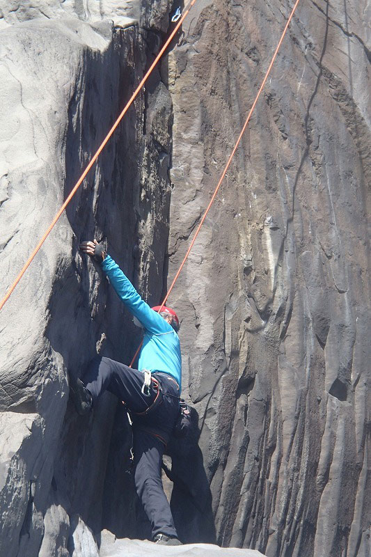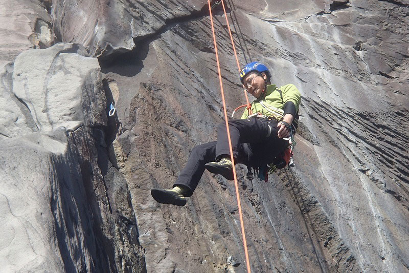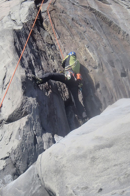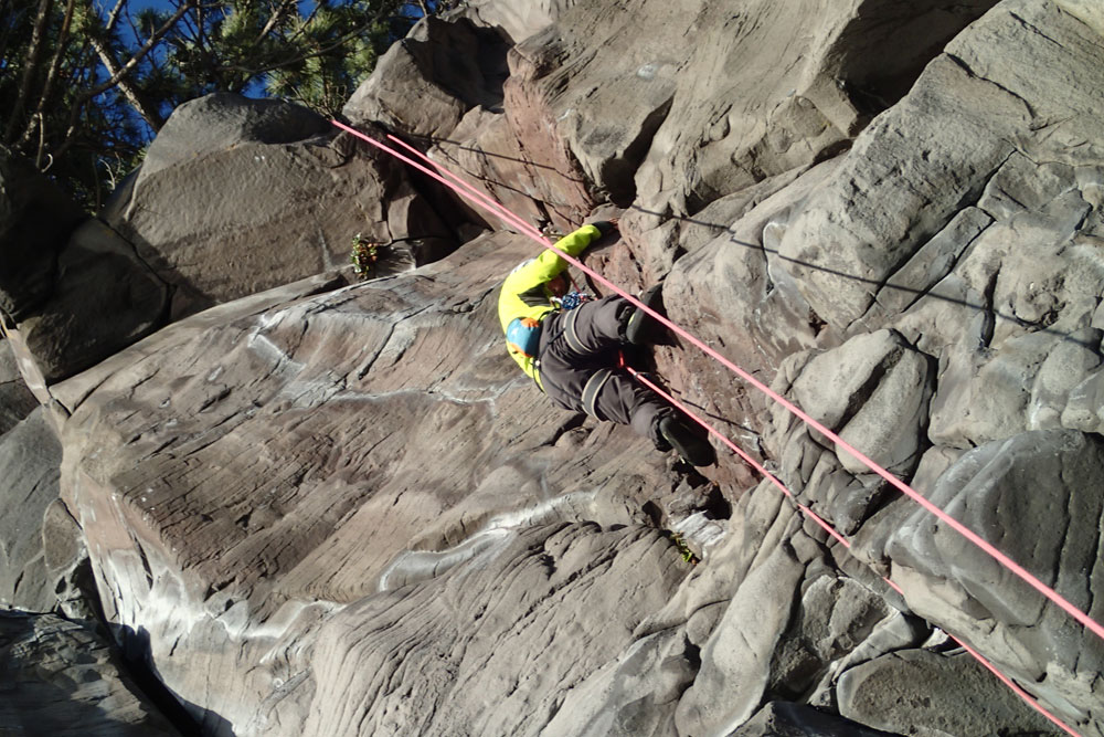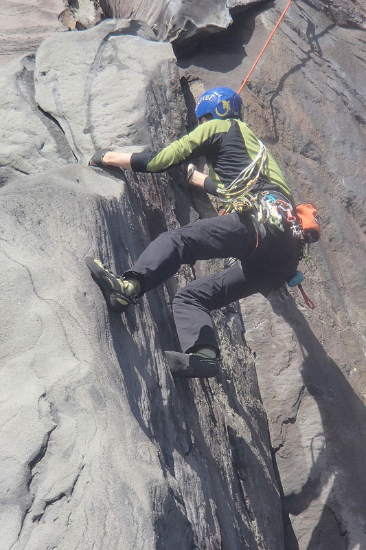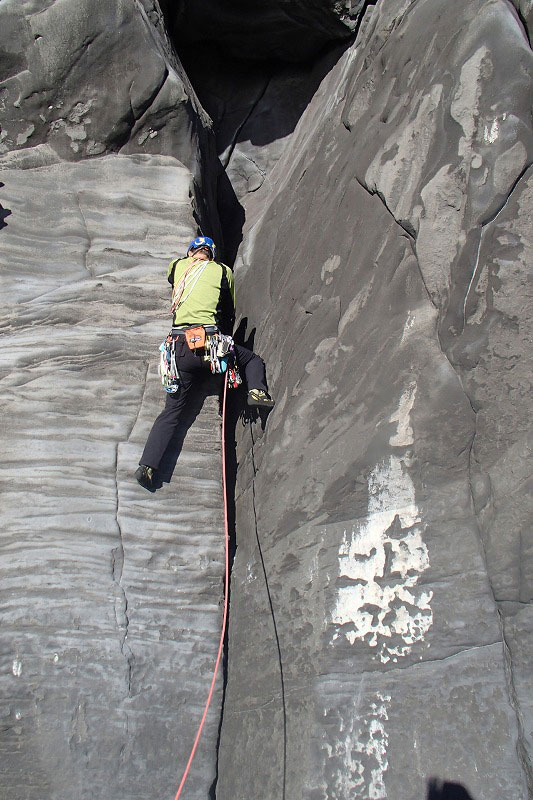 ホタテラック 5.10b/c 構成多岐なムーブが上下にあると魅惑のトラッドでは紹介されている。3テンションで前半の核心が通過できた。上部のフレークとフェースはガバがあり行けそうだったが、すでに手の保持力が落ちていてテンション。断念した。これも次回の課題だ。 前半のクラックはハンドジャムが1回だけ使える。その上はフィンガーをどう使うか。フェースを使ったりして何度かやっているうちに身体を上げられた。どうやったか思い出せないが、ムーブガ決まったのだろう。 毘沙門天 5.9+ 出口が核心。ハングを右から巻くが、かなり悪い。全階ナッツを回収できなかったが、やはりまだ残っていた。 |
