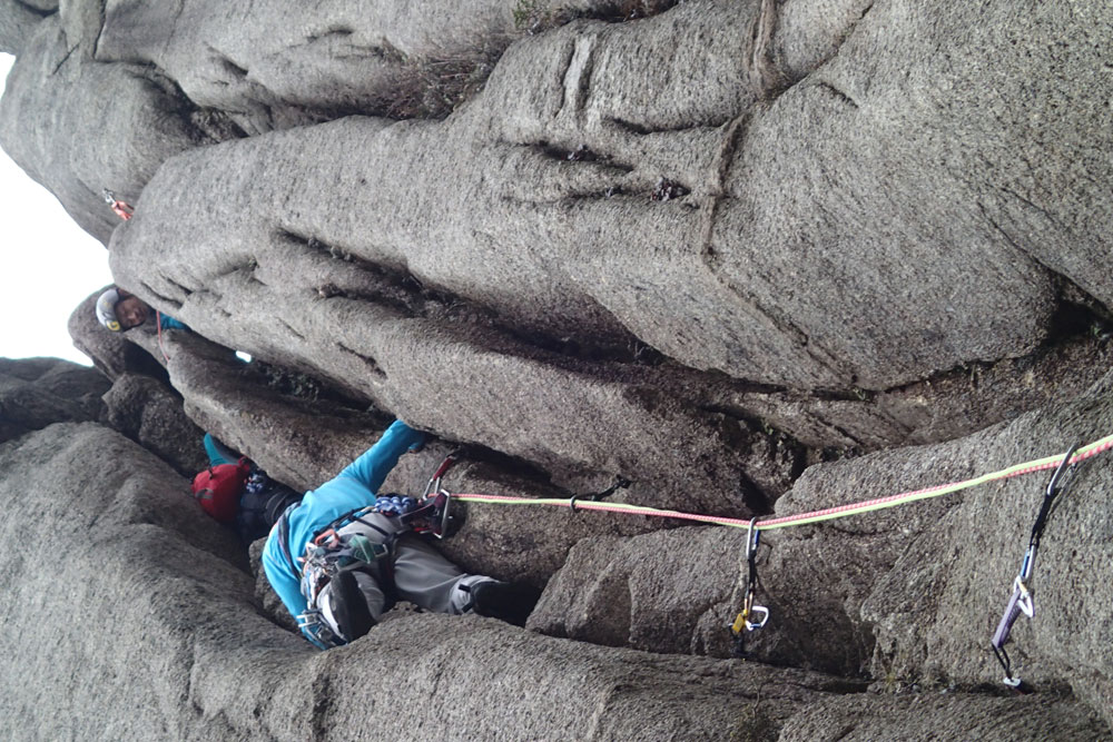 P4(中尾根) 5.7 中間部分の核心は中に入ると苦しくなる。テラスでピッチを切って、上部はかぶり気味になっている。内面登攀に入るとザックが邪魔になる。 P3(中尾根) 5.7 ワイドクラックの中を登るが、上部の核心でいつ外に出るかで苦しくなったり楽になったり。 |