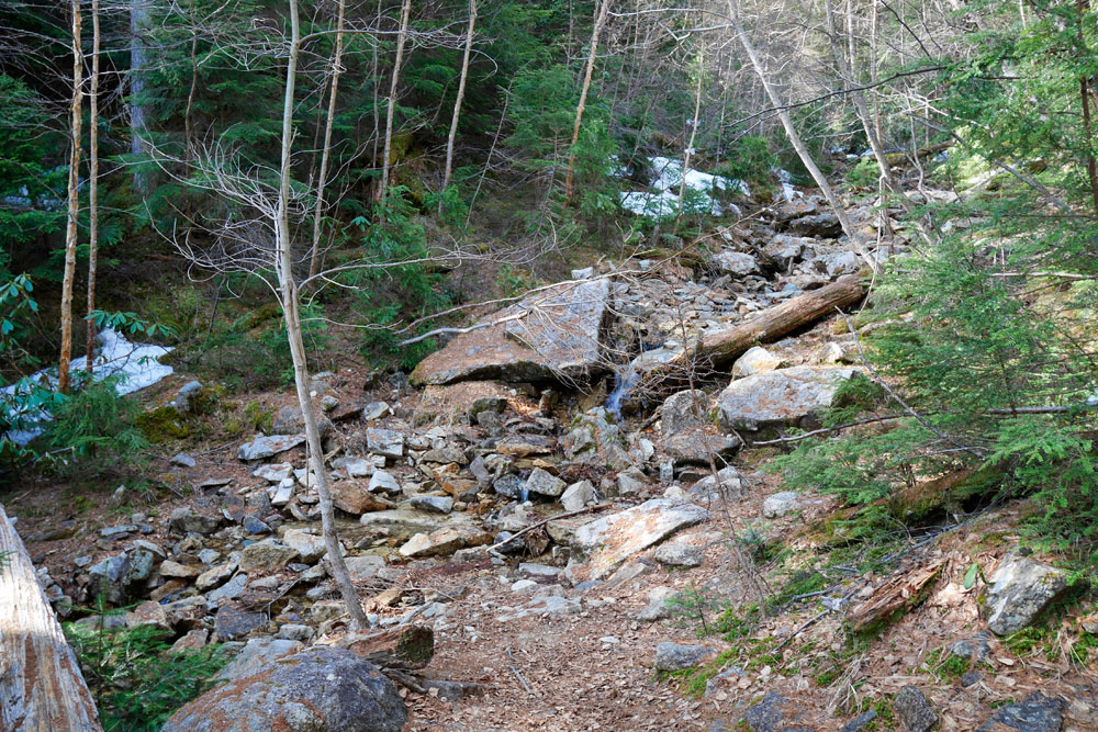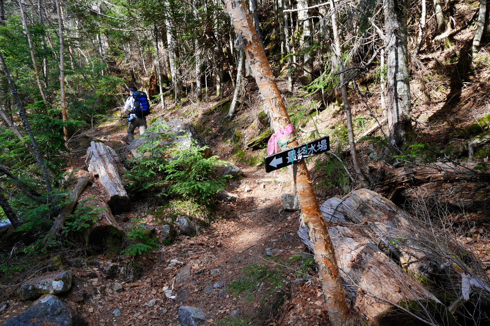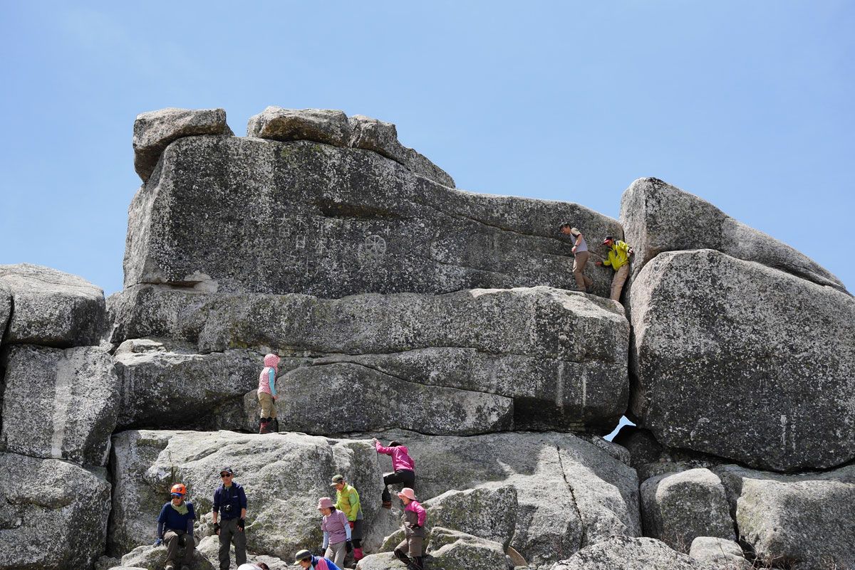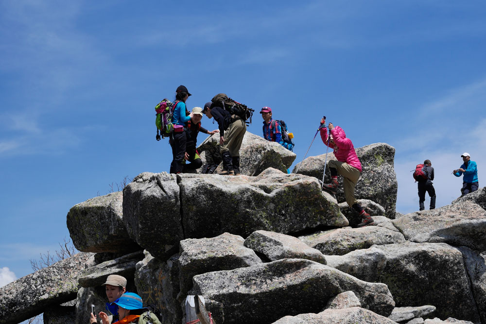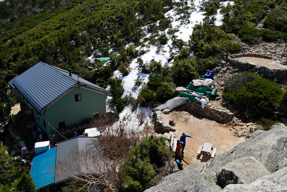 | ページ1 | ページ2 | プロローグ 初日のクライミングが充実したので二日目は歩きに切り替えた。山の楽しみ方は多様だ。クライミングと歩きの基本をしっかりとこなして、夏のアルパインに備えたい。奥秩父へはクライミングで良く通っているが瑞籬山も金峰山も小川山もピークを踏んでいないので、とりあえず金峰山へ行くことにした。 林道 金峰山は百名山に名を連ね人気の山岳だが、廻り目平からの登山者は少ないようだ。この日は我々を含め数パーティーだった。朝食を済ませ出発したのは6時を過ぎていた。今日も天気が良く清々しい朝だ。初見のルートなのですべてが真新しい。石俣沢に沿った林道を気持ちよく歩いて林道の終点へ。 八丁平分岐 林道を1時間20分歩き終点に到着。ここで八丁平へ分岐する。ここから山道に入り少し歩くと最終の水場があった。このあたりから傾斜がきつくなり一気に高度を上げていく。コメツガやトウヒなどの針葉樹林は陽射しを避けてくれるので涼しくて気持ちがいい。 2000mまで高度を上げてくると残雪があった。凍り付いているところもあれば踏み抜くところもあり歩きにくかった。途中に2度ほど休憩を挟みちょうど2時間で金峰山小屋に到着した。黒のレトリバーが出迎えてくれた。小屋の裏手の大きな岩に登ると展望が良かった。 小屋から山頂へは直登すれば20分ほどだが、周回コースがあるのでそれを行くことにした。まずはトラバース道から稜線をめざす。このトラバース道、雪があって歩きにくかった。稜線に出ると多くの登山者と行き交った。登山者の大半は八丁平からのようだ。 稜線に出ると森林限界になり、ハイマツ帯は遮るものがなく展望がいいが、高山のために息が切れる。分岐から少し八丁平方面に下ってから山頂を目指した。やはりこちらのコースの方が稜線コースで展望がいい。 五丈岩 11時に山頂に到着した。山頂よりも五丈岩の方が存在感があった。実に展望の良いところだ。五丈岩は地元神社の御神体だそうだ。うさぎが登攀を試みるがリーチがなく断念。私が登りスリングで引き上げた。東に秩父の山々、西に八ヶ岳や北アルプスが一望できた。 | ページ1 | ページ2 | |