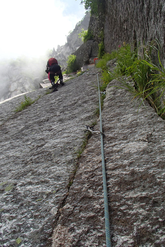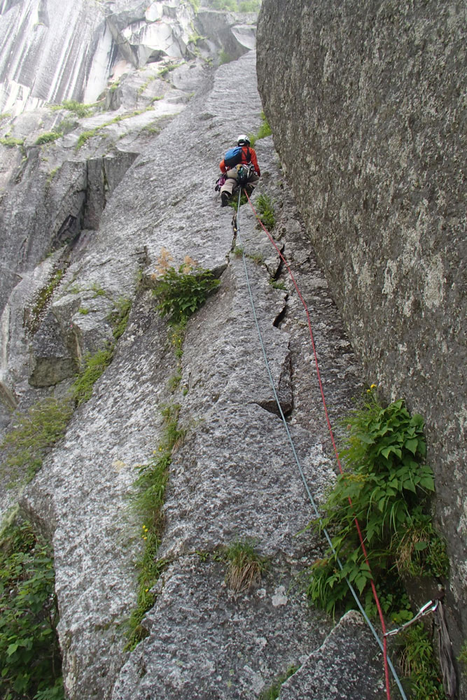 登攀アプローチ 4時過ぎには自然と目が覚めるだろうと高をくくっていたら、目が覚めて時計を見ると、なんと5時前になっていた。朝寝坊してしまった。夜半過ぎから虫の攻撃もなくなり、ぐっすりと寝込んでしまったようだ。これ以上遅くなりとヘッデン帰還になってしまうので、それだけは避けたい。慌てて準備して5時15分にスタートした。 8合目岩小屋出発 ちょっと朝寝坊して主発が5時15分になった。我々の実力からすると日没までのぎりぎりの時間であったことが後でわかった。岩小屋から踏み跡を頼りに下降していく。ダイヤモンドの頭の岩小屋(赤蜘蛛ルートの終了点)まで下り、その手前で七丈沢に沿って下っていく。この間にも岩場がいくつかありフィックスロープが張られている。泊まれそうな岩屋もあった。 段差にはフィックスロープがあるが、それでもやばそうな所は懸垂用のフィックスがあったので2回ほど懸垂下降した。最後は尾根を回り込んで草付斜面に出た。メタカラコウが群生していた。他にはシモツケソウやタカネビランジが花を咲かせていた。さて、取り付きはもう一段下のようだが、草が茂って踏み跡がハッキリしない。フィックスロープを見つけルートがわかった。これを下りると赤蜘蛛ルートの取り付ポイントがあった。 夏場なので草が茂り、踏み跡を見失ったりしたので、下降に1時間50分を要した。取り付きからは岩壁の全容は見えないが、被さってくるような岩壁に威圧感を感じる。南面だがルートは日陰になっているようで助かる。直射日光の照りつけられると、水の消費量も多くなり体力も消耗する。登攀では少しでも重量を軽くしたいので水は1リットルしか準備していなかった。岩場を登りきるのに10時以上はかかるのでこの2本でやりくりする必要がある。 さて、ギア類だが、ヌンチャク20本+カムは#3まで1セット+中間カムを1セット+ナッツ+アブミ+スリング類7本+捨てロープ6m+ザック(水1リットル、カメラ、雨具、行動食、靴はたくさんいもってもらった)。ギアを身につけザックを担ぐとずっしりと重い。これで2本のロープを引っ張る。重労働だ。身体は重いが気持はすでに戦闘モードになっていて軽く、先ほどまで感じていた心配や不安消え去った。よしいくぞ。300mの垂直の岩壁に挑む。 1ピッチ目 「25mA1 50cmのハングから垂壁」(登坂開始7:30 ビレイ8:10) 1ピッチ目は垂壁の人工登攀でいきなり出だしが核心。トポ通り50cmのハングになっている。2本目ハーケンが遠い。3段目にA3で立ち上がったが届かない。アブミ2段目で巻き込みで立ち上がるのが正解のようだが、バランスが悪くて怖い。石が積まれていてそれに載ったら届いた。いきなりちょんぼ。 離陸が成功するとあとは単調なアブミの掛け替えだ。ただしボルト間隔が遠く、アブミの一番上に僅かなホールドを頼りに立つこともあった。これは怖い。バランスを崩すと真っ逆さまに落ちることになる。 登攀の順番は、私がリードし、うさぎがセカンドで、最後にたくさんがギアを回収しながら登る。ギアの回収も大変で、リードは登るにつれ徐々に軽くなるが、回収は徐々に重くなっていく。