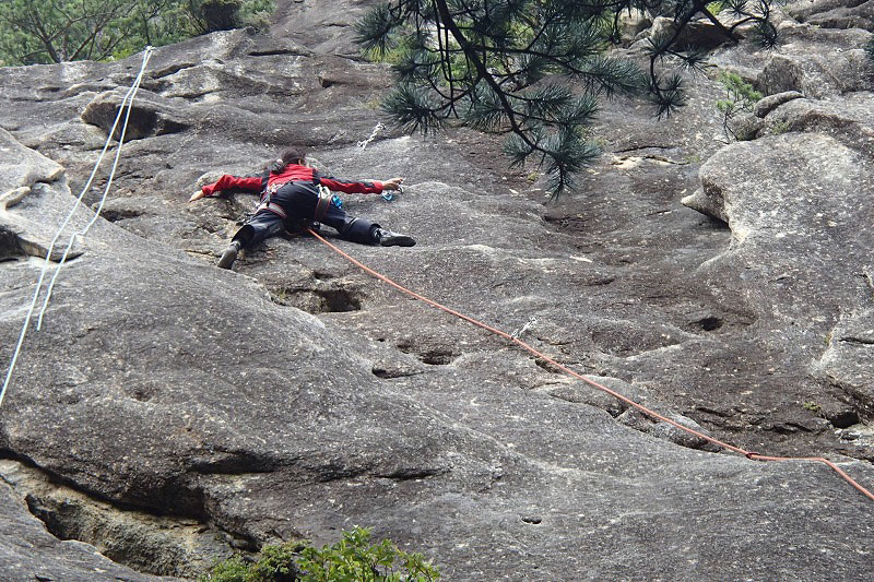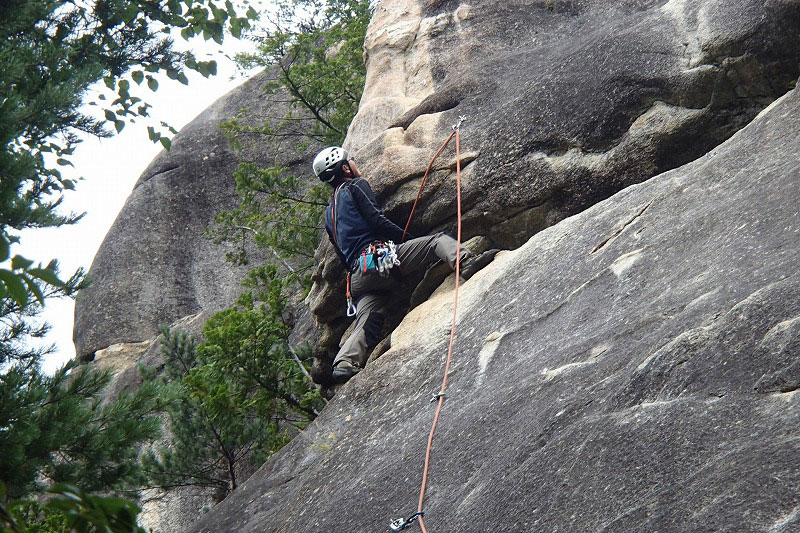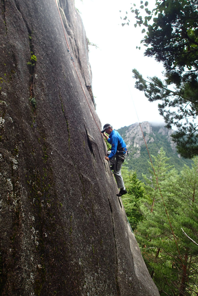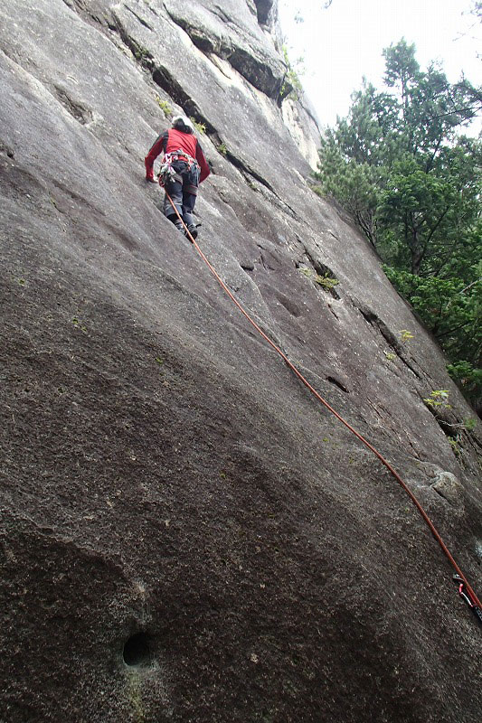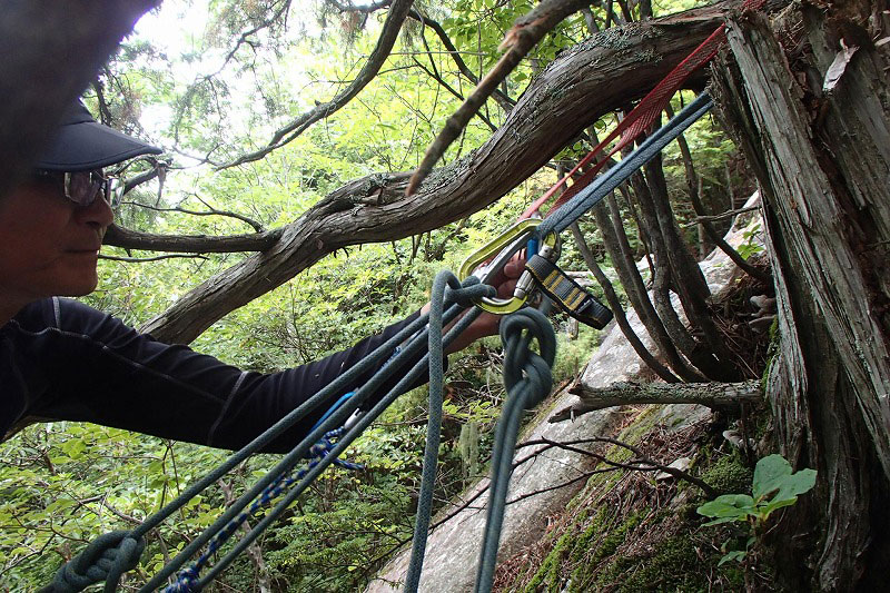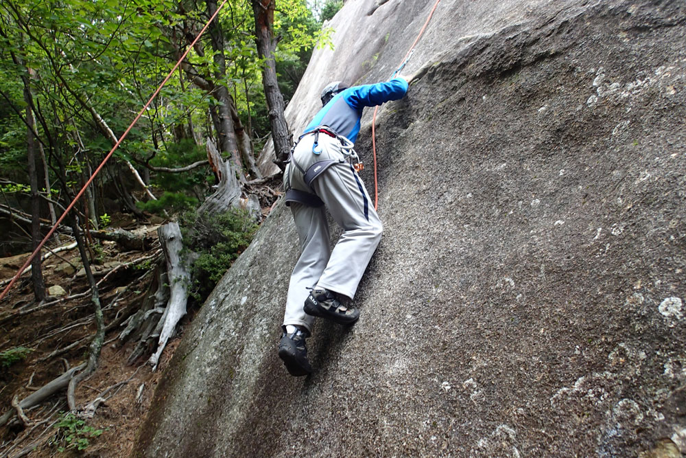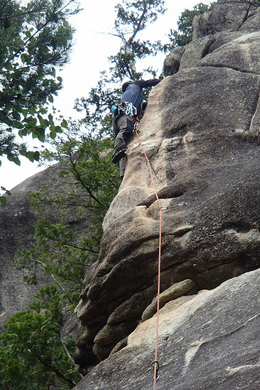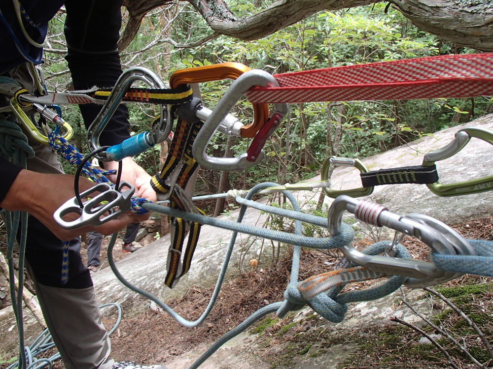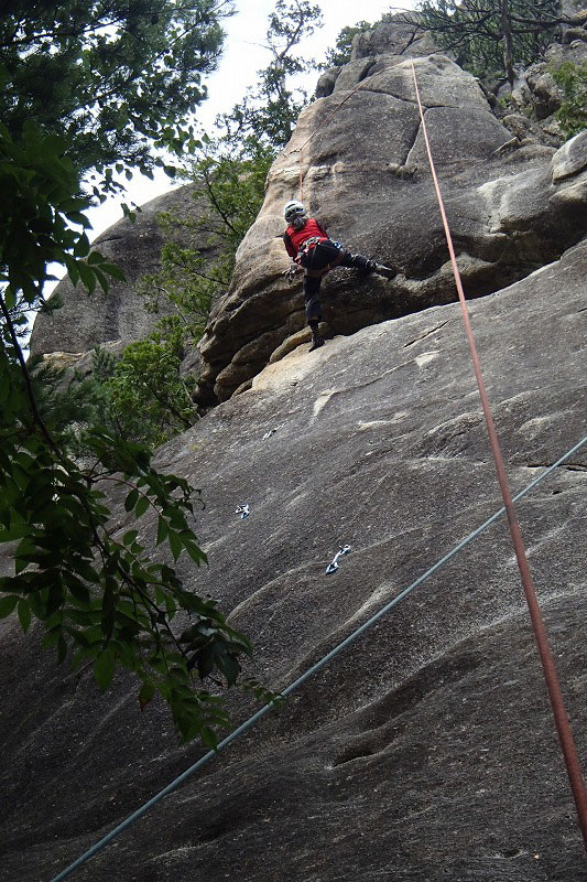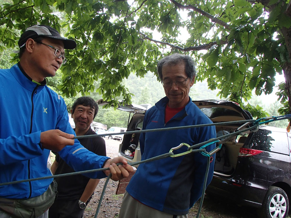 プロローグ 二日連続の瑞籬のマルチは疲れるので二日目は小川山に移動した。これは正解だった。廻り目平で車泊し、明け方からポツリポツリと雨が当たり出した。予報通り朝方に、前線が通過したようだ。天候が回復することはわかっていたが、雨が当たり出すと不安になる。 ゆっくりと朝食を済ませたがまだ雨があたっている。雨が上がるのを待つのも退屈なので、この機会にレスキューをやることにした。何度かやっているが普段は使わないのですぐに忘れてしまう。まずは駐車場でチロリアンブリッジ。 チロリアンブリッジ ロープを張って荷物などを搬送するシステム。ロープを張るのにガルダーヒッチを使ってみた。ガルダーヒッチは確保機がないときによく使う。ロープを張る原理は写真の通り。ゆるめる、しめるなどロープの張り具合を簡単に調整できる。知っていて損はない。 カウンターラッペル ここからが実践。雨が上がったので、スラブ状岩壁に移動した。登攀するにはまだ岩が濡れているので、岩が乾くまでカウンターラッペルの復習をすることにした。これは登攀中、セカンドに何らかのトラブルが発生し動けなくなったらどうするか。引き上げるか、降ろすしかない。引き上げは3分の1システムなどで引き上げられる。短いスリングしなないときはメインロープを使えばいい。システム的には難しくはない。問題は降ろす場合。 まずは要救助者の所まで懸垂下降しなければならない。 ここまでやったところで岩が乾いてきたので、クライミング開始。ガマスラブにクライマーが入ってきたので我々はマガスラブに移動。大学生が入門用のルートでやっていたが他のルートは空いていた。まずは高い窓からやることに。 高い窓5.10b ハング越えが核心のように見えるが、難しいのはその上。カンテに沿って登ってフォール。とりあえず別のルートでトップロープセット。2回目は核心で足が抜けて再びフォールしたが、再チャレンジですんなりとクリア。抜け口が少し甘いが、それ以前にしっかりと足が決まれば問題なし。ハングの越え方は皆さん色々、ほんまさんは粘って課題解決。スラブ、フェイス、ハング、カンテと色々とあっておもしろいルートだ。 オーウェンのために祈りを5.10c これも小ハングがあるが、核心は中間部の細かいフェイス。皆さん慎重に細かいホールドを拾ってクリア。 かわいい女5.8 先ほどまで大学生がわいわいとやっていたが移動したので、ほんまさん、うさぎのリード練習。最初の1ピン目が遠いので慎重に。
