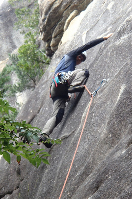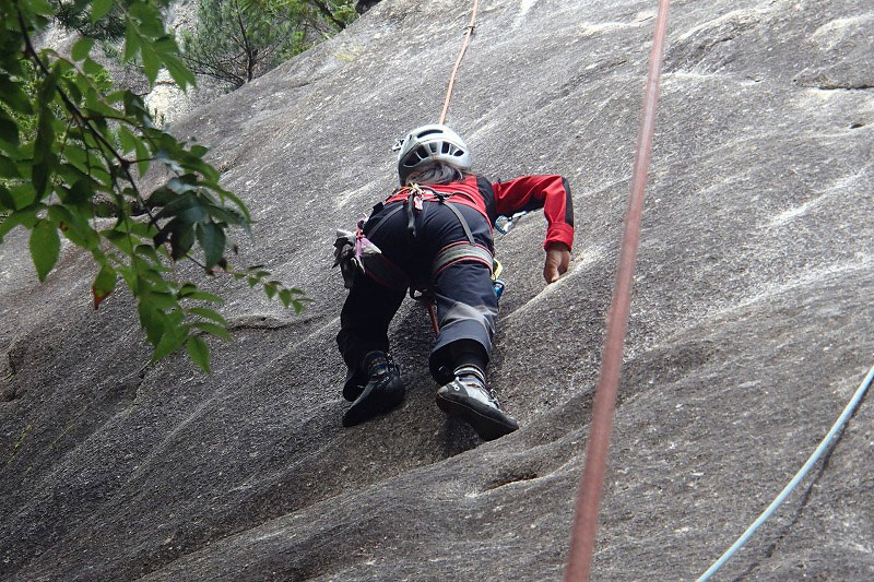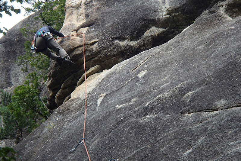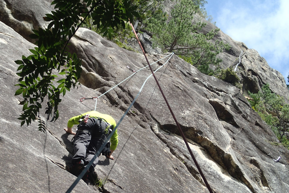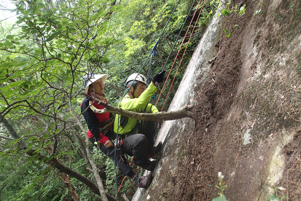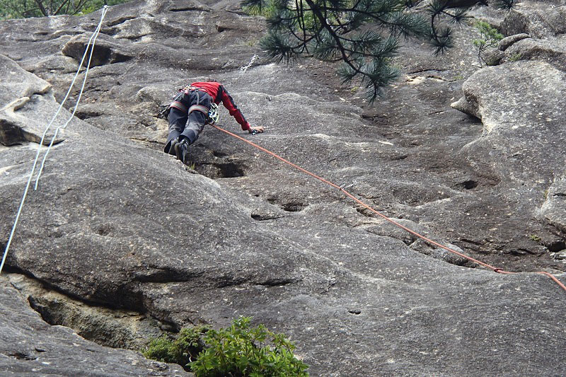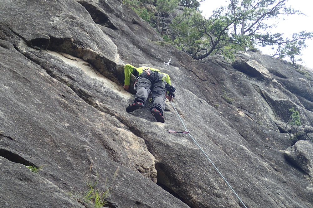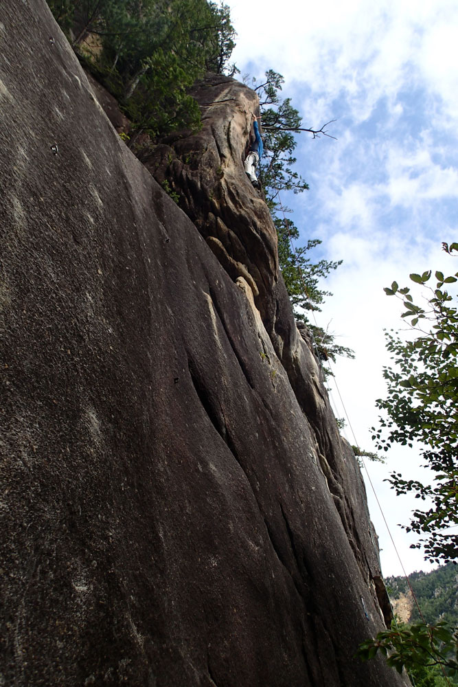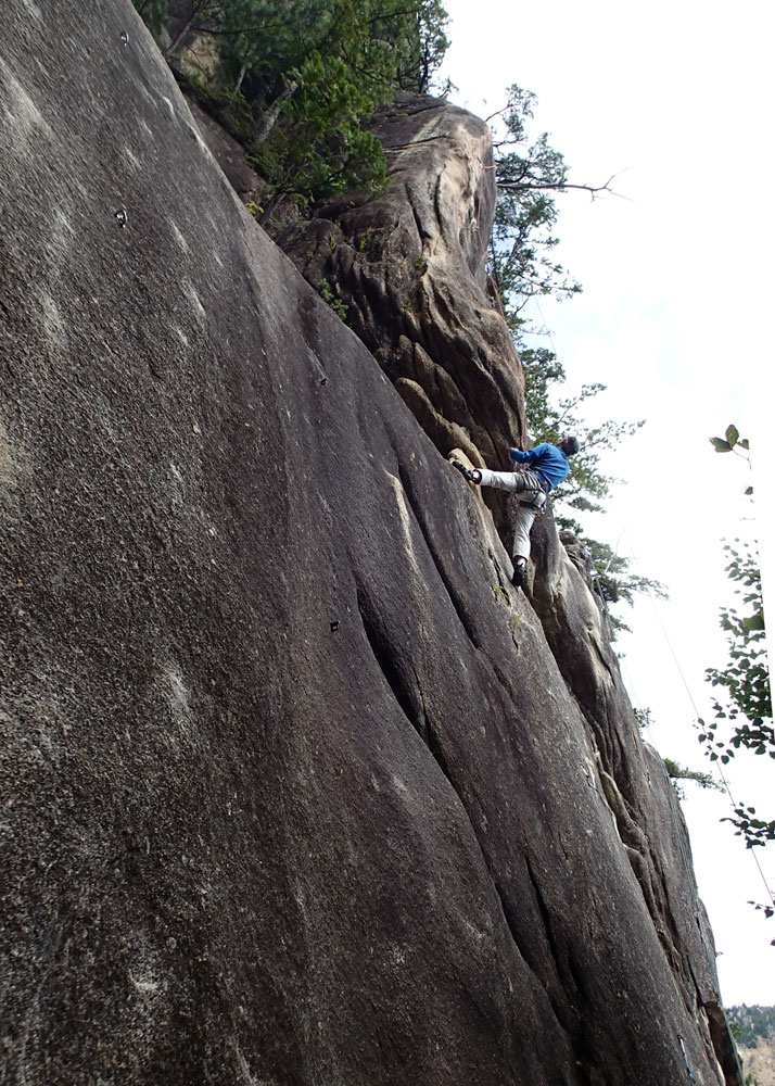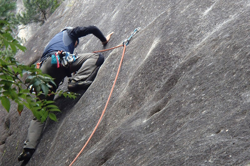プロローグ 二日連続の瑞籬のマルチは疲れるので二日目は小川山に移動した。これは正解だった。廻り目平で車泊し、明け方からポツリポツリと雨が当たり出した。予報通り朝方に、前線が通過したようだ。天候が回復することはわかっていたが、雨が当たり出すと不安になる。 ゆっくりと朝食を済ませたがまだ雨があたっている。雨が上がるのを待つのも退屈なので、この機会にレスキューをやることにした。何度かやっているが普段は使わないのですぐに忘れてしまう。まずは駐車場でチロリアンブリッジ。 チロリアンブリッジ ロープを張って荷物などを搬送するシステム。ロープを張るのにガルダーヒッチを使ってみた。ガルダーヒッチは確保機がないときによく使う。ロープを張る原理は写真の通り。ゆるめる、しめるなどロープの張り具合を簡単に調整できる。知っていて損はない。 カウンターラッペル ここからが実践。雨が上がったので、スラブ状岩壁に移動した。登攀するにはまだ岩が濡れているので、岩が乾くまでカウンターラッペルの復習をすることにした。これは登攀中、セカンドに何らかのトラブルが発生し動けなくなったらどうするか。引き上げるか、降ろすしかない。引き上げは3分の1システムなどで引き上げられる。短いスリングしなないときはメインロープを使えばいい。システム的には難しくはない。問題は降ろす場合。 まずは要救助者の所まで懸垂下降しなければならない。 ここまでやったところで岩が乾いてきたので、クライミング開始。ガマスラブにクライマーが入ってきたので我々はマガスラブに移動。大学生が入門用のルートでやっていたが他のルートは空いていた。まずは高い窓からやることに。 高い窓5.10b ハング越えが核心のように見えるが、難しいのはその上。カンテに沿って登ってフォール。とりあえず別のルートでトップロープセット。2回目は核心で足が抜けて再びフォールしたが、再チャレンジですんなりとクリア。抜け口が少し甘いが、それ以前にしっかりと足が決まれば問題なし。ハングの越え方は皆さん色々、ほんまさんは粘って課題解決。スラブ、フェイス、ハング、カンテと色々とあっておもしろいルートだ。 オーウェンのために祈りを5.10c これも小ハングがあるが、核心は中間部の細かいフェイス。皆さん慎重に細かいホールドを拾ってクリア。 かわいい女5.8 先ほどまで大学生がわいわいとやっていたが移動したので、ほんまさん、うさぎのリード練習。最初の1ピン目が遠いので慎重に。