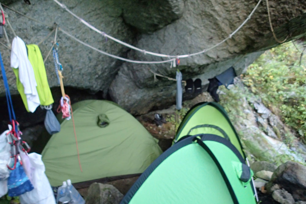 3ピッチ目 W(5.10a)、A1 40m 洞窟の左を人工で直上し、洞窟の上のスラブをトラバース。「洞くつの左から人工登攀となり、洞くつの上をトラバースして、ボルトが連打された壁を直上する。ハング下を右に出てさらに直上するとボサテラスに出る」離陸の垂壁はフリーでいけそうだが、べっとりと濡れていたので人工で離陸した。問題は洞窟上の濡れたスラブ。慎重に足を探し、じわっと体重をかけて滑りチェック。ピンがないので落ちるわけにはいかない。ビレイ中、またまた赤ロープがテンション。二匹目のマグロが釣れた。