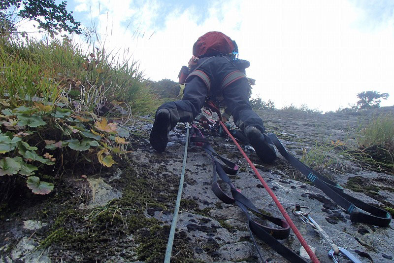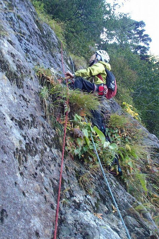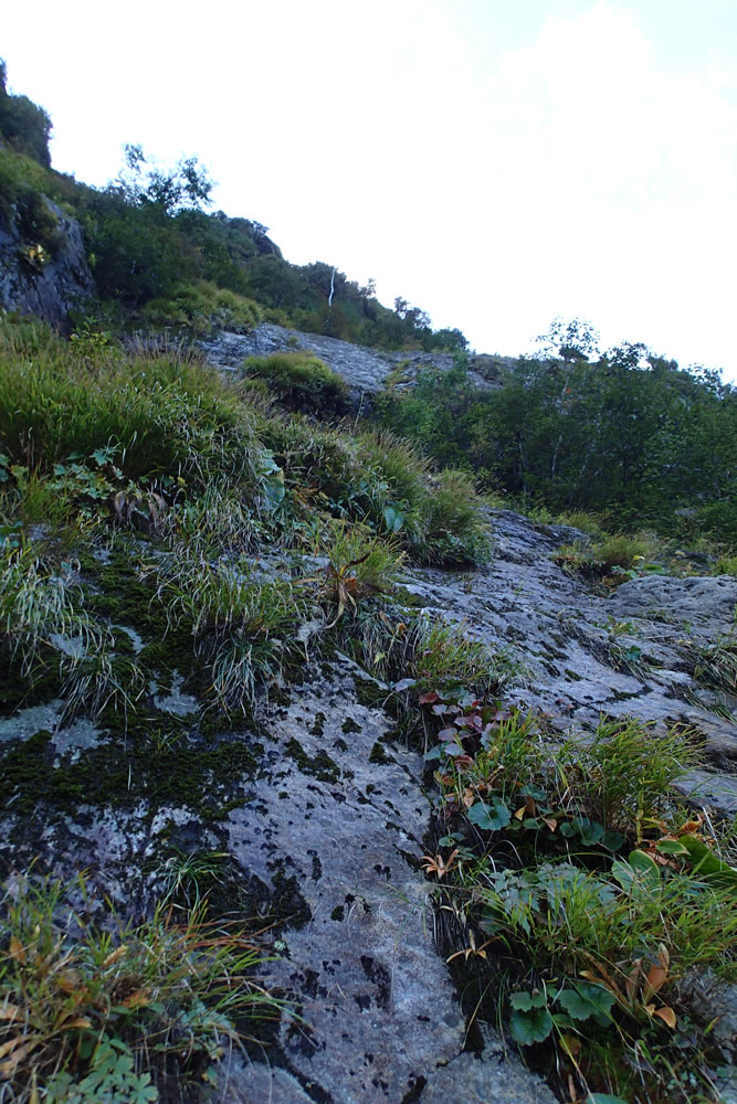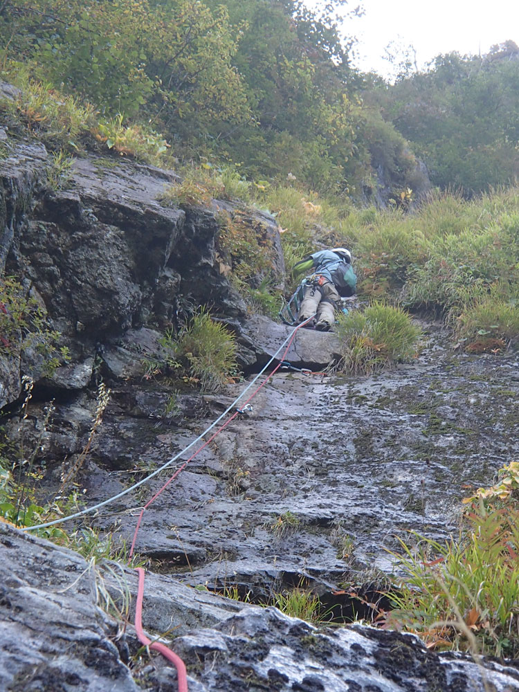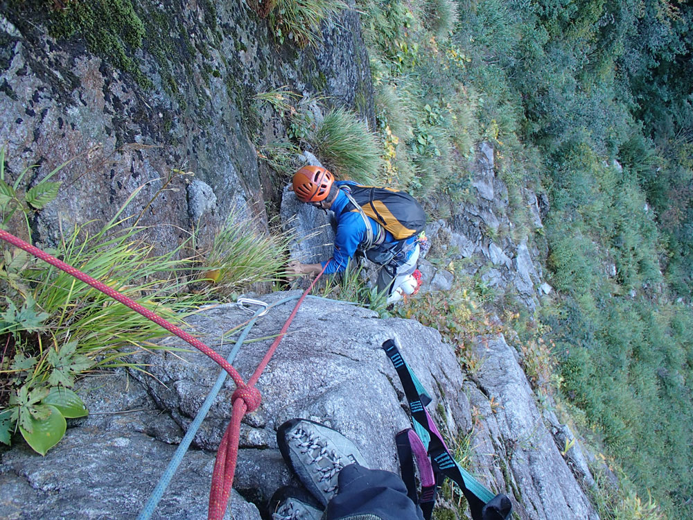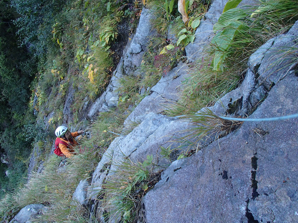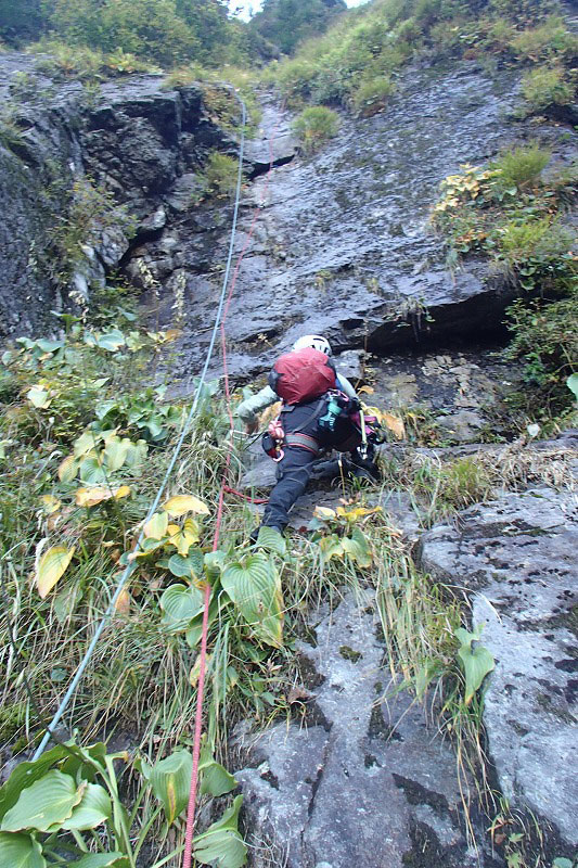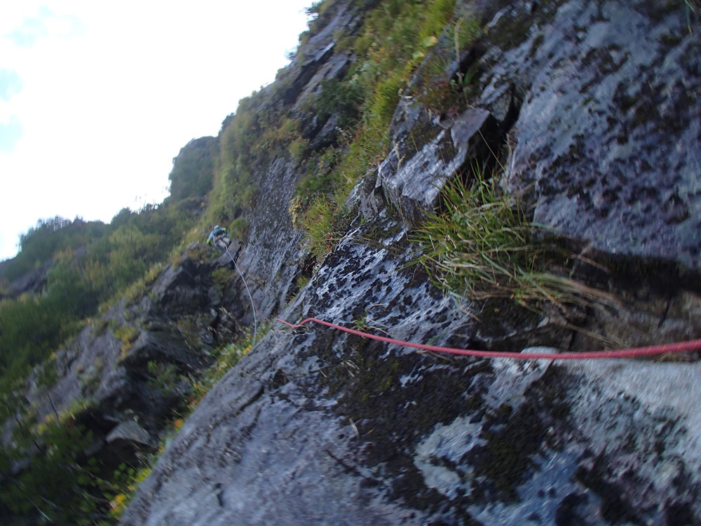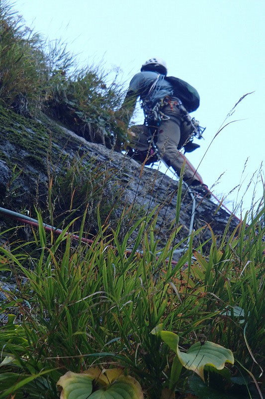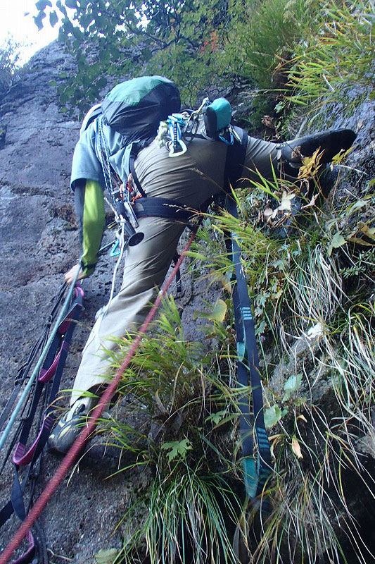 途中から乾いたスラブになり、支点を探しながらロープを延ばし、土のテラスでピッチを切った。 4ピッチ目 W 15m 易しく短いが、苔の中からホールドを探し、スラブを左上するピッチ。軽くプッシュを突破し左の垂壁でピッチを切った。スラブなので落ちたら振られる。案の定、うさぎが足を取られてずるずると落ちた。クライミングの技術より、状況にすんなりと受け入れ、柔軟に適応する力が必要だ。「左に出て、滝の右側の草付きを登る。滝上から上部にジェードルが開けているが、濡れているときは悪い」 |
