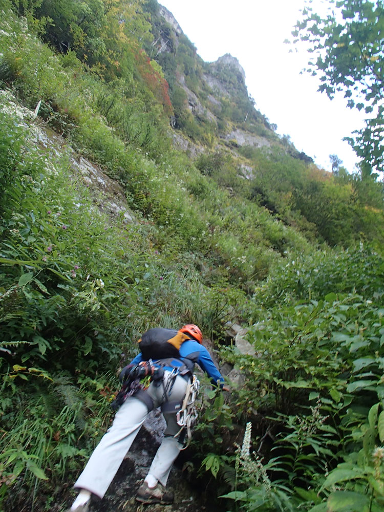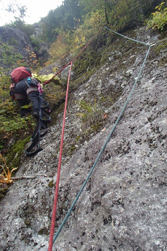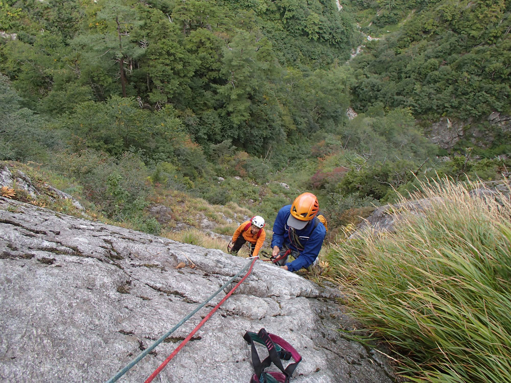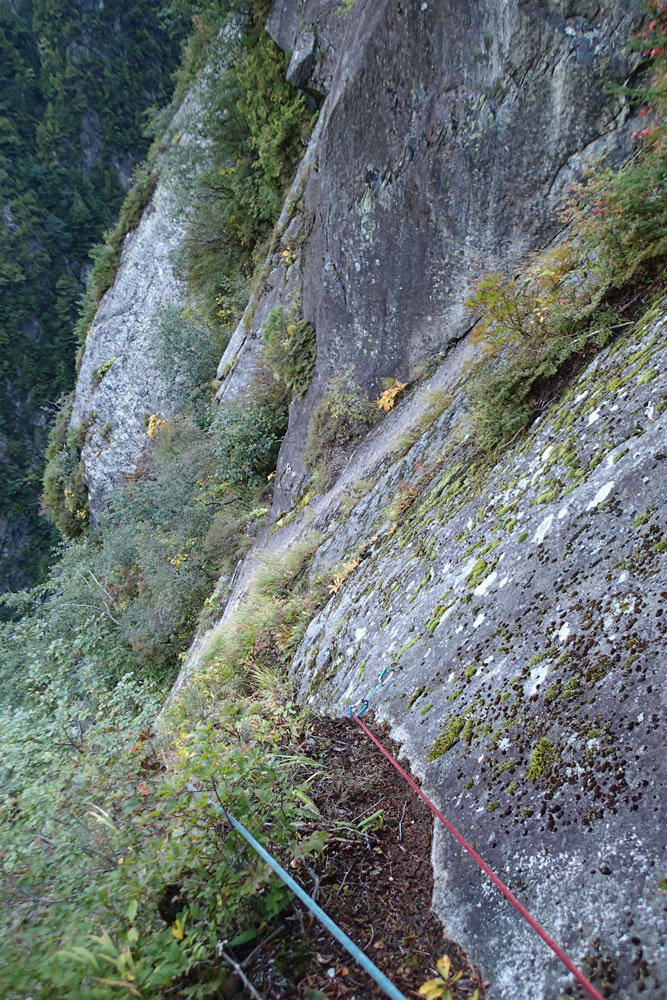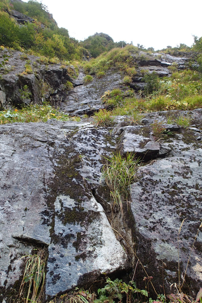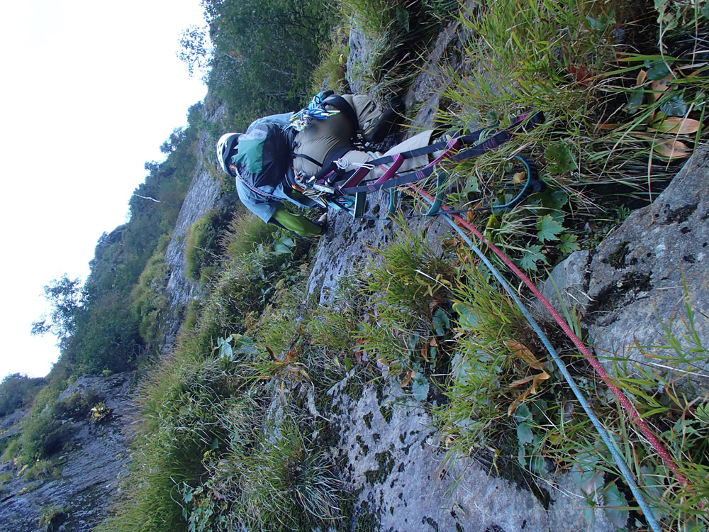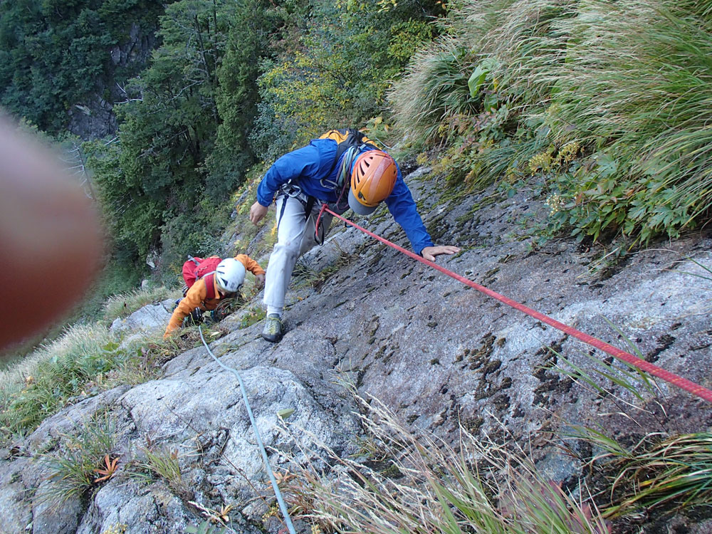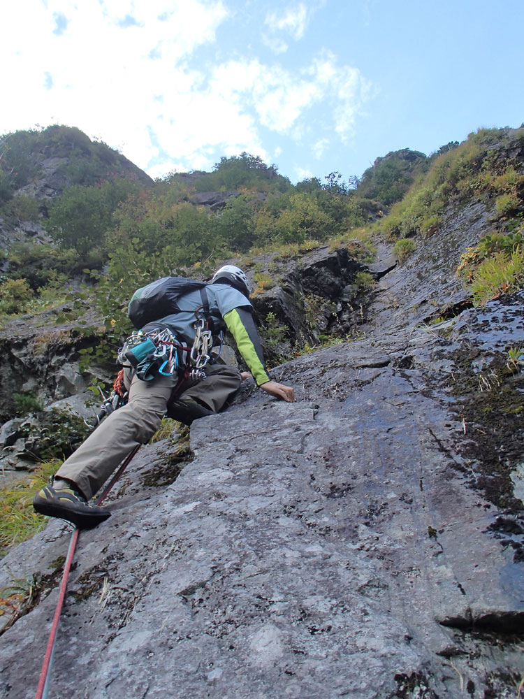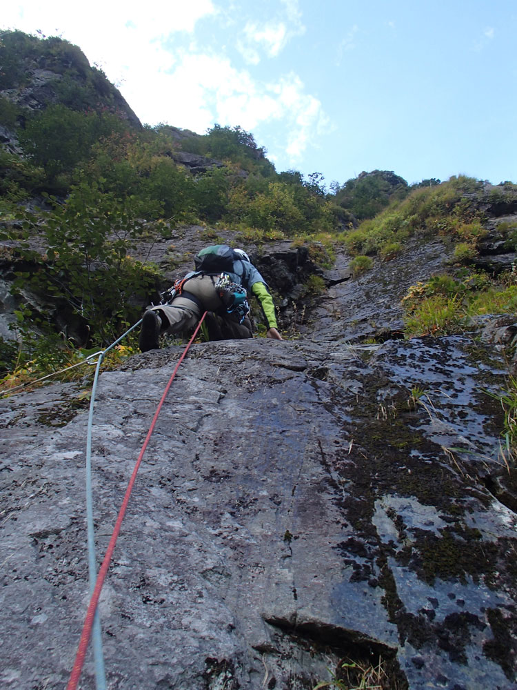 途中から乾いたスラブになり、支点を探しながらロープを延ばし、土のテラスでピッチを切った。 4ピッチ目 W 15m 易しく短いが、苔の中からホールドを探し、スラブを左上するピッチ。軽くプッシュを突破し左の垂壁でピッチを切った。スラブなので落ちたら振られる。案の定、うさぎが足を取られてずるずると落ちた。クライミングの技術より、状況にすんなりと受け入れ、柔軟に適応する力が必要だ。「左に出て、滝の右側の草付きを登る。滝上から上部にジェードルが開けているが、濡れているときは悪い」 |