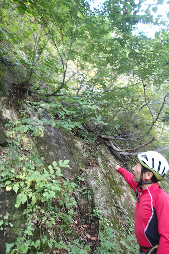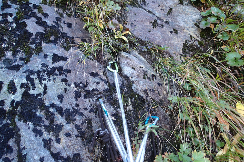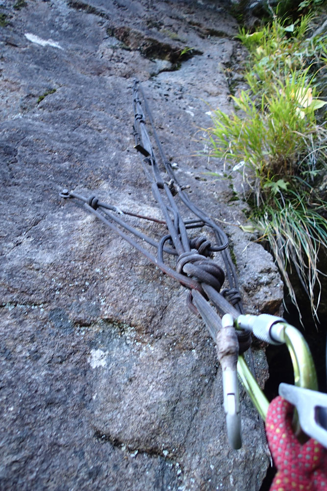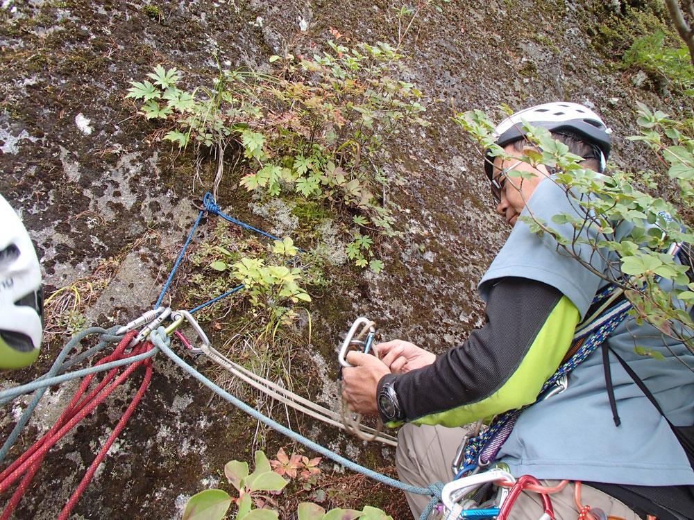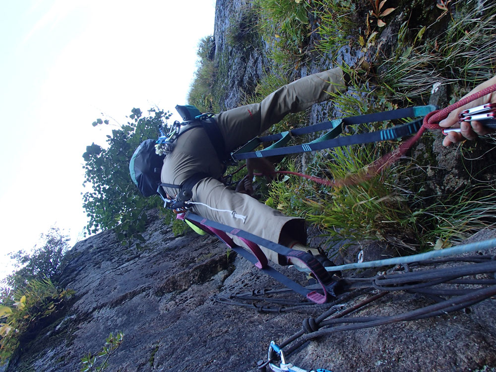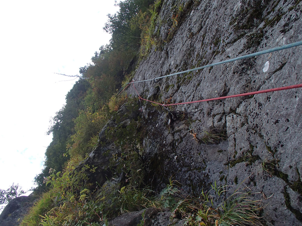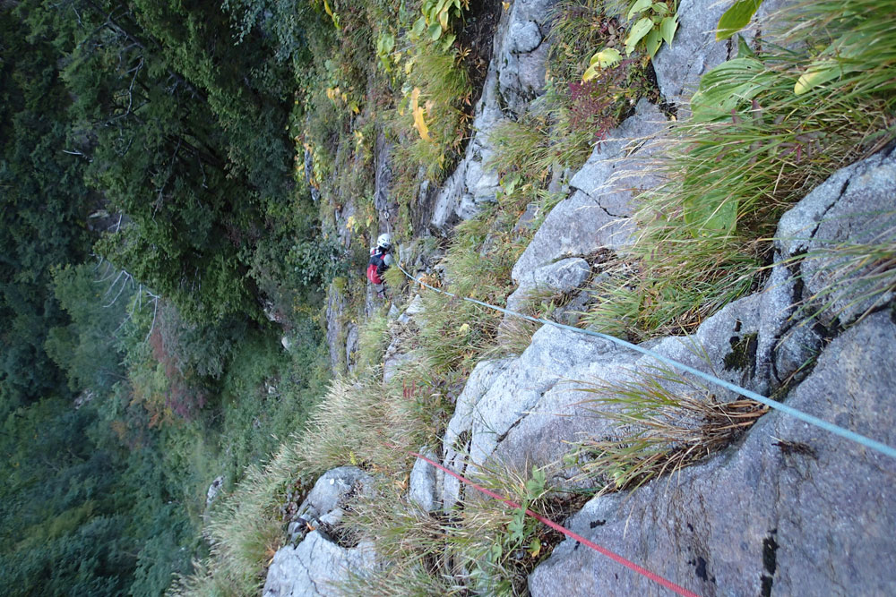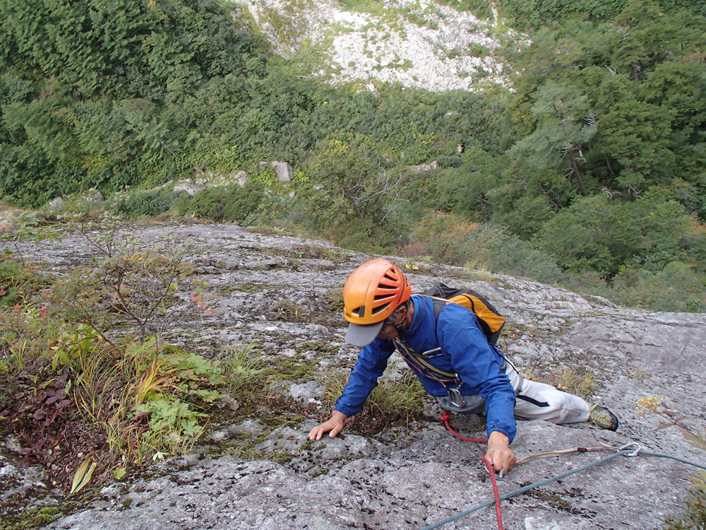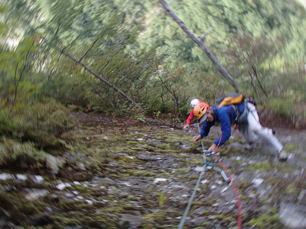途中から乾いたスラブになり、支点を探しながらロープを延ばし、土のテラスでピッチを切った。 4ピッチ目 W 15m 易しく短いが、苔の中からホールドを探し、スラブを左上するピッチ。軽くプッシュを突破し左の垂壁でピッチを切った。スラブなので落ちたら振られる。案の定、うさぎが足を取られてずるずると落ちた。クライミングの技術より、状況にすんなりと受け入れ、柔軟に適応する力が必要だ。「左に出て、滝の右側の草付きを登る。滝上から上部にジェードルが開けているが、濡れているときは悪い」 |