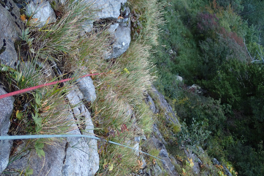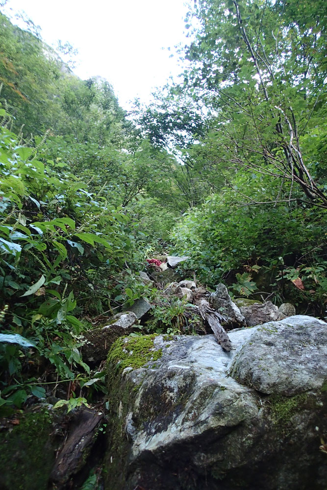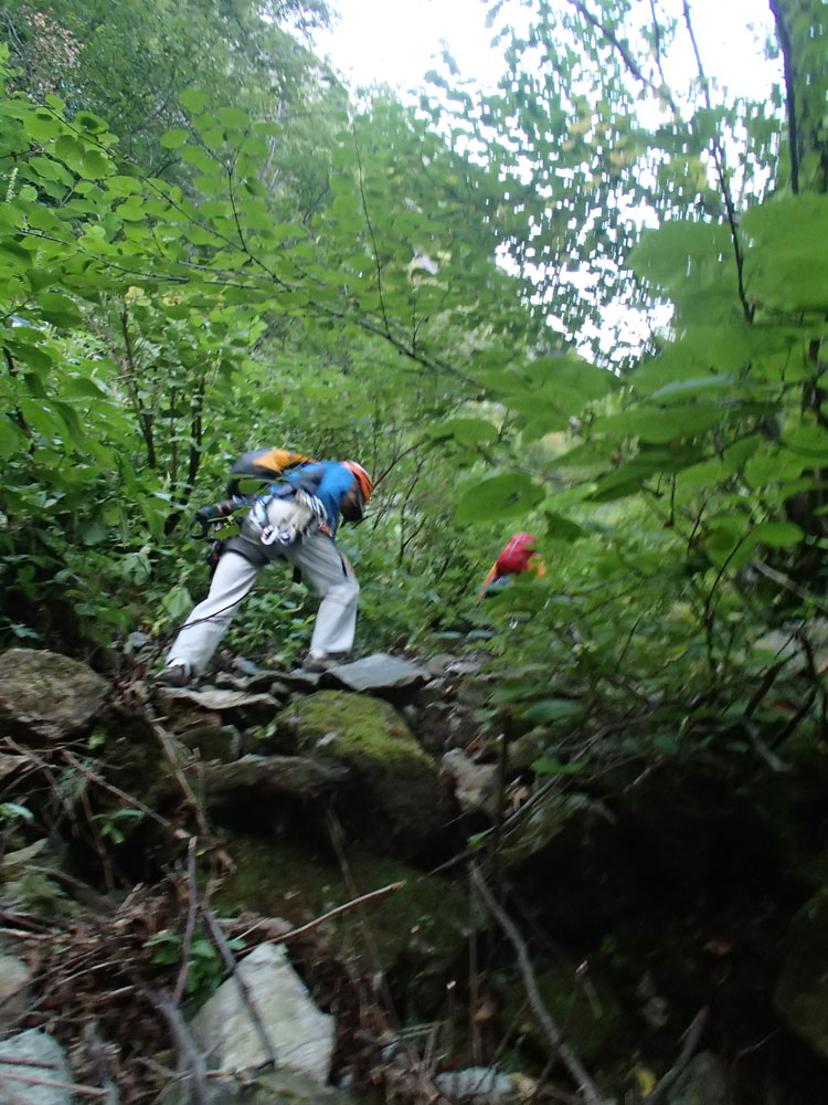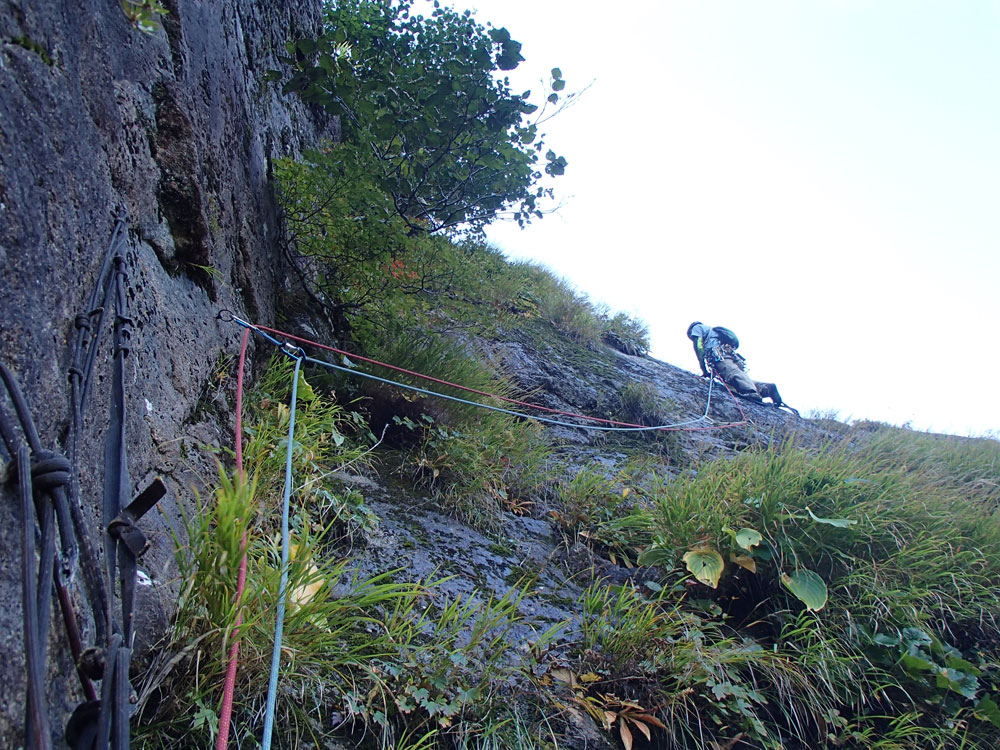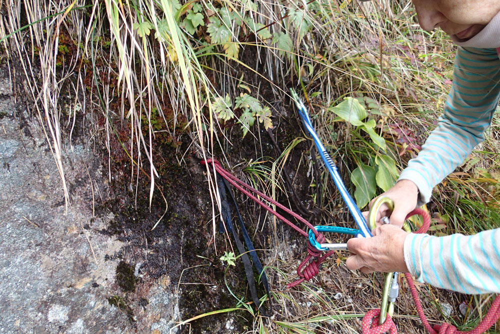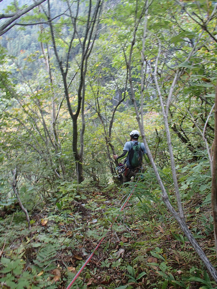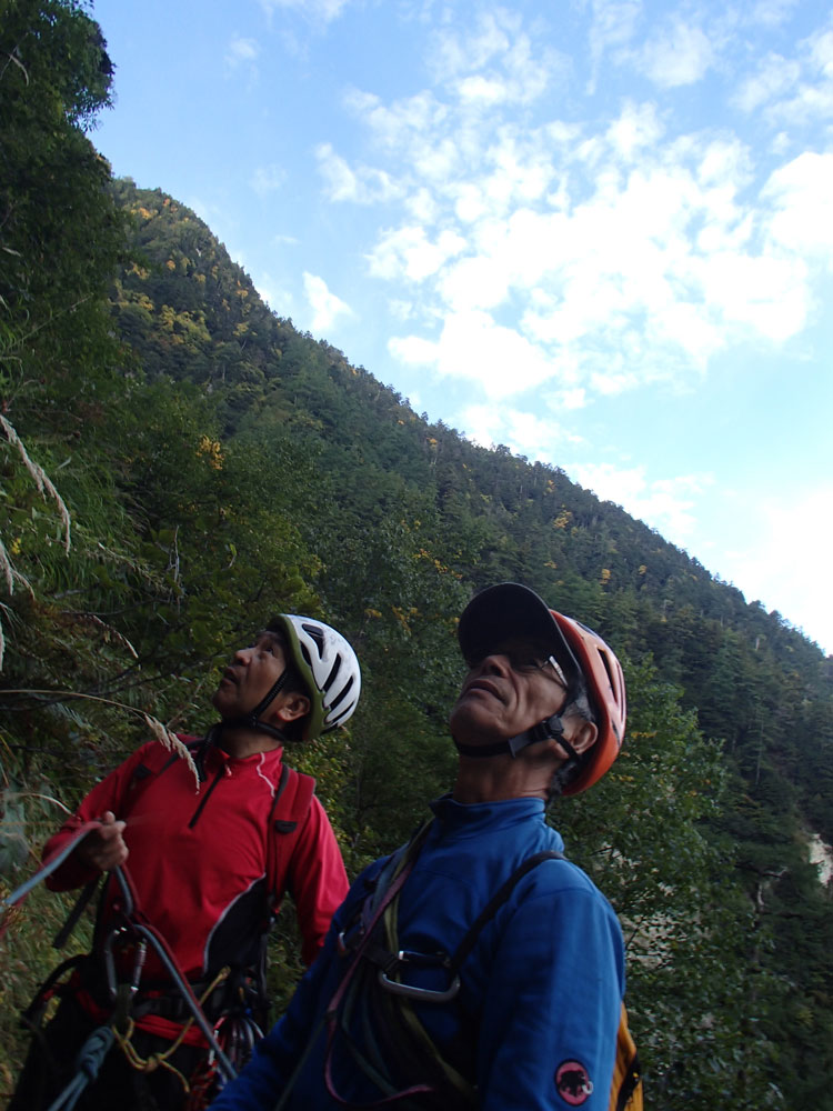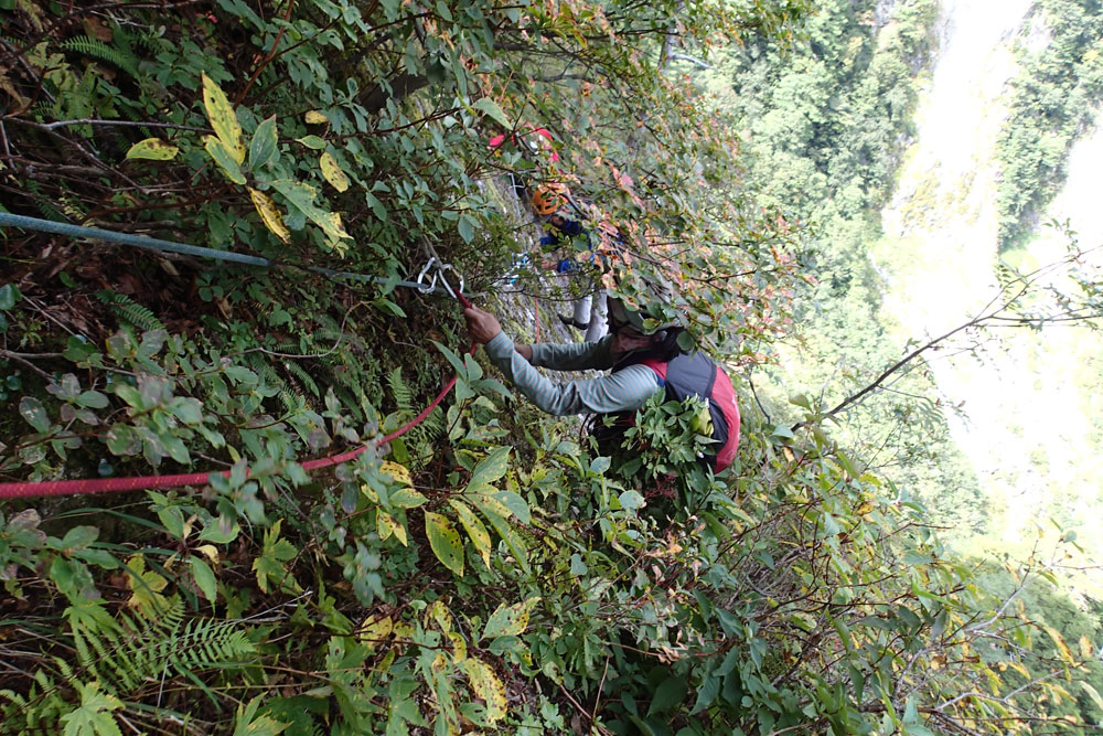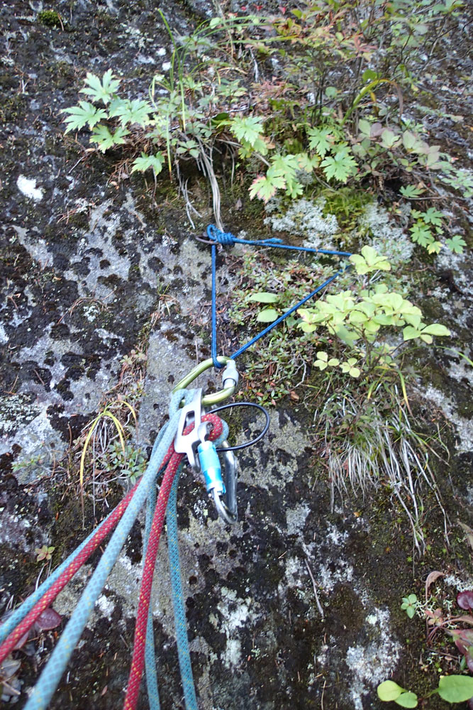 途中から乾いたスラブになり、支点を探しながらロープを延ばし、土のテラスでピッチを切った。 4ピッチ目 W 15m 易しく短いが、苔の中からホールドを探し、スラブを左上するピッチ。軽くプッシュを突破し左の垂壁でピッチを切った。スラブなので落ちたら振られる。案の定、うさぎが足を取られてずるずると落ちた。クライミングの技術より、状況にすんなりと受け入れ、柔軟に適応する力が必要だ。「左に出て、滝の右側の草付きを登る。滝上から上部にジェードルが開けているが、濡れているときは悪い」 |