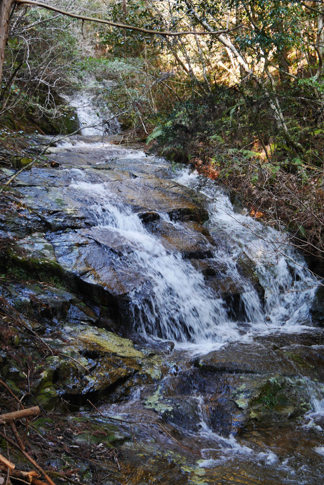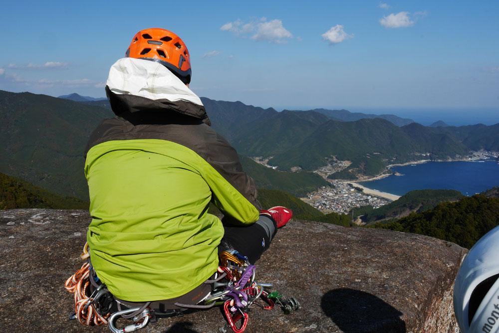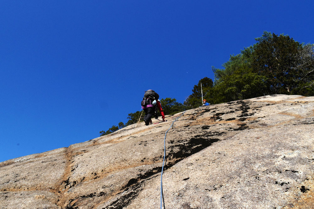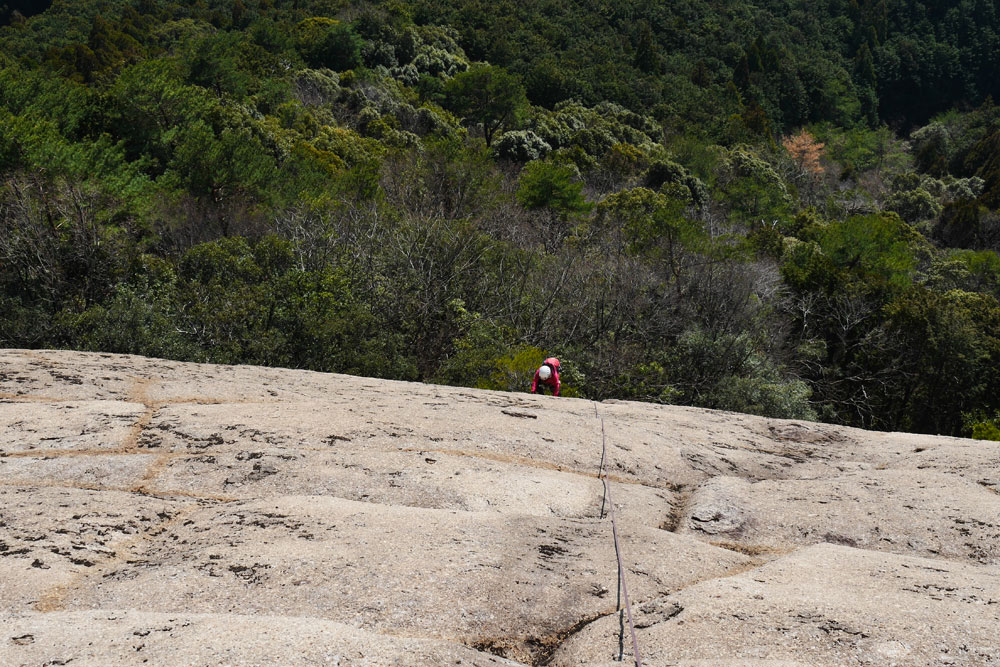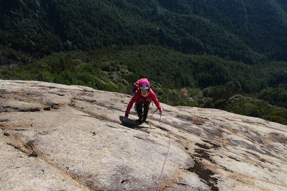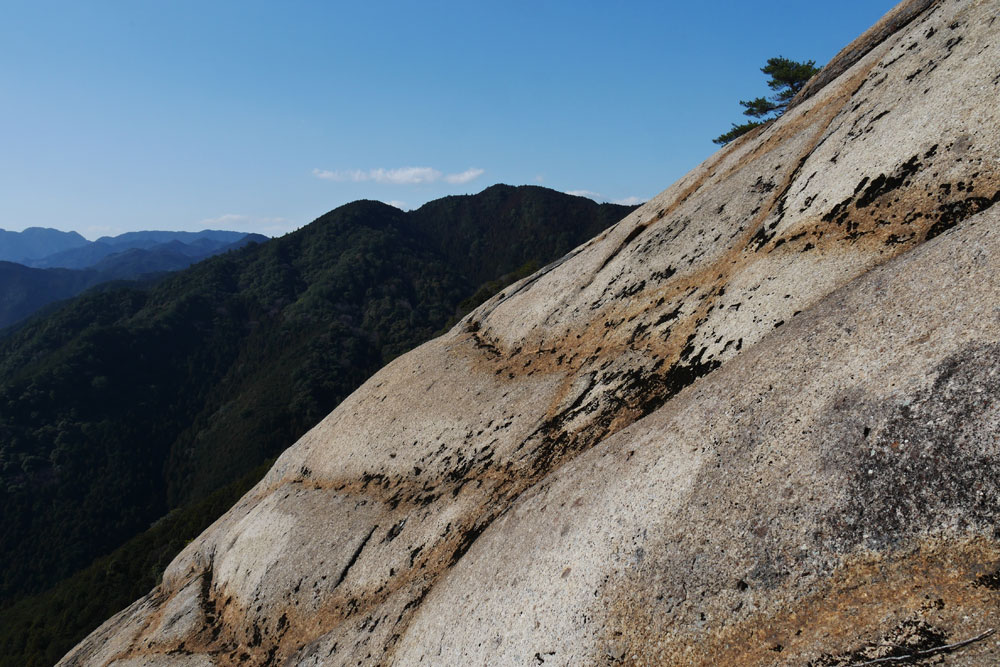 第1スラブ 4ピッチ ノーハンド 4ピッチ目は歩いても行けるほど傾斜が緩み、安堵感に続いて徐々に充実感が湧いてくる。終了点は樹林帯まで20m位の所に設けられている。開拓時にロープgあ足りなかったのか。歩いても行けるが、念のために確保した。 終了点も展望はいいが、もっと景色のいい烏帽子岩まで登ってから休憩にした。 烏帽子岩 烏帽子岩は岩壁から10程登ったところだ。今回は4回目だが目印もあり、踏み跡もしっかりとしていた。 下山 烏帽子岩からは一般登山道がある。ガイドブックに紹介するまでは、踏み跡も薄かったが、最近では良く歩かれているようで、ルートもはっきりとしている。この日は谷の水量が多く、きれいナメを見ながら下った。 50分くらいで駐車場に到着。さて買い物ツアーだ。まずは有馬のJAでミカンと野菜を調達。尾鷲まで戻って、おととで魚を調達。最後は紀北町の始神テラスでうろちょと、地元の大いに貢献した一日だった。